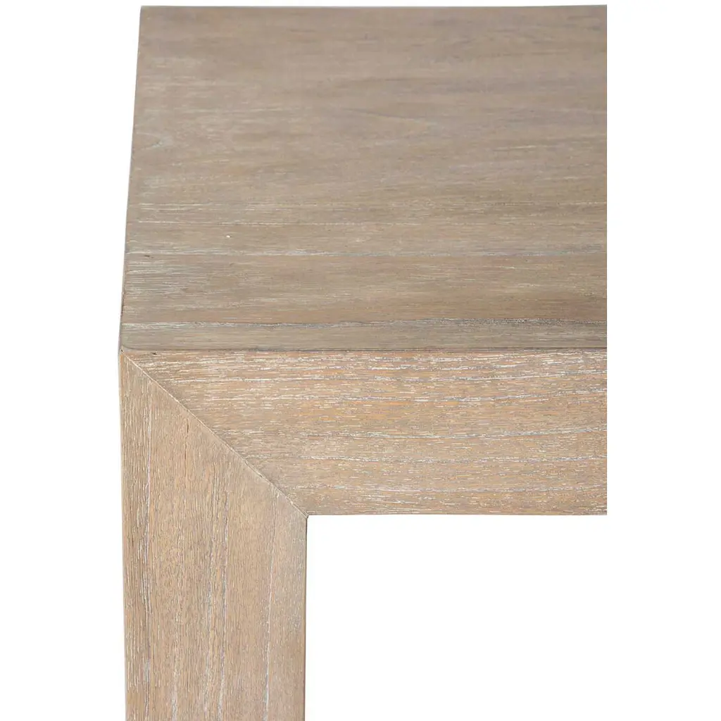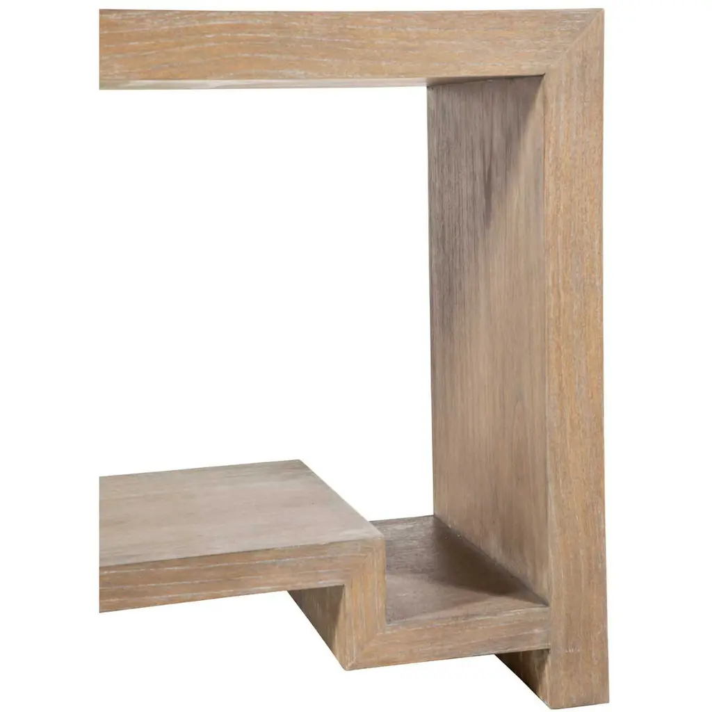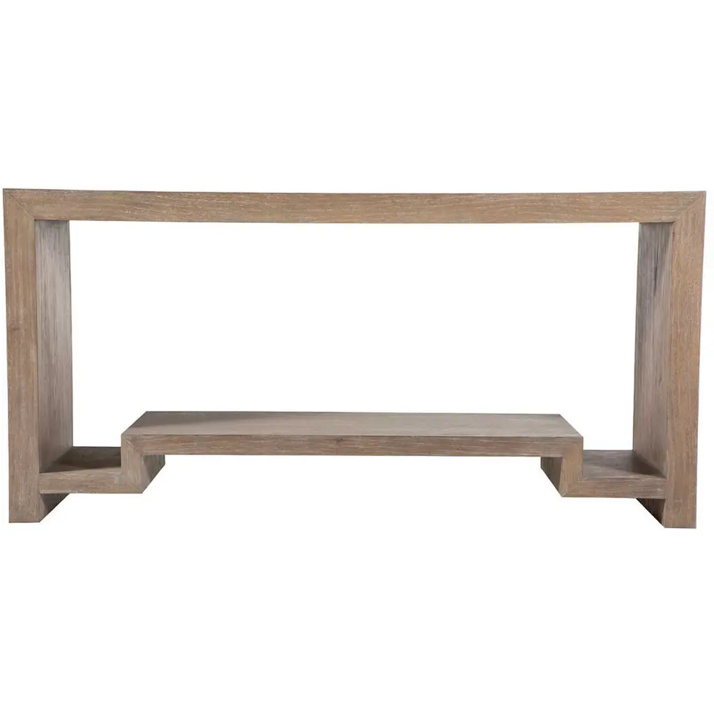The Emerson Console Table is a modern console with a unique, minimalist design. Crafted by hand of natural mindi wood and finished in a cerused plateau brown, the console has an expansive top perfect for displaying your favorite decor. Underneath, a mod waterfall-stepped shelf offers abundant storage space. The tall and open shelves allow objects of height to also have a home. The cerused plateau brown finish complements a variety of styles including beachy and midtown decors.