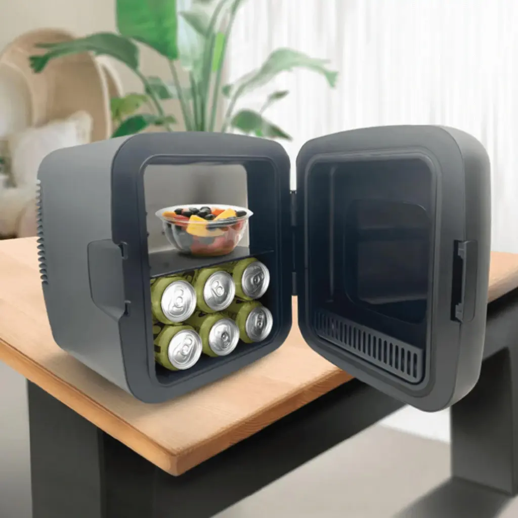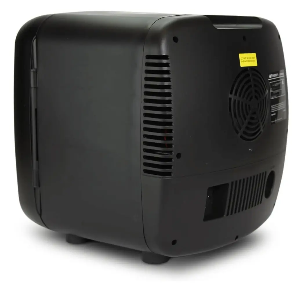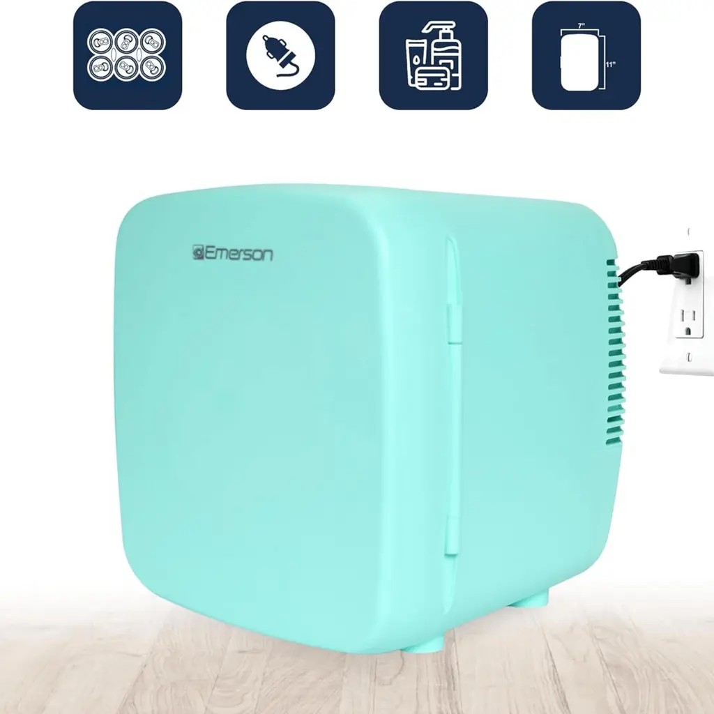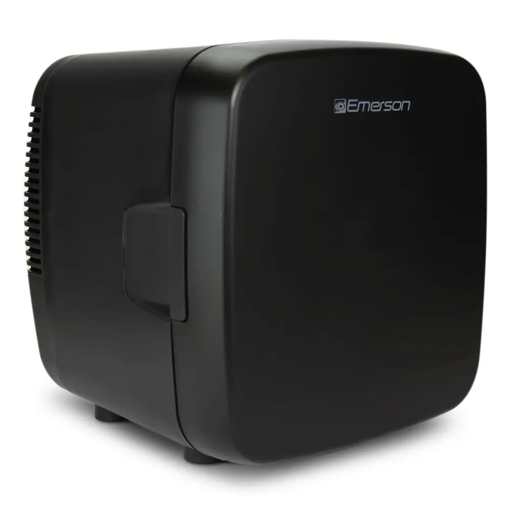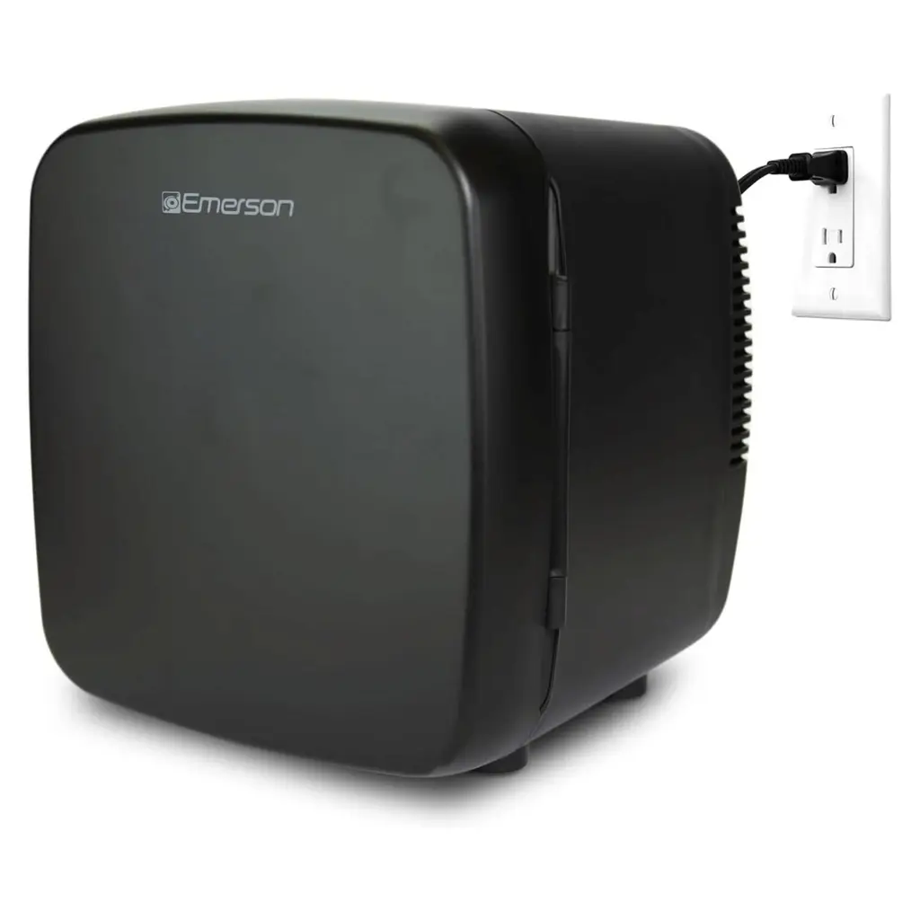 Emerson Portable Mini Fridge Cooler XLDescription:Emerson's 9-liter mini fridge is the perfect solution for storing up to 12 cans (12 oz) of snacks and beverages. It features a thermoelectric cooling system that operates quietly and cools to 28-30 degrees F below the ambient temperature. The fridge is equipped with a locking latch mechanism, and a space-saving design, and it comes with an AC/DC power adapter. Get yours today and enjoy chilled drinks and snacks anytime, anywhere! The compact size of the mini fridge allows it to fit virtually anywhere, making it a convenient addition to any room.Features:Specifications:Product Information: