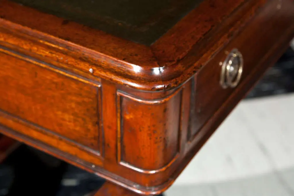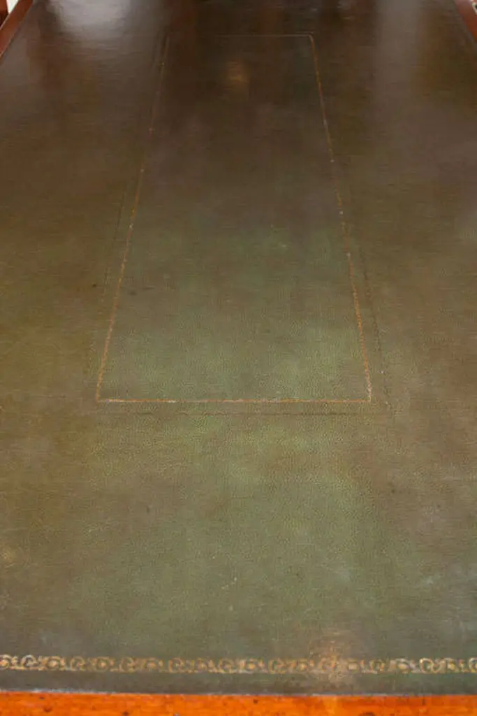 Handcrafted for us by a small workshop in England, this writing table embodies the quality and appearance buyers of bespoke English furniture have come to expect over the last 300 years. From the gold-tooled leather to the rich, hand-rubbed finish with subtle distressing, this handsome table would be a stunning addition to any home.