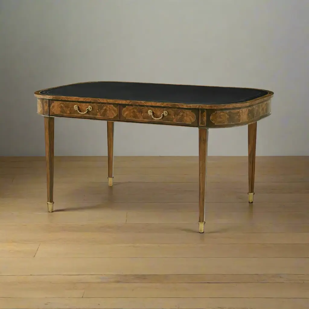 Crafted from high-quality wood, this table boasts a luxurious figured walnut finish that exudes timeless sophistication. The top is adorned with a rich black leather surface, providing a smooth and stylish area for writing, reading, or working on your laptop. The table features two spacious drawers, adorned with elegant brass handles, offering convenient storage for your writing essentials and office supplies. The classic design is complemented by slender, square tapered legs with brass-capped feet, adding a touch of traditional charm to any room. Perfect for a study, home office, or living room, the English Leather Top Writing Table combines beauty and functionality, making it an exquisite addition to your home decor. Dimensions: 60" W x 36" D x 30.5" H