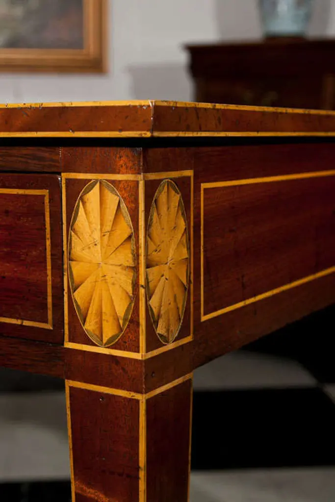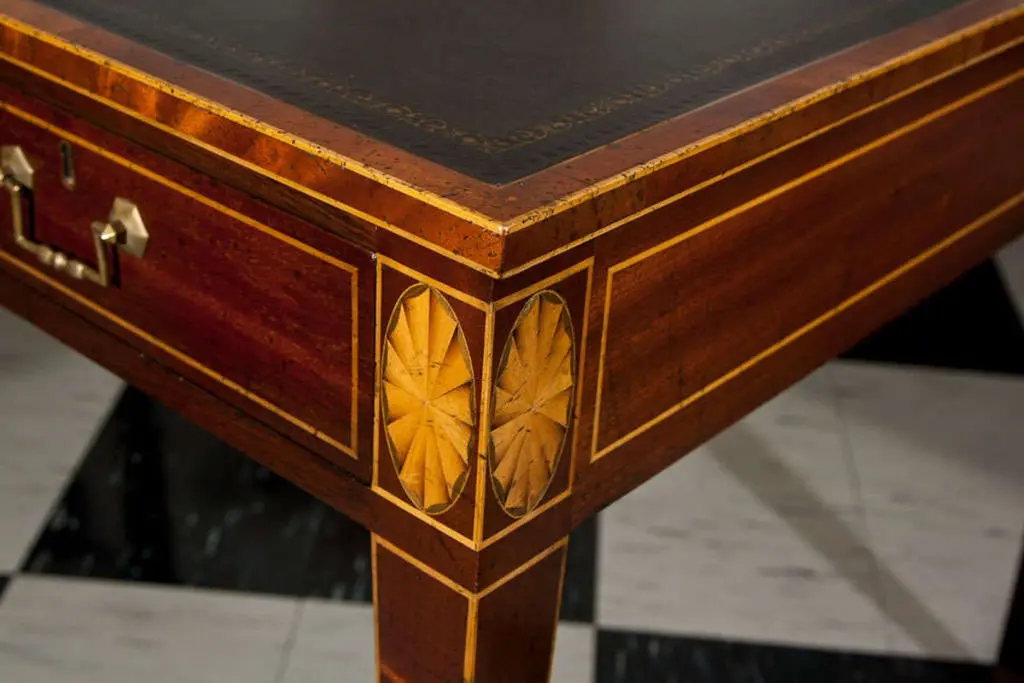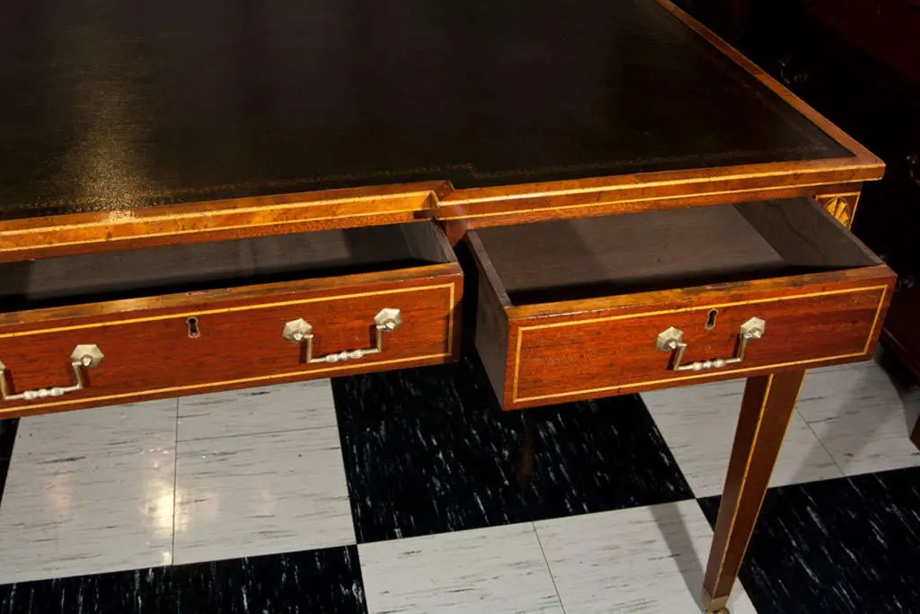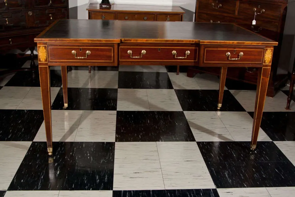 Mahogany shaped top partners writing table with satinwood stringing and inlaid fan medallions. Black/green, antiqued and gold tooled leather top. Three drawers each side with antiqued brass bail hardware; tapered legs with satinwood stringing ending in brass toecaps and casters.