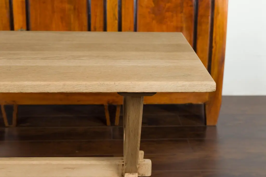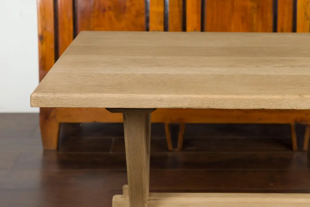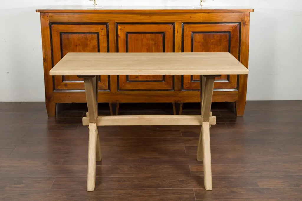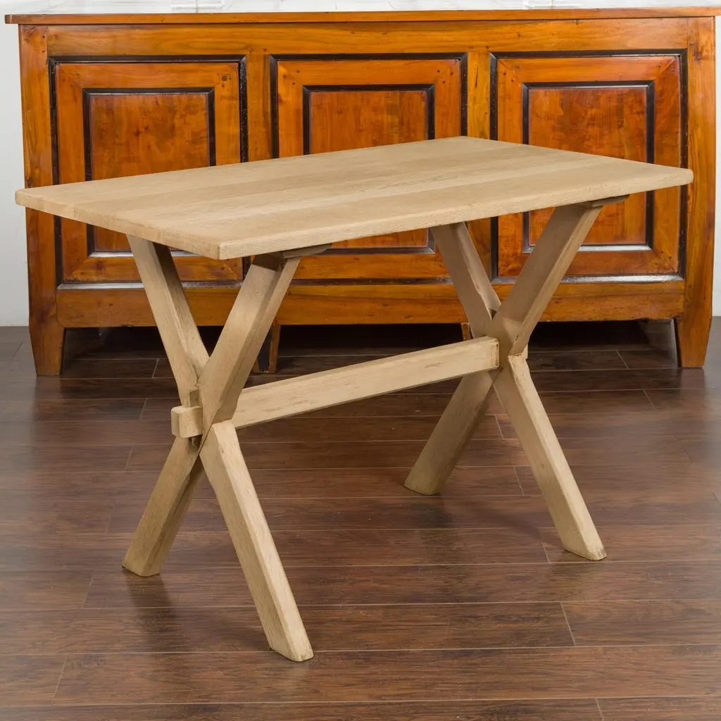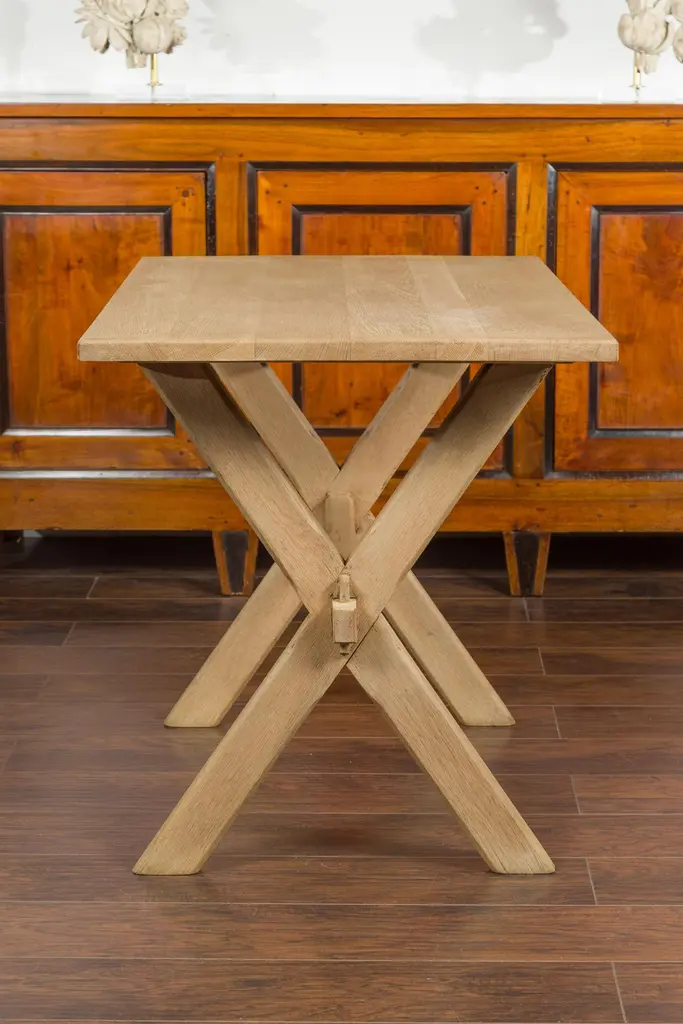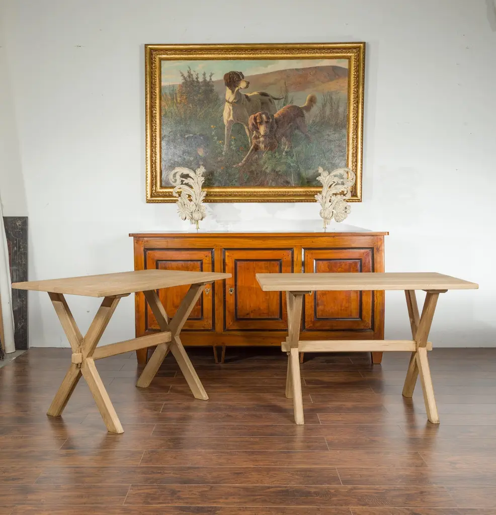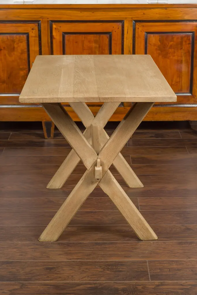 An English oak sawbuck table from the Turn of the Century, with X-form base. We currently have two tables available, priced and sold each $5,650 (see image 3 to view them both). Created in England during the early years of the 20th century, this sawbuck table features a rectangular top sitting above a simple X-form base with cross stretcher. Boasting a natural patina, this English sawbuck table circa 1900 will be an excellent addition to any living room, hallway or kitchen.