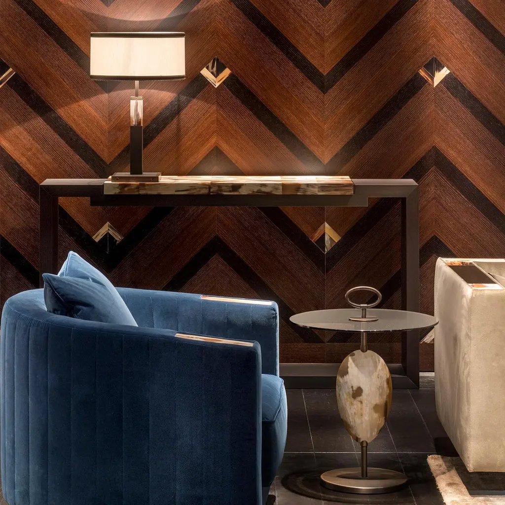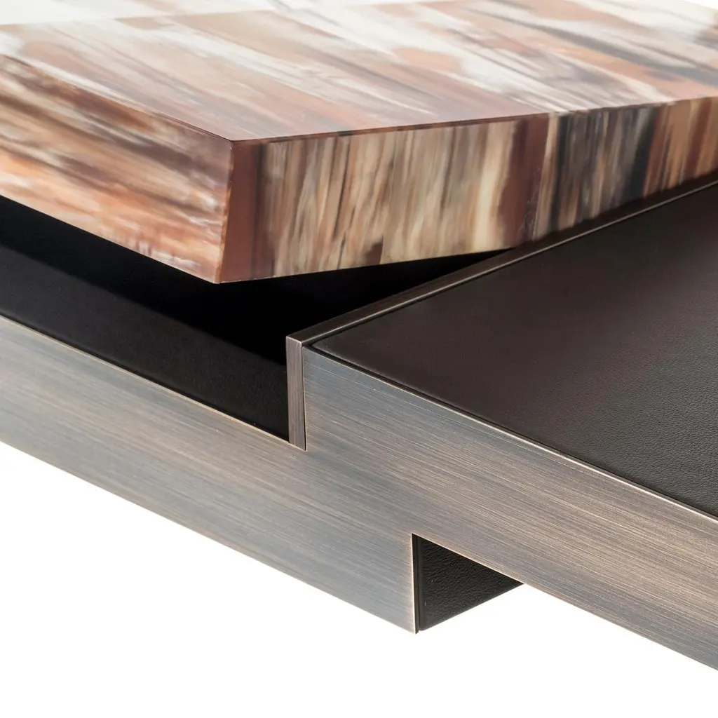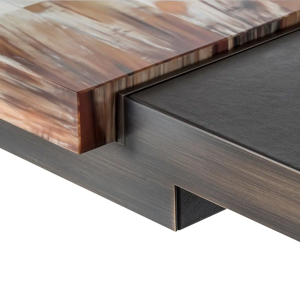 Functionality and aesthetics meld together in Essenziale console table, handcrafted of dark brown Tosca leather (cat. Super). Equipped with an elegant secretaire in Corno Italiano, boasting warm and inviting color tones with matte finish, the console offers a practical space for holding your stuff out of sight. Complete with a captivating edging in burnished brass, the design is a statement of superb quality that will work perfectly on an entryway or a living room, beneath a mirror or an artwork. Note: Colors and shades of Corno Italiano processed by our Company are unique and due to the natural origin of raw material. For this reason Corno Italiano tones that can be seen in pictures are indicative and can not be reproduced in finished products.