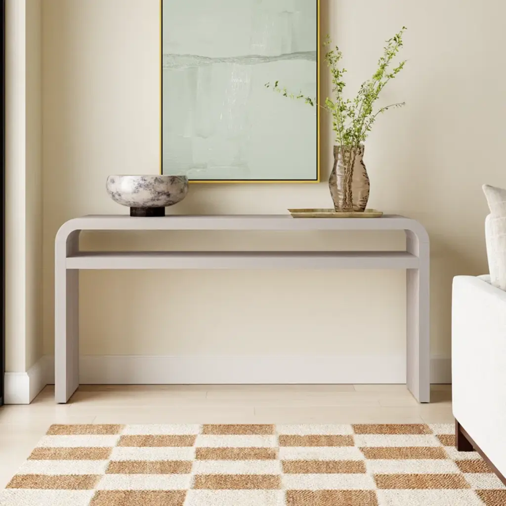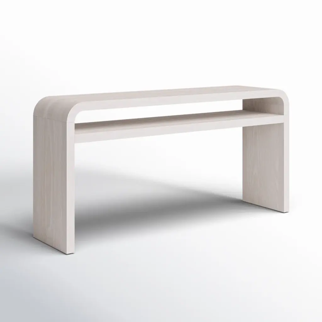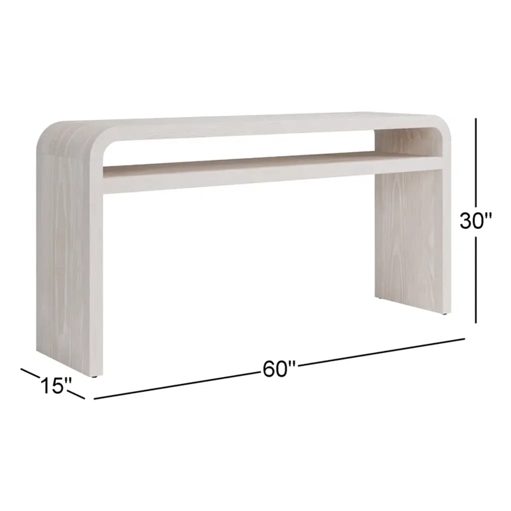 This console table pairs a minimalist design with functionality. Crafted from a wood blend with a wire-brushed texture that accentuates its natural beauty, it’s finished in a subtle off-white wash. A spacious shelf offers ample storage, while rounded corners combine style and function. Non-marking nylon levelers ensure stability, making it a versatile choice for any living room or office.
