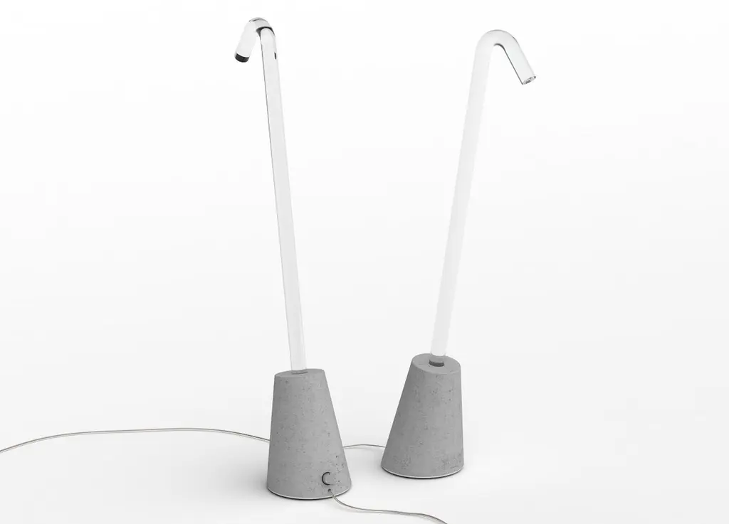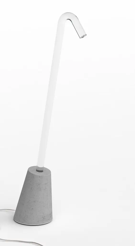 This elegant table and floor light challenges the common perception that light travels in a straight line. It provides ambient light as well as a dimmable, focused, Directional beam. Using a minimum of materials and components, it is surprisingly simple but provides a spectacle rarely found in such an everyday domestic lighting product. Light travels from a light source embedded deep within a grey concrete or black base and up through an optical grade, precisely curved, transparent acrylic rod and eventually culminates in a bright beam appearing at more than a meter from its source. Base diameter: 14 cm. Base height: 160 cm. Cable length: 150 cm. Weight: 2.2 kg. Lighting: 220/240V.