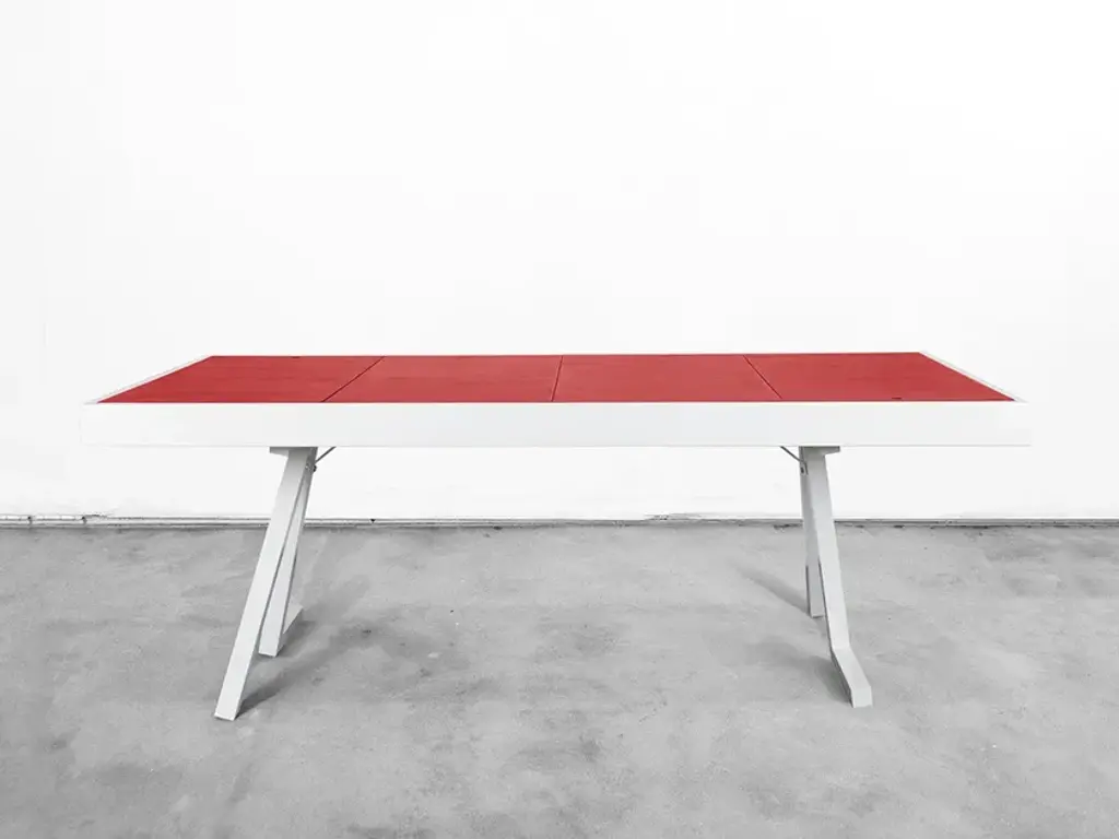 A modern cabinet table with a special modern mood, composed of a steel structure and tubular basis. Its tubular legs seem to dance on the floor, while they are supporting the steel frame providing a unique balance between harmony and asymmetry.Worktop made of MDF substrate with lacquer-finish and a protective resin layer. This part is composed of several elements which can be lifted to access the storage level beneath. Frame is entirely made of powder-paintedsteel and can be provided in various colours to achieve cosy combinations with worktop finishes.Materials: tubular profile and steel plateFinishes: steel, corten, RAL