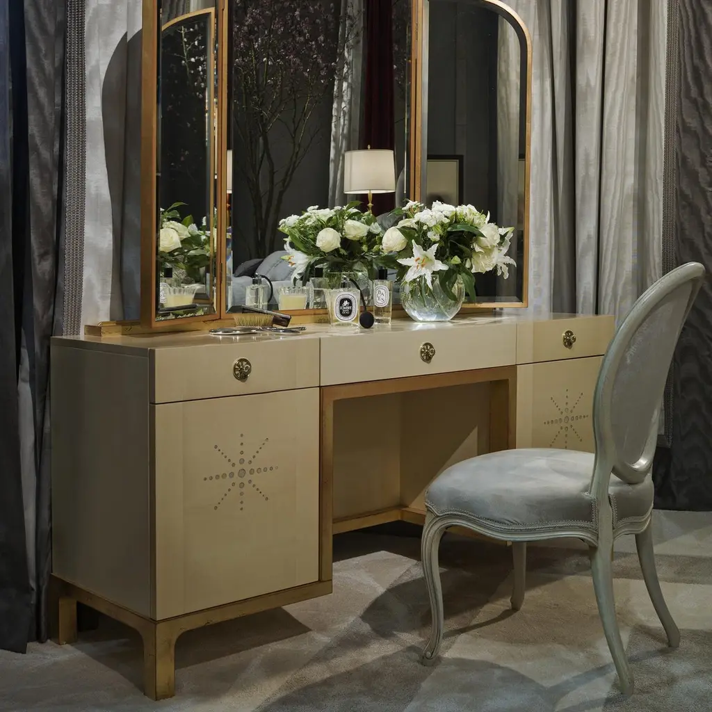 A complementing piece to the Etoile chest of drawers, this vanity table is a superb addition to a bedroom, where it will make a sophisticated statement. Completely handcrafted of maple wood, this piece features an imposing size and a stunning art deco-inspired silhouette. The wood base has a gold finish, which occurs also in the wood frame of the three-part mirror. The desk features three drawers and two side doors, whose front panels are enriched with an inlaid decoration in maple and mother-of-pearl inserts, complemented by brass handles.