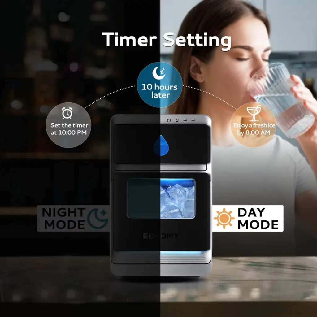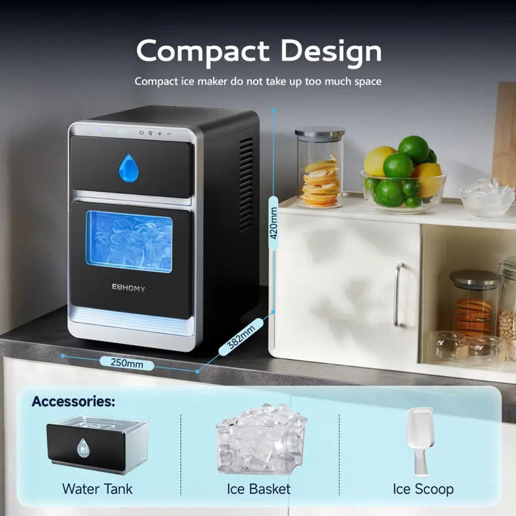 Introducing the EUHOMY Countertop Ice Maker, a game - changer for your cooling needs across home, parties, RV journeys, and small businesses! It crafts unique moon - shaped ice cubes that boast a distinct texture and slow - melting magic, ensuring your drinks stay perfectly chilled and full of flavor, whether it's a smooth whiskey, a zesty iced tea, or a vibrant party cocktail. With continuous ice production, churning out 16 cubes per cycle in 12-min, paired with a 1.9L water tank and a 1kg ice basket, so you’ll never face an ice - less crisis, be it for a bustling home party, a busy small business, or an adventurous RV trip. User - friendly controls let you customize ice thickness and timing with ease, plus features like 5 - second forced deicing, brightness adjustment, and clear indicator lights, simplifying operation. Its compact 250mm×382mm×420mm size slides right onto any kitchen counter, fitting cozy home kitchens, small office break rooms, or RVs without a hitch. Built with durable sheet metal, it endures daily use, business demands, and RV bumps for long - lasting reliability. The 20-min auto deep clean mode takes the pain out of upkeep, while the efficient heat dissipation system keeps it running cool and consistent. Arriving in protective packaging ideal for global shipping and gifting, this ice maker is your go - to for refreshing drinks at home gatherings, lively parties, on - the - road RV adventures, and small - business operations. Elevate every chilled moment with the EUHOMY Countertop Ice Maker, where style, efficiency, and durability blend seamlessly!