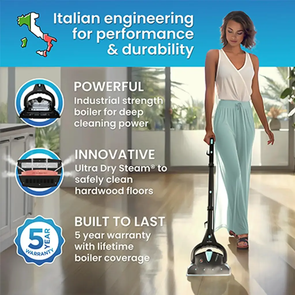 The Euroflex Vapour Pro M4S 20 Piece All-in-One Steam Mop with Built-In Portable Steam Cleaner rated “Best Overall Steam Cleaner” by Good Housekeeping. Powered by our patented Ultra Dry Steam® Technology, the Vapour Pro safely deep cleans and sanitizes premium flooring and prevents warping, discoloration and water damage.This innovative cleaner produces steam at 295°F (146°C) with 50 PSI of pressure leaving floors streak-free and dry within seconds – 97% faster than traditional steam mops. Within seconds this powerful upright steamer converts into a versatile all-purpose portable steam cleaner. With 20 total parts, accessories & attachments including 8 multiple surface cleaning adapters, easily clean and sanitize your entire home – ceiling to floor.With just plain tap water deodorize & sanitize bedding and mattresses eliminating dust mites and bedbugs and killing 99.99% of germs, bacteria and viruses – without using harsh chemicals or toxic cleaning solutions.