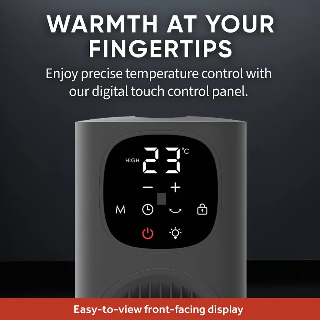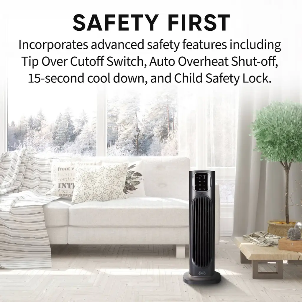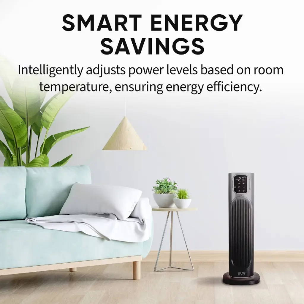The EVO Digital Tower Ceramic Heater provides warm, comfortable, and energy-efficient heating with its wide-angle heat dispersion, precise temperature control, smart Heat Logic Technology, convenient features, and safety features.