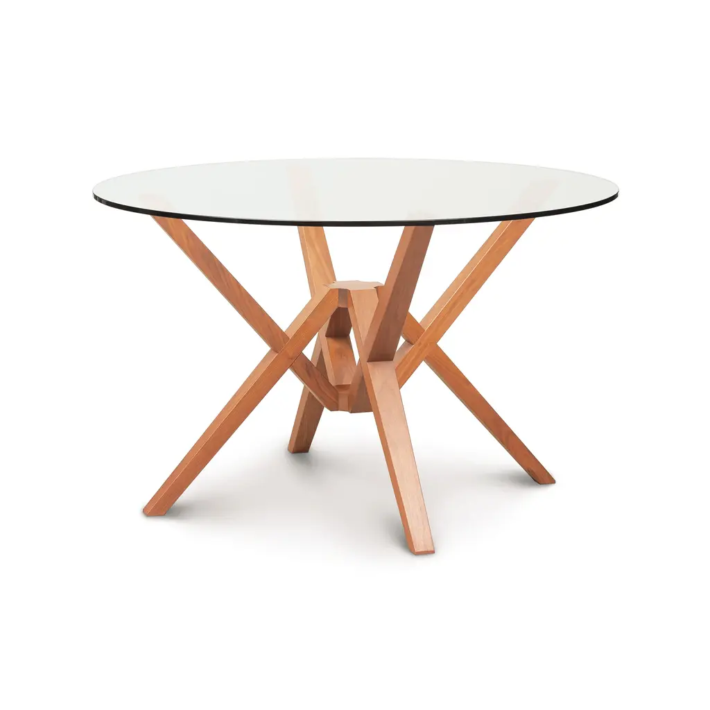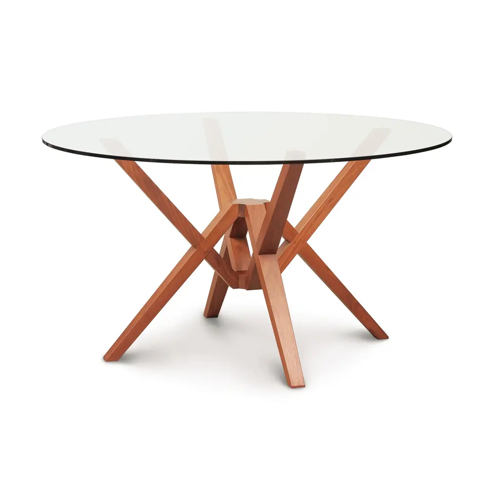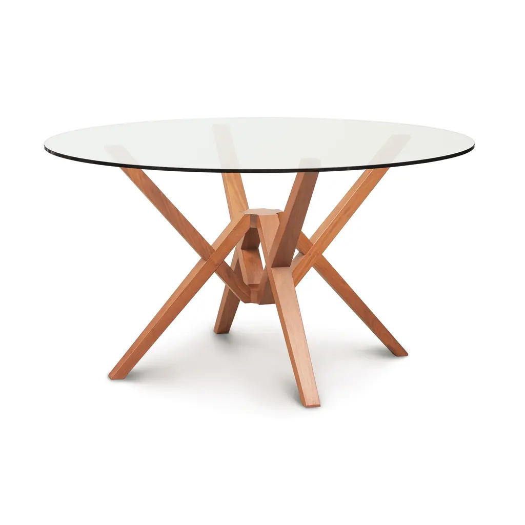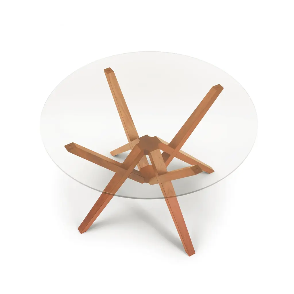 The isometric design and innovative engineering found in our Exeter Round Glass Top Table by Copeland commands attention. Enjoy the suspended appearance shown in the artfully designed solid wood base which is complimented by the clear glass surface of the top. The glass top will allow you to marvel at the geometric base and its artful pairing with an opposing round top.This table is a great example functional furniture and sculptural design. Every Exeter table is made-to-order by skilled Vermont craftsmen using sustainably harvested hardwoods.Base price represents 48" table in natural cherryShown in natural cherryMatching furniture available in our Exeter Furniture Collection