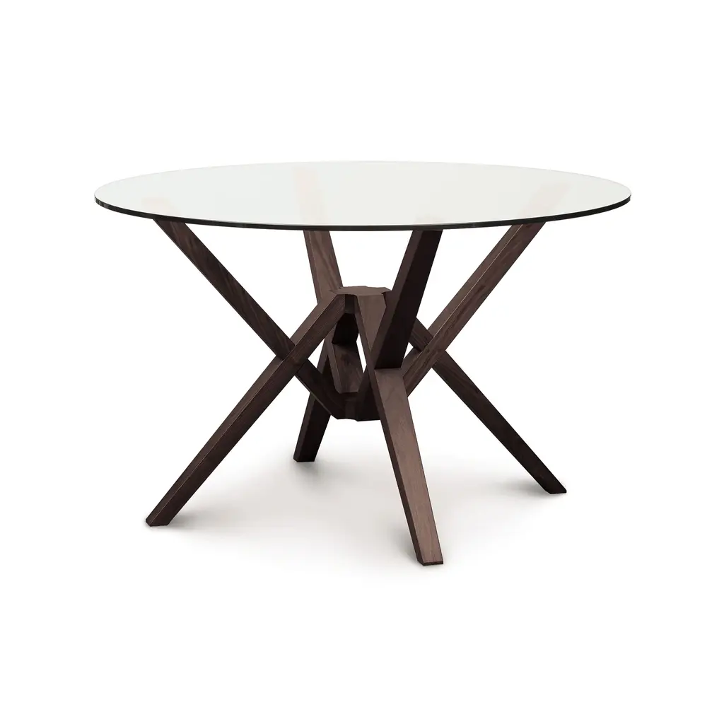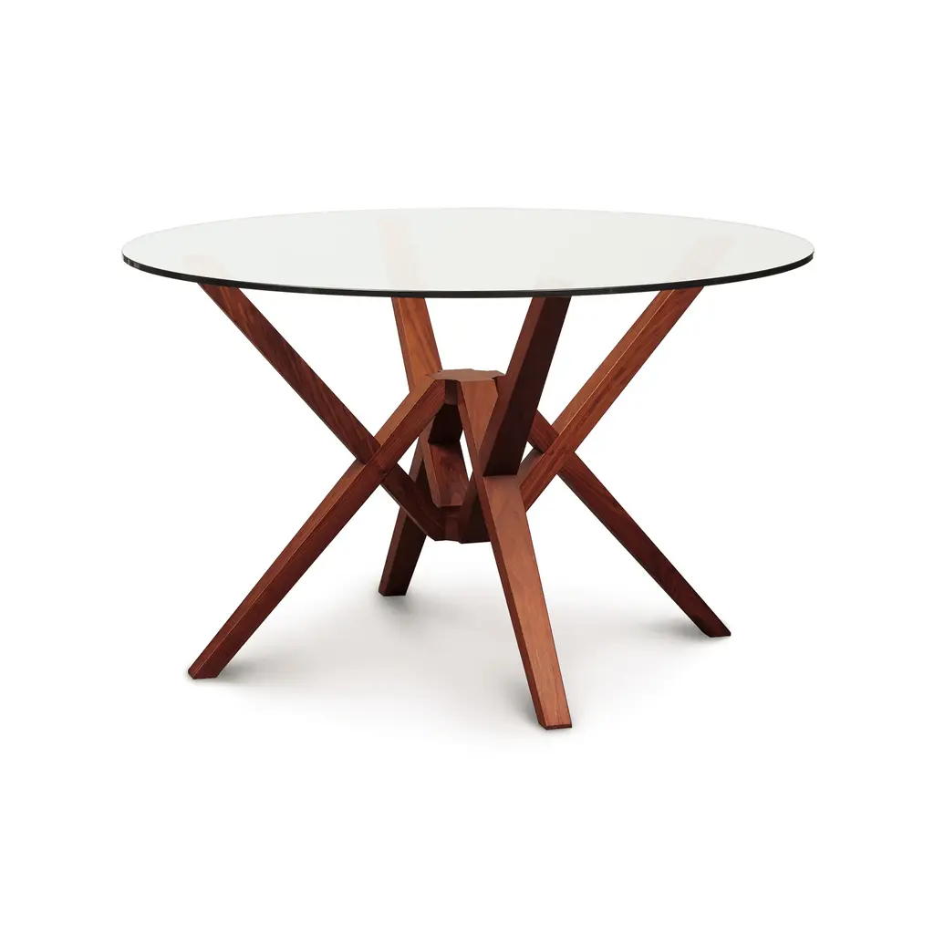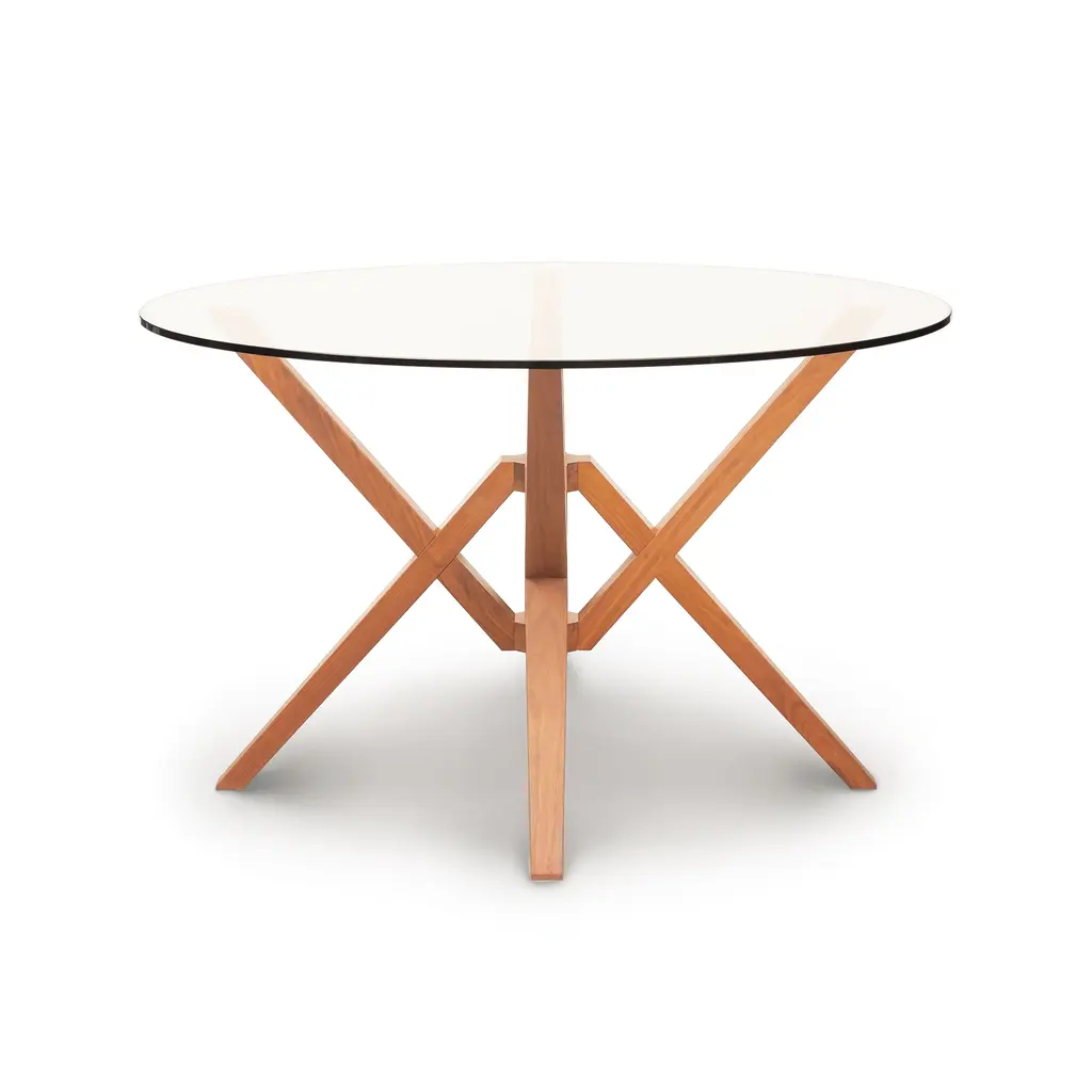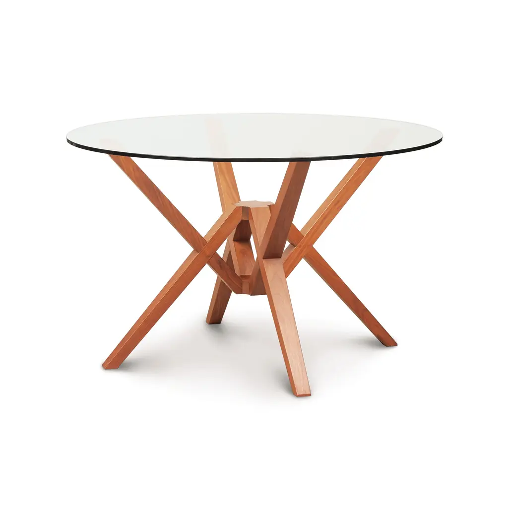 The isometric design and innovative engineering found in our Exeter Round Glass Top Table by Copeland commands attention. Enjoy the suspended appearance shown in the artfully designed solid wood base which is complimented by the clear glass surface of the top. The glass top will allow you to marvel at the geometric base and its artful pairing with an opposing round top.This table is a great example functional furniture and sculptural design. Every Exeter table is made-to-order by skilled Vermont craftsmen using sustainably harvested hardwoods.Base price represents 48" table in natural cherryShown in natural cherryMatching furniture available in our Exeter Furniture Collection