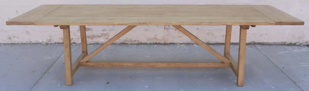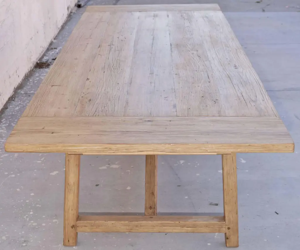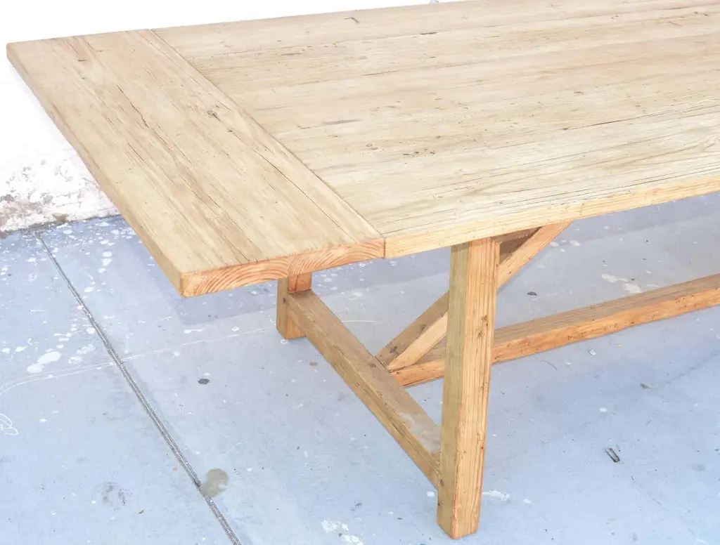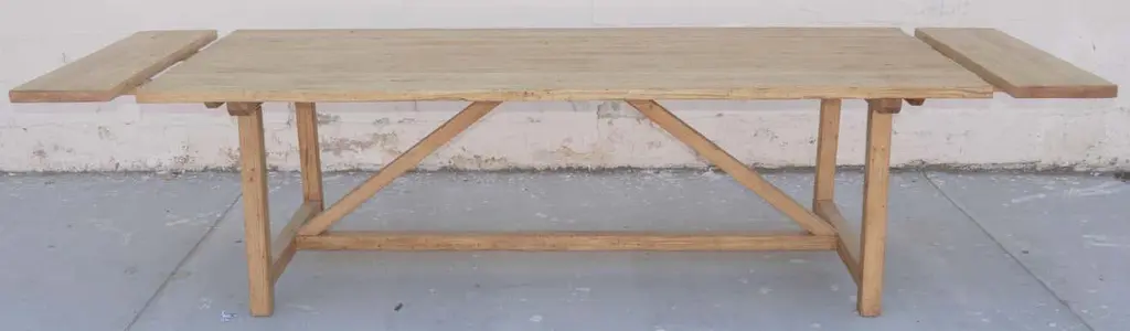 This table is seen here in 112" x 42" with two 15" extensions, expanding the table to 142" We use hand selected, vintage heart pine that has naturally matured for a great authentic patina. We use only traditional carpentry techniques, no nails or metal fasteners of any kind. Just mortise and tenon construction reinforced with hand-cut wooden dowels.