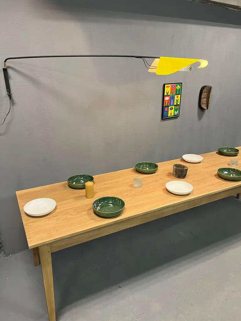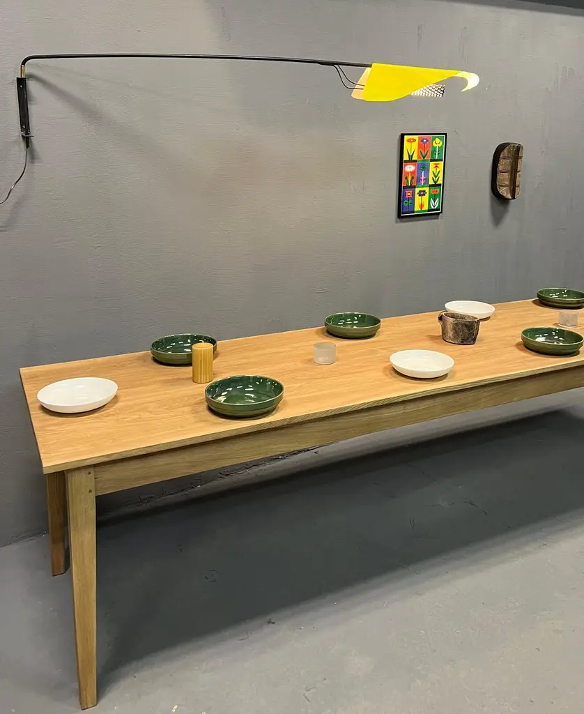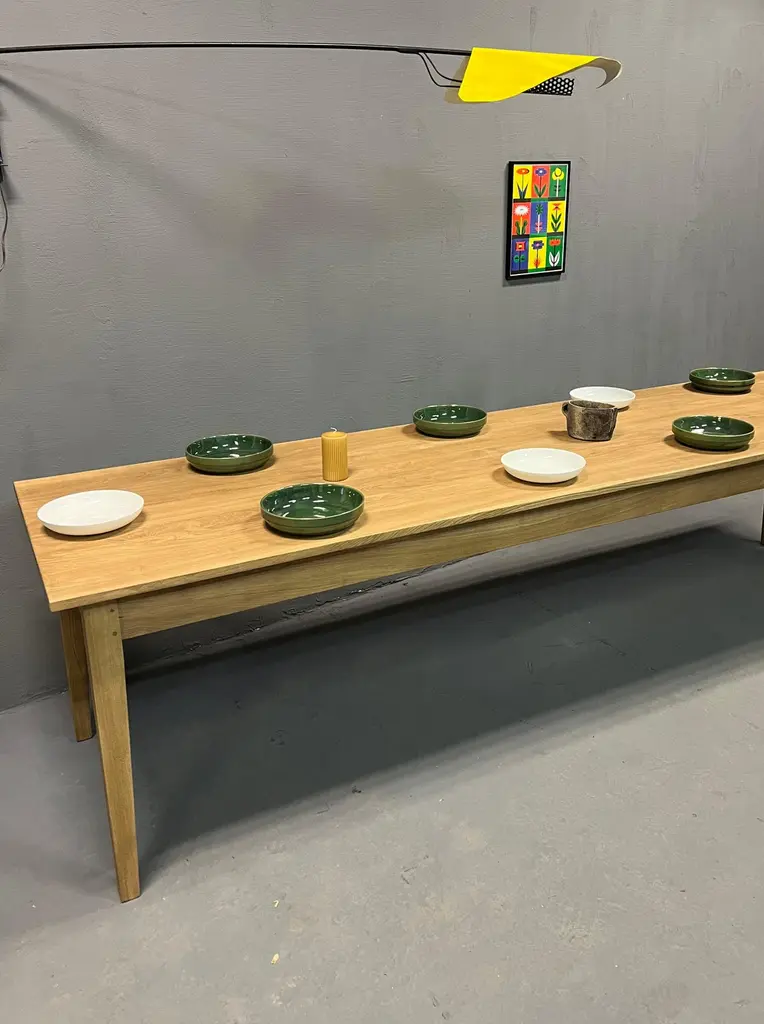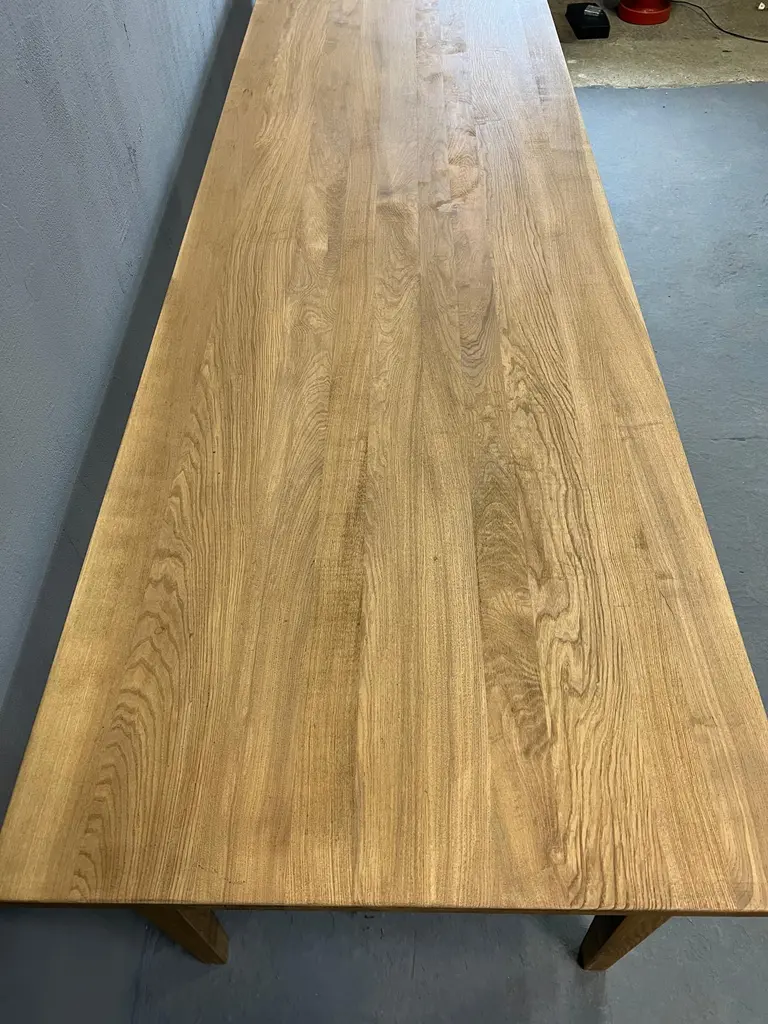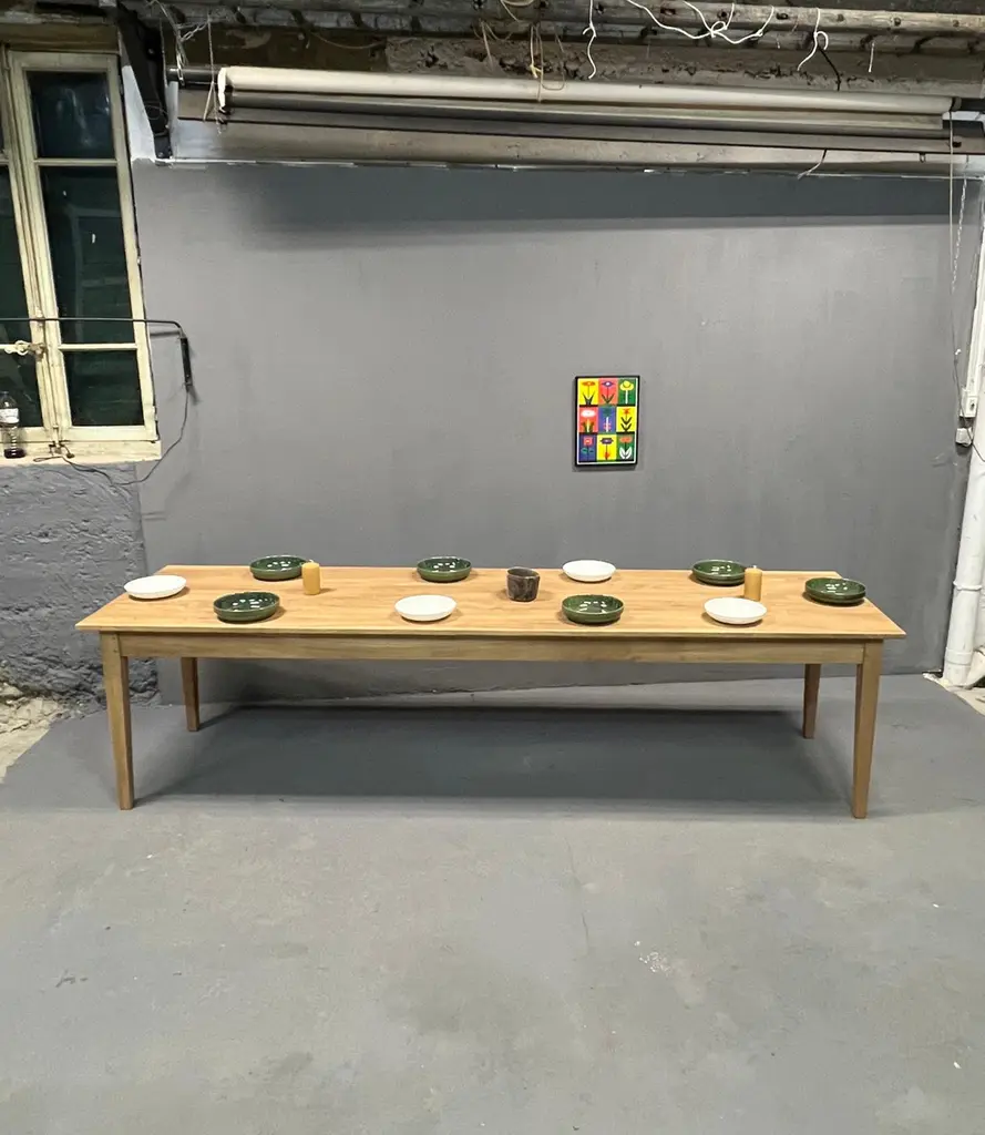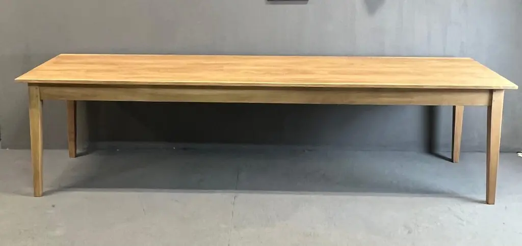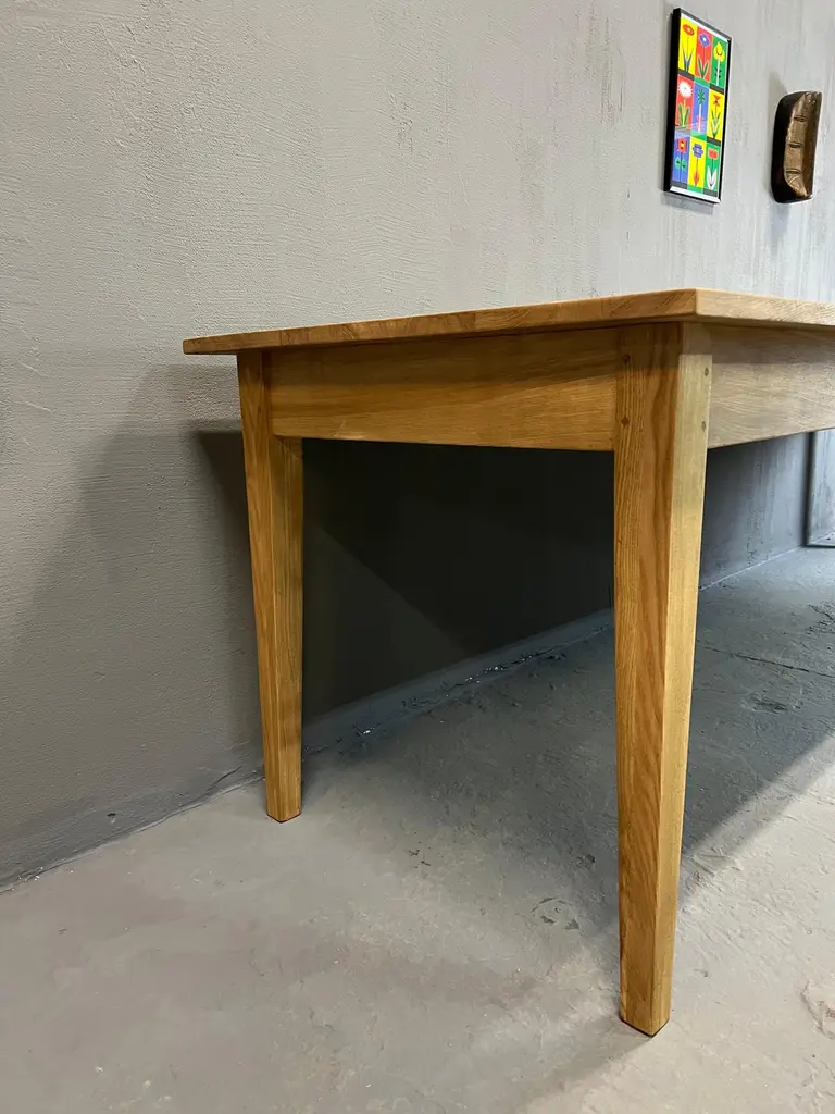 Very nice table 3 meters long in solid ash. It is made up of a 2 cm thick top and its dimensions are ideal to accommodate up to 14 guests easily: 3 meters long, 90 cm wide and 77 cm high with a height under the band of 63.5 cm. It is beautifully crafted and uses the traditional carpentry techniques of old tables, reinforced by a screwing of the top over the entire length of the crosspieces. With its tapered feet, it has a crazy class and its quality of manufacture makes it an investment over several decades. The table is varnished 2 coats in light oak tint, which will protect the wood on a daily basis. It will acquire a patina over time and its charm will increase over time. Its weight is about 40 kg, it is very stable and very solid, its heavy weight attests to the durability and the overall appearance of this table. Length: 3 meters. Width: 90cm. Height: 77cm. Height under headband: 63.5 cm.