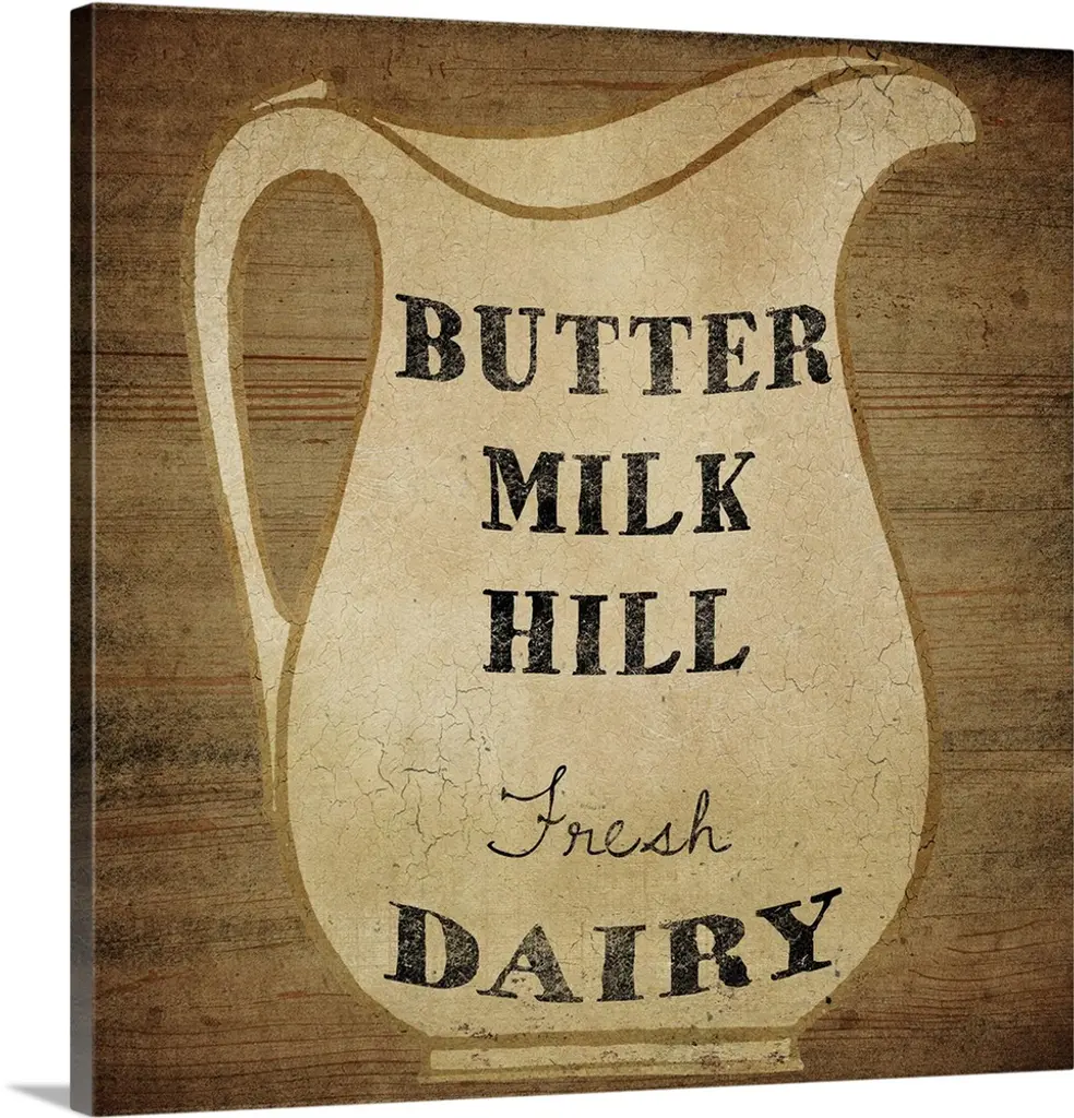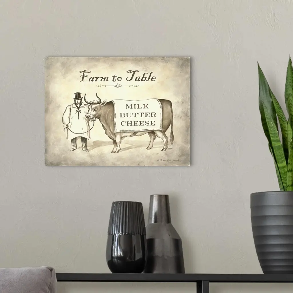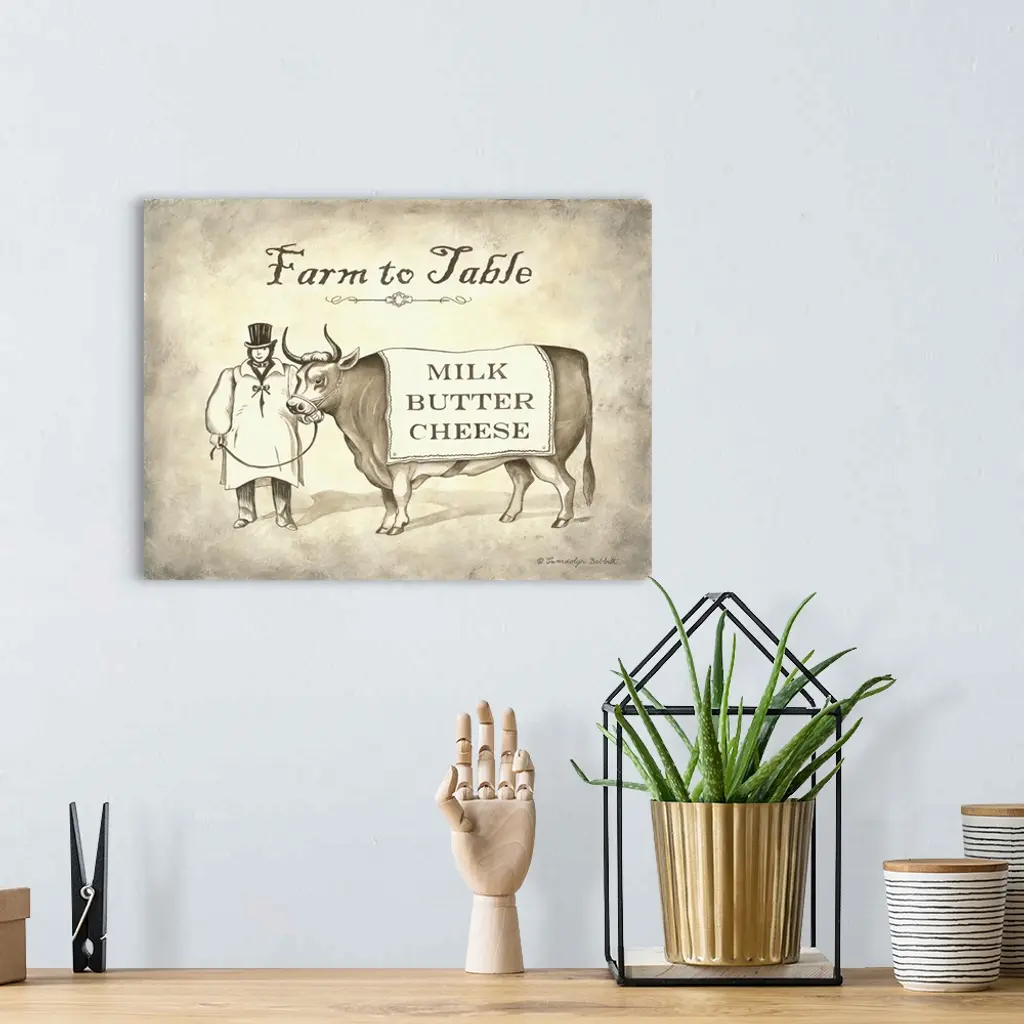 Decorative painting of a man with a cow wearing a blanket that reads "Milk Butter Cheese" and "Farm to Table" written at the top.
