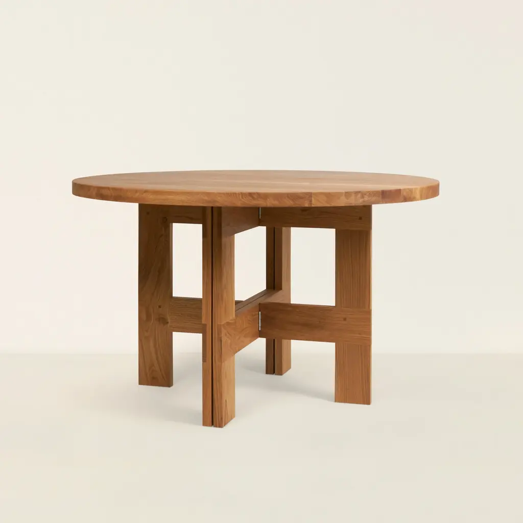 In the sentiment of traditional farmhouses, the table solely inhabits elements of function; abiding to the notion of the simple life on the countryside whilst expressing a rural aesthetic.The Farmhouse Table is composed by two trestles used in conjunction, along with a round table top. The visible trestles resemble the exposed beams apparent at traditional farmhouses. On top rests a double-face table top of oak speckled with knots; seemingly unapologetic about its “flaws”. However, if you turn it around, a less knotted complexion will reveal itself.