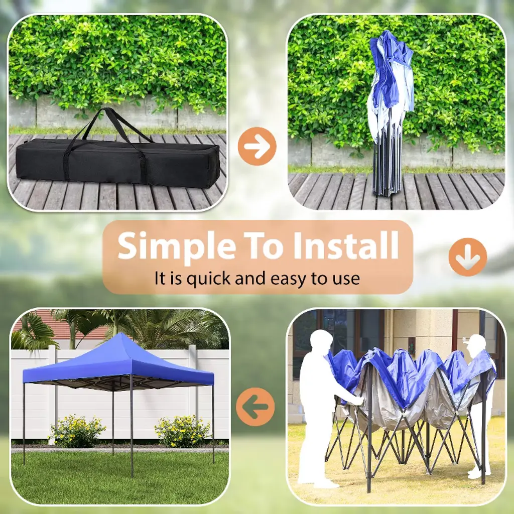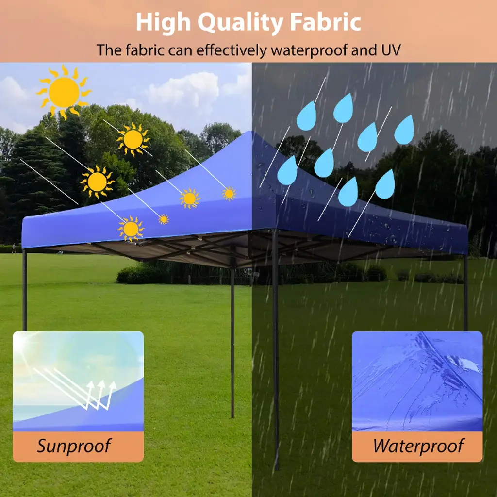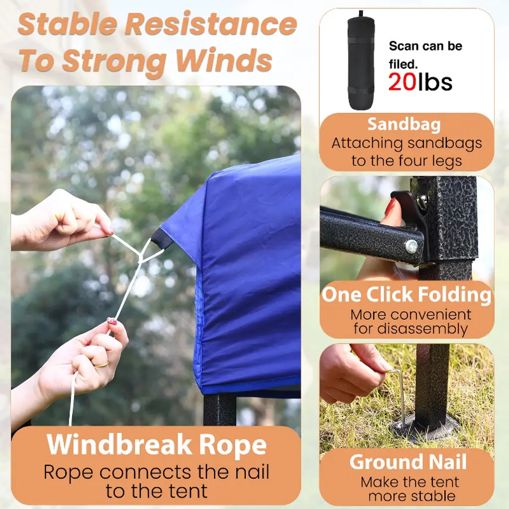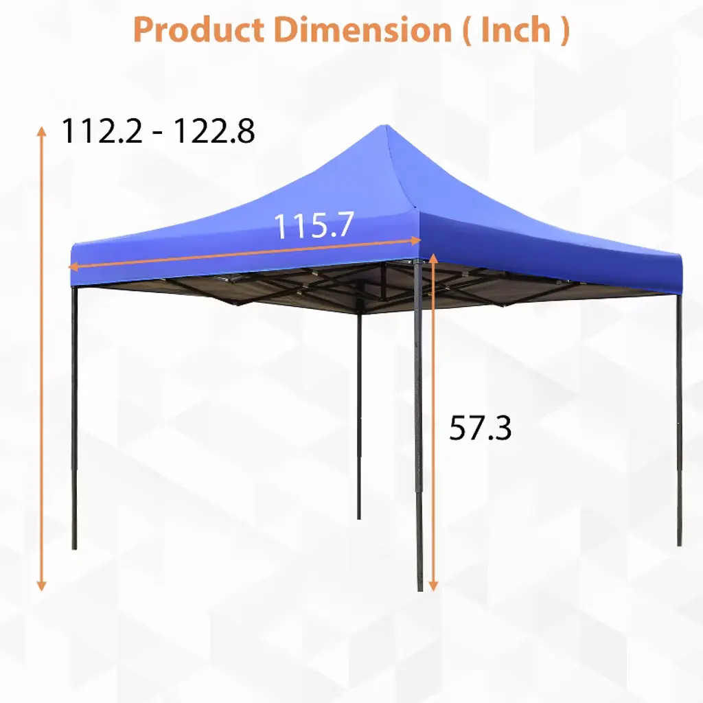 Our high quality canopy tent can be conveniently carried and are perfect for many outdoor needs, picnics, parties, camping trips, park activities. Our pop up canopy tent is tough but lightweight, vented, with sun-proof protection of the 9.6x9.6 pop up canopy. No worry for the rain, hot sun, snow or UV rays, you will be absolutely comfortable in the party tent.should not be used in heavy rain or against strong winds. Please Note: 1.Leave away from sources of fire 2.Not recommended for use in prolonged rain or during strong wind.