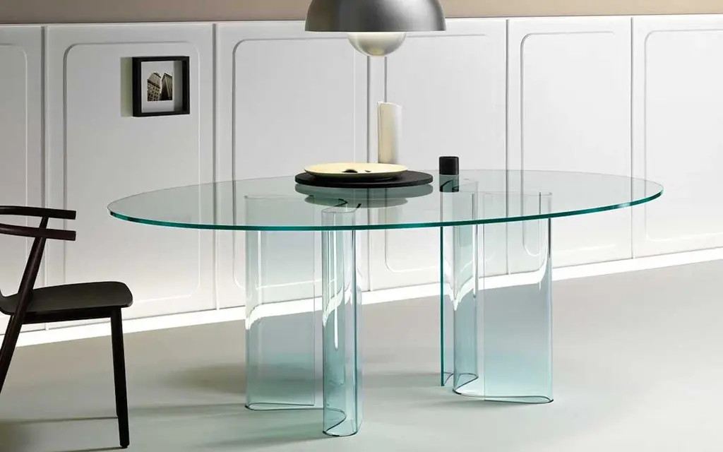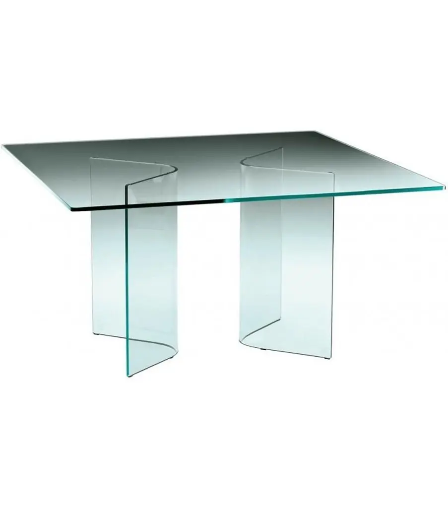 Table with 12 mm-thick curved glass base (sides 45 cm) and 15 mm-thick tempered glass top.