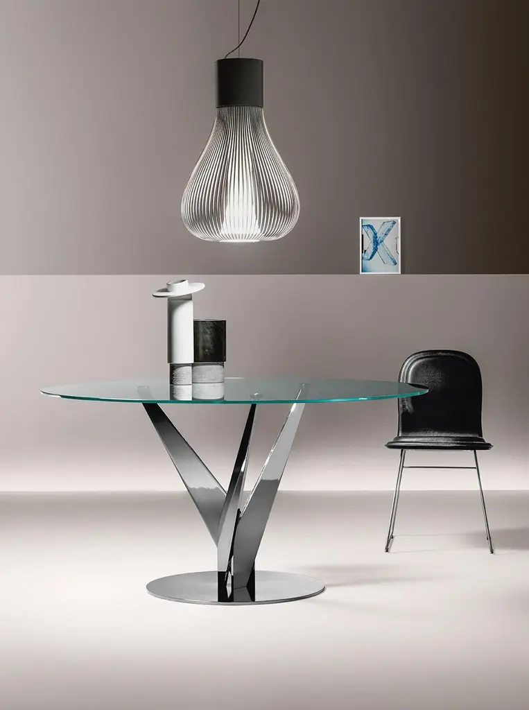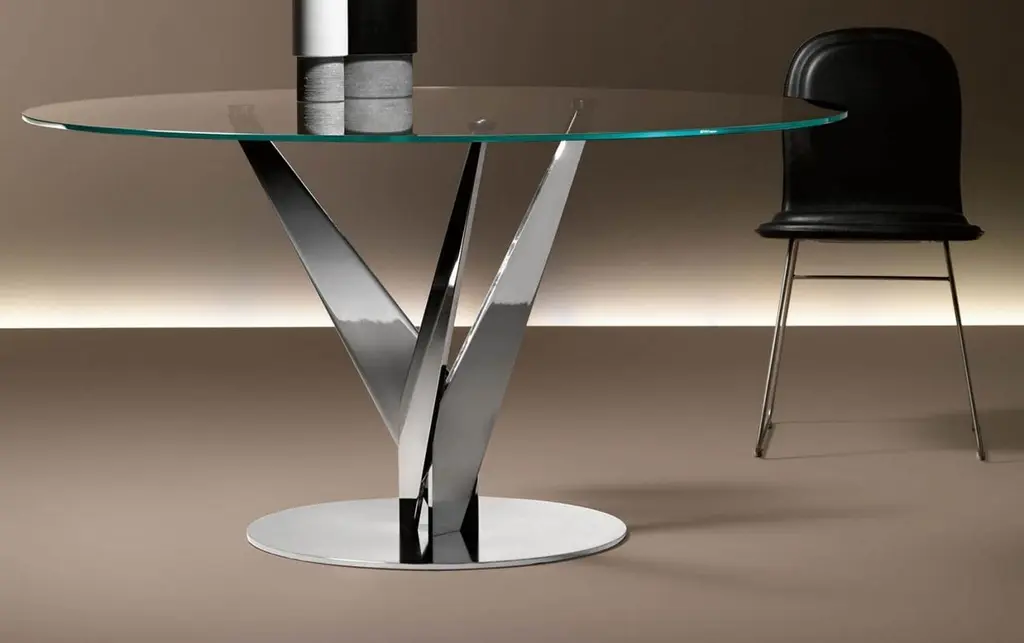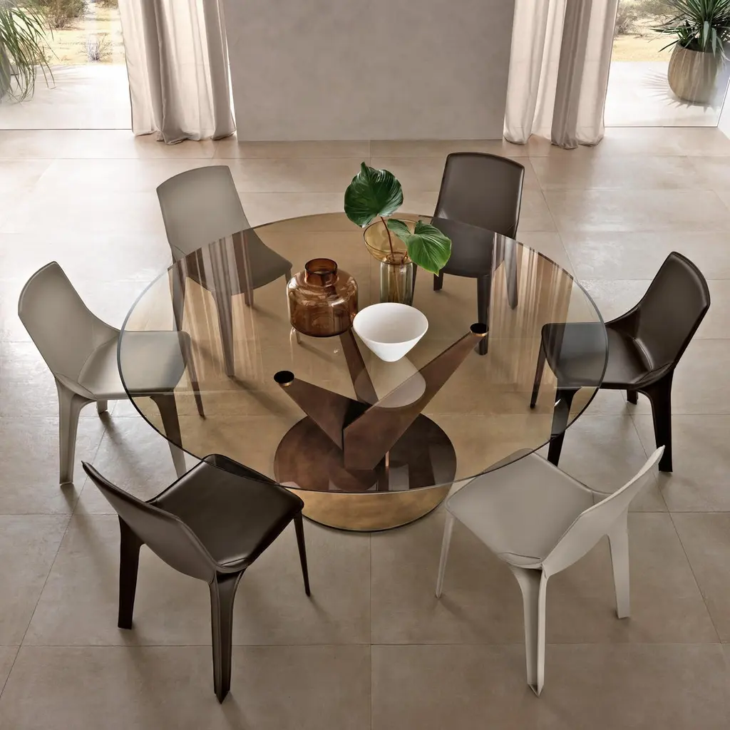 Round table with 10 mm-thick tempered transparent, smoked or bronze glass top. Chromed or burnished brass finish legs; stainless steel or brass fixing plates. The Epsylon table is also available with customized top, diameter from 90 cm to 140 cm.