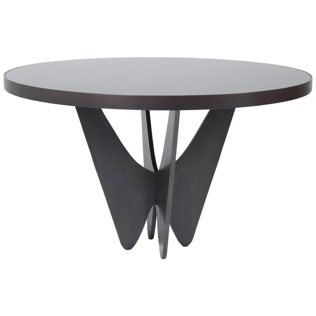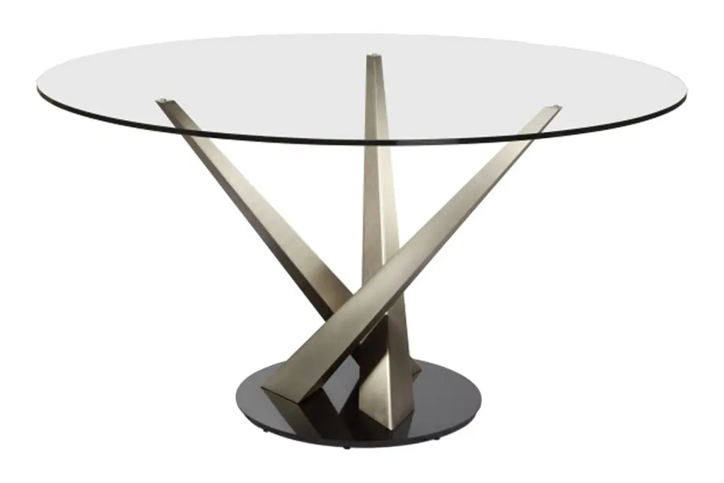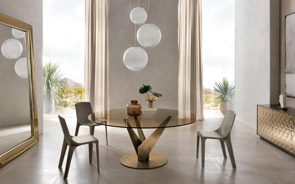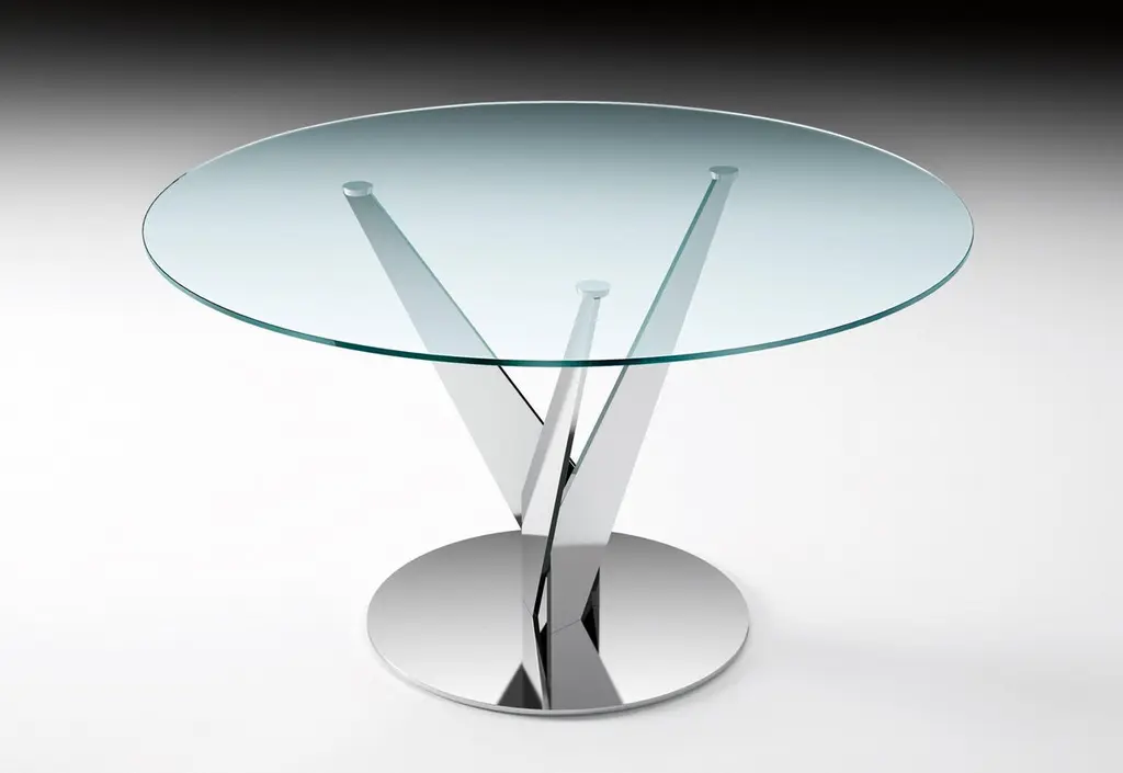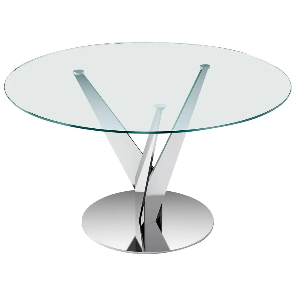 Round table with 10 mm-thick tempered transparent, smoked or bronze glass top. Chromed or burnished brass finish legs; stainless steel or brass fixing plates. The Epsylon table is also available with customized top, diameter from 90 cm to 140 cm. Transparent glass top, chromed steel legs.