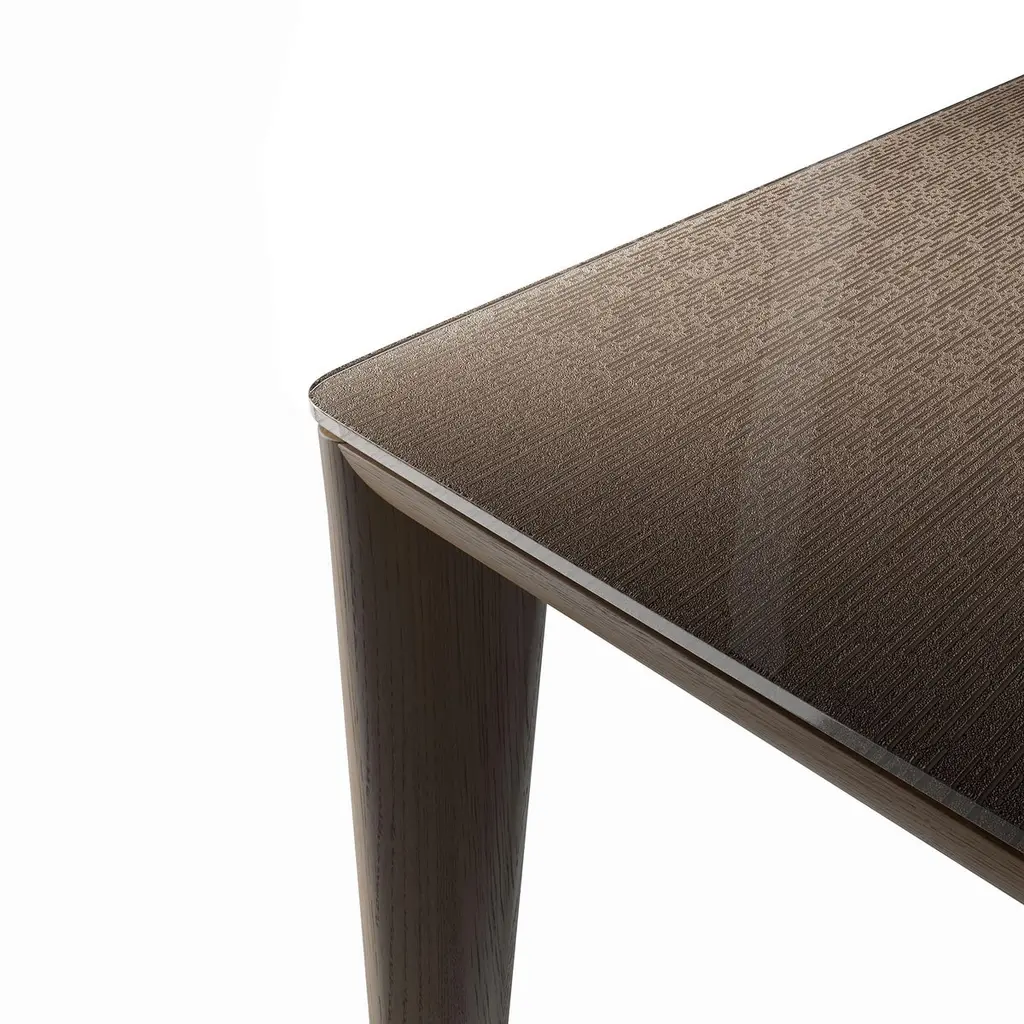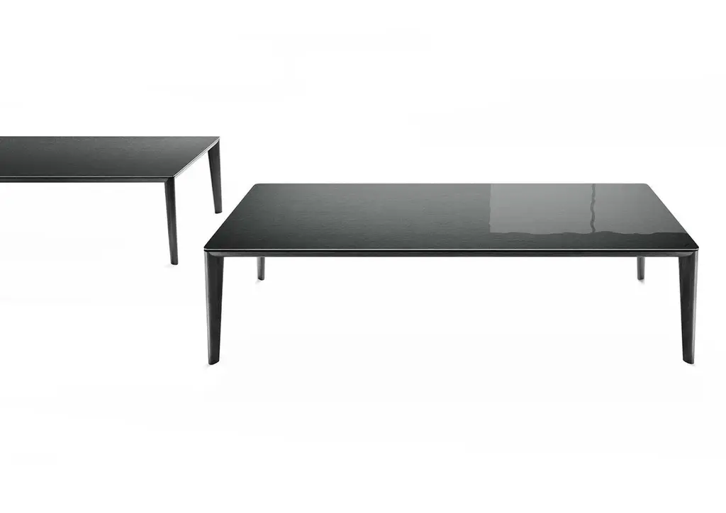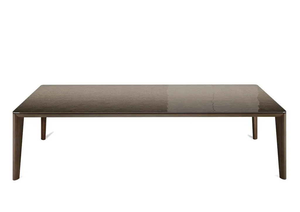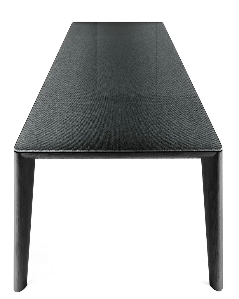 Flaminio arose from the desire to enhance the lightness and harmony of an object which is a protagonist of multiple moments of our everyday life. Inspired to the homonymous stadium in Rome designed by Pier Luigi Nervi, this table plays with contrasts between full and empty spaces, highlighting the glass manufacturing in relation to its relevant real wooden structure. The table top is supported and surrounded by a frame that divides it from the relevant base through an unusual section, rediscovering the same lightness that distinguishes Nervi’s works. This interruption is highlighted by the choice of two pure materials: glass and its fluidity combined to the robustness of wood. Thanks to its small expedients, that become evident to an attentive eye, Flaminio is able to adapt to any ambience while embellishing it.Table with 12 mm fusedand tempered glass top,back-painted with withmetallic paints. Solidwood structure availablein Tobacco or heat-treated black finish.