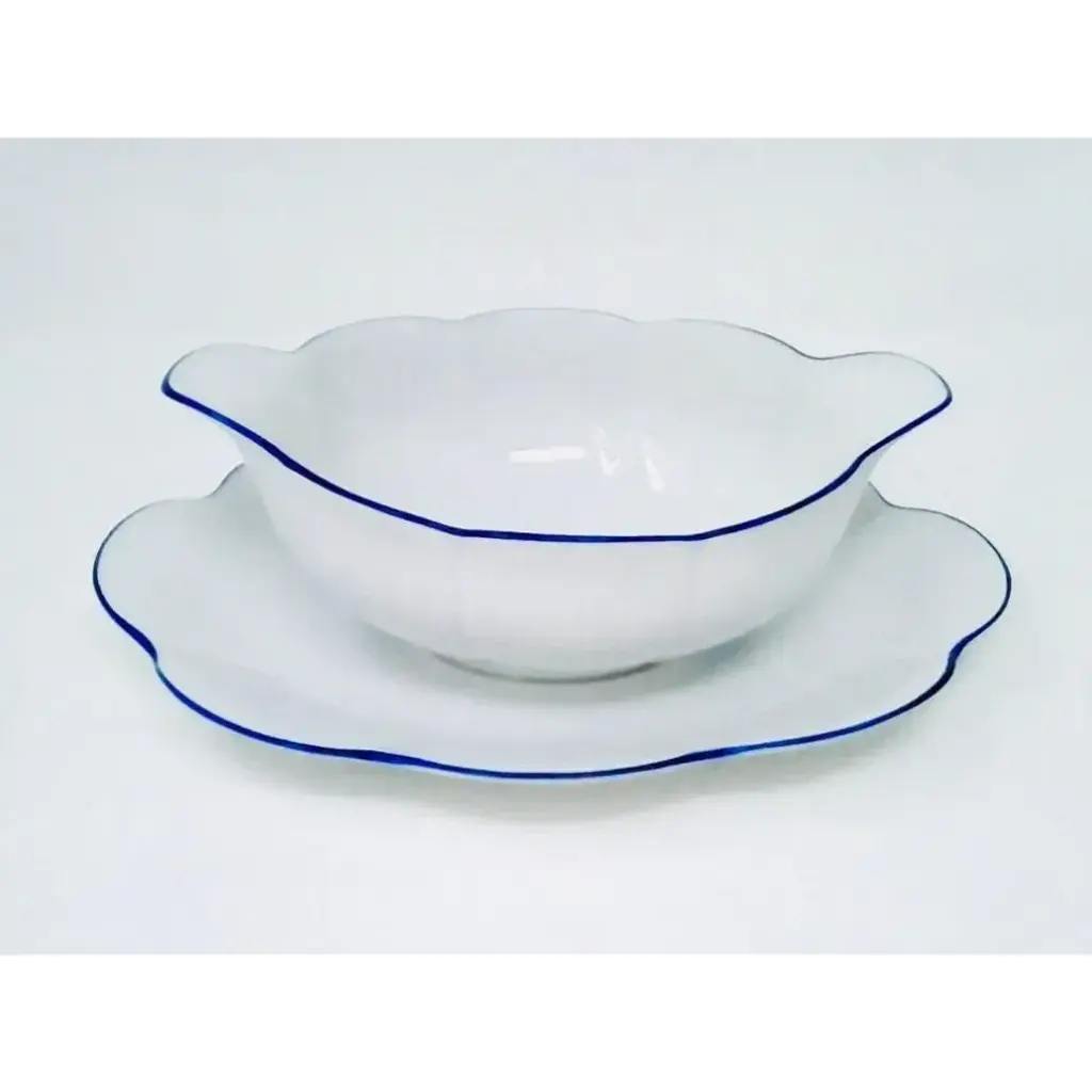 Gien's Filets Cobalt service is a timeless classic characterized by a shell border and handpainted lines. Faience earthenware made in France by Gien. Four-piece place setting includes dinner plate, dessert plate, bowl, and mug. Five-piece place setting includes dinner plate, dessert plate, canape plate, US tea cup, and saucer. Located near the Loire Valley castles, the Faïencerie de Gien has been synonymous with prestigious faience tableware and decorative objects since its founding in 1821. Gien pieces are renowned for their warm white clays decorated with traditional motifs reminiscent of the French countryside.