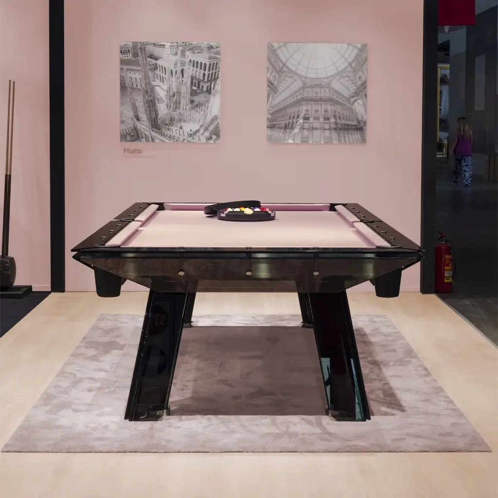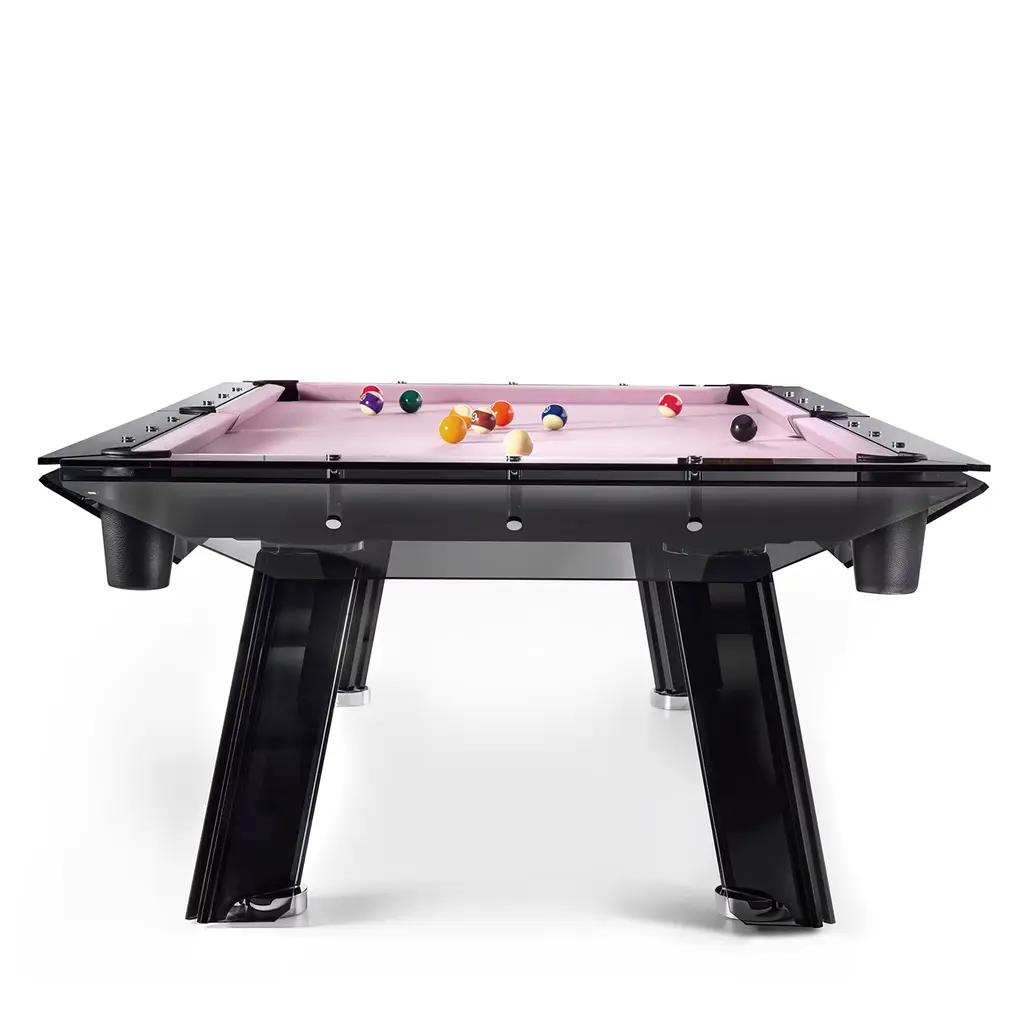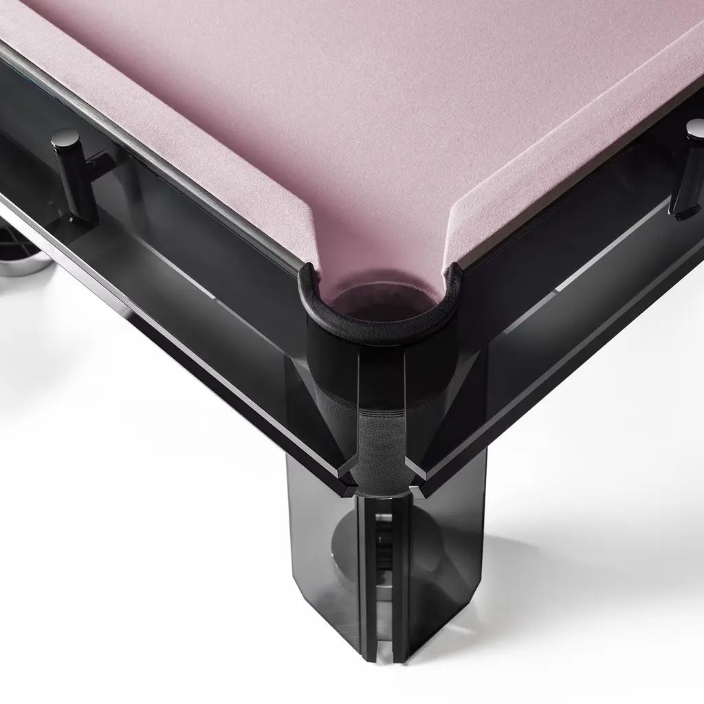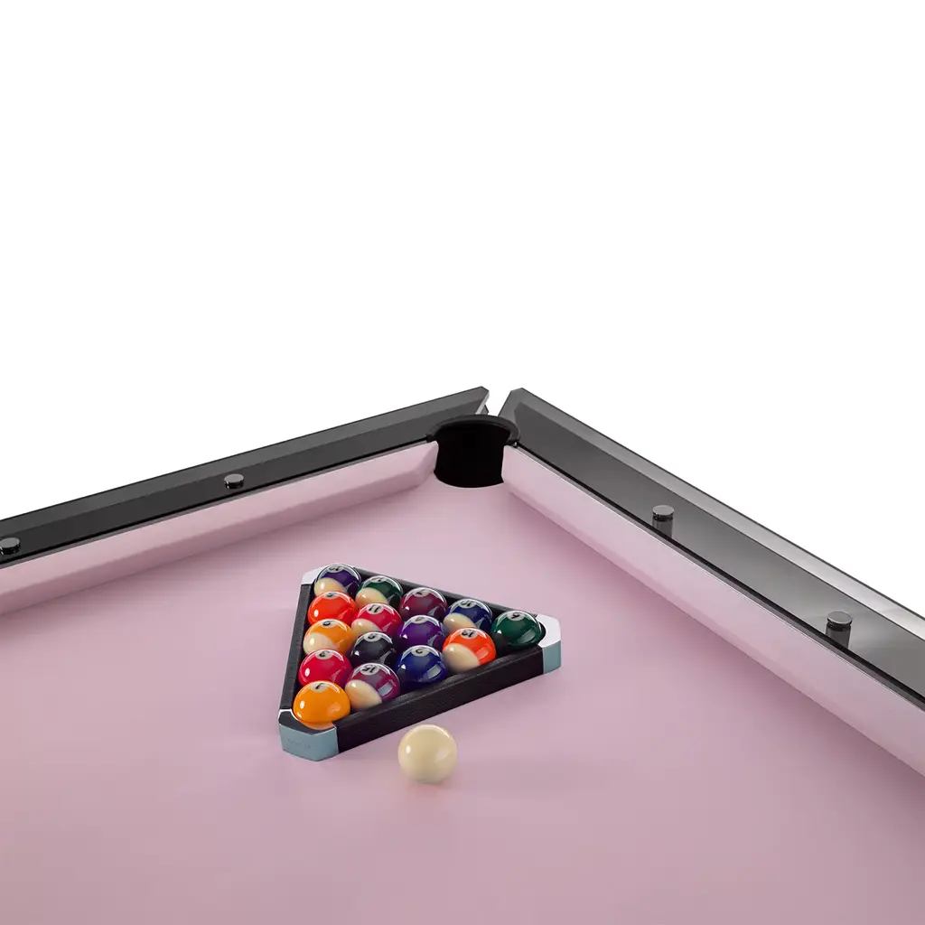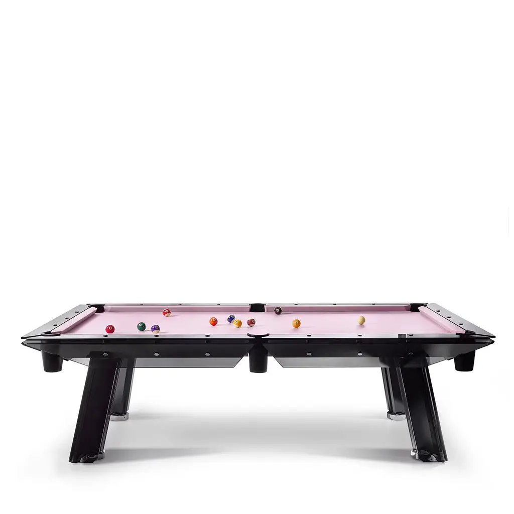 This billiards game captures the game's magic in a luxurious silhouette. The all-black slender steel frame, adjustable, supports the solid slate playing surface in a delicate pink hue, creating a delightful textural and visual contrast. Available in other finishes upon request to the Concierge. Purchase includes 4 pool cues and a black billiards game set with 4 chalks, one leather triangle rack and one professional cue ball set (16 billiard balls).