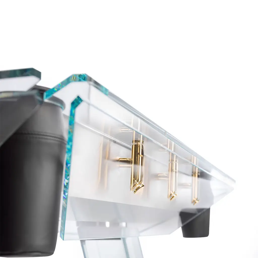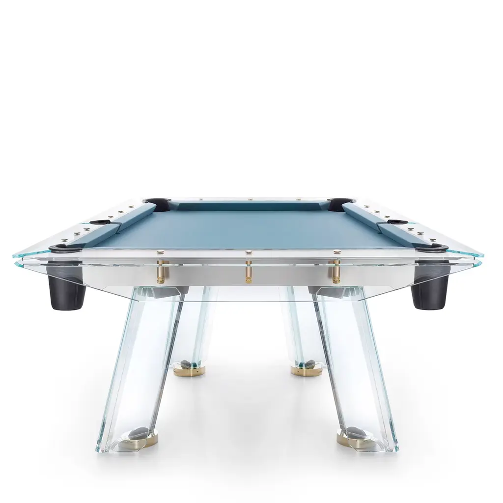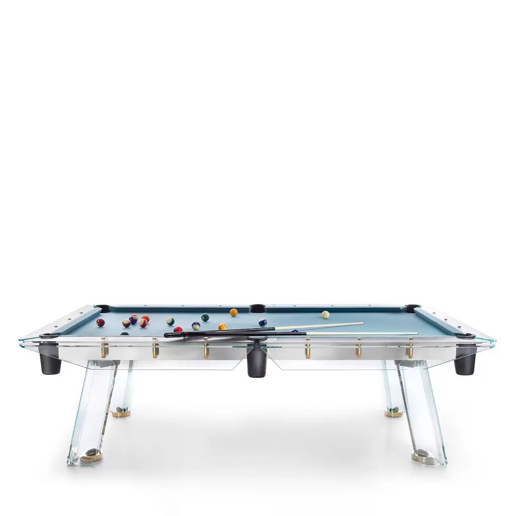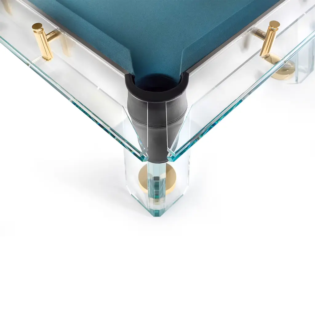 An emblem of leisure and fun, this billiards game will infuse a luxurious touch to game rooms. The magic of the table lies in its clear crystalline frame, revealing the sturdy steel frame and supporting the solid slate table in the classic tournament green hue. 24K gold details elevate the exclusive allure of this piece. Purchase includes 4 pool cues and a black billiards game set with 4 chalks, one leather triangle rack and one professional cue ball set (16 billiard balls).