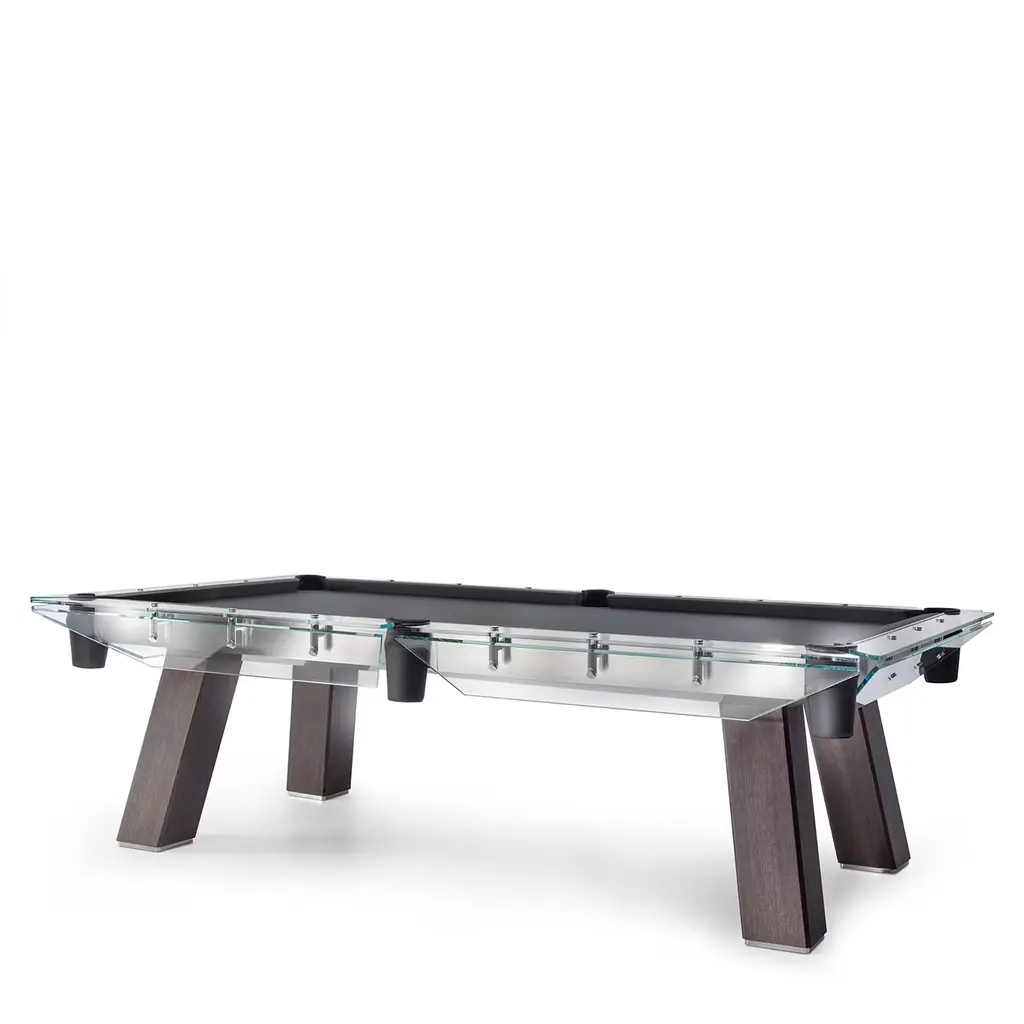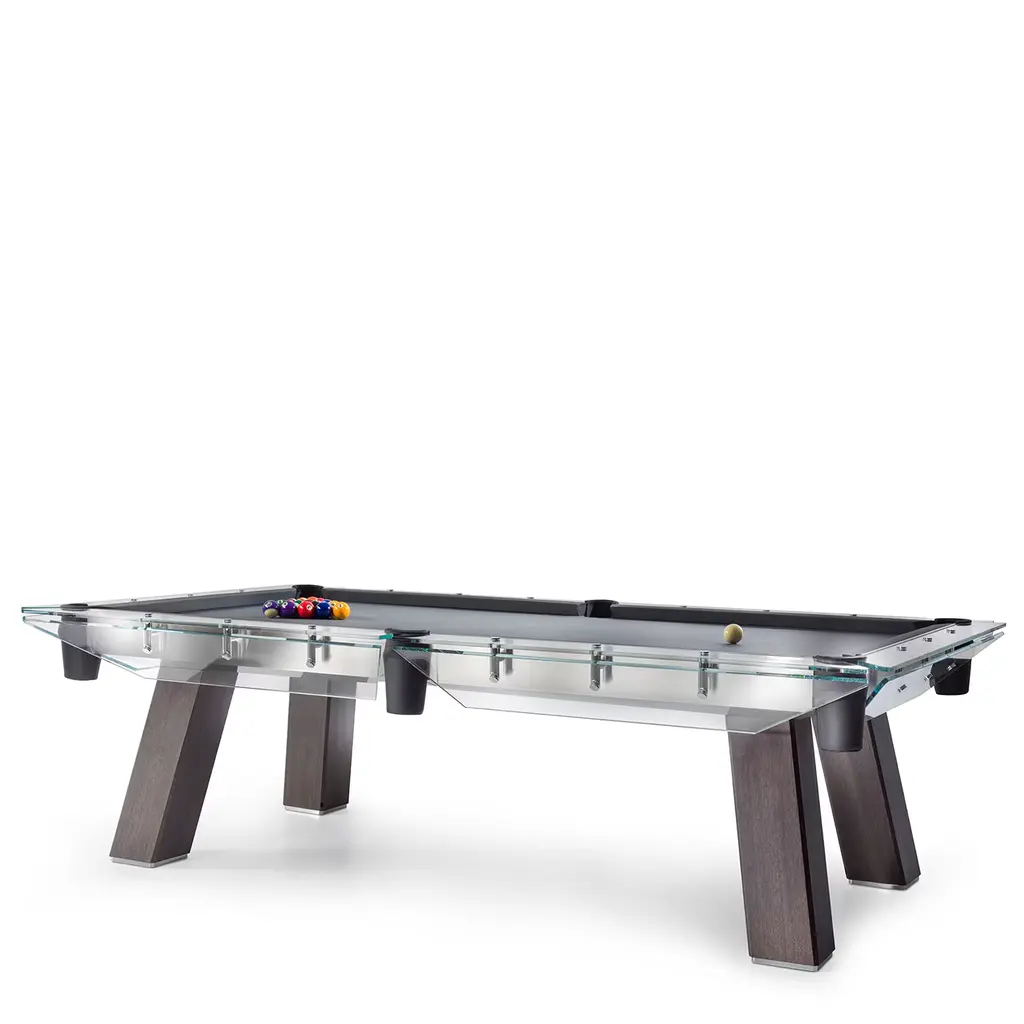 This billiard table features wood details that add a soft, warm touch to its transparent glass exterior. It features a slate tabletop, stainless-steel components, wool cloth covering and genuine leather pockets. Four sticks, a professional cue-ball set with a leather box, and a leather triangle rack are included.
