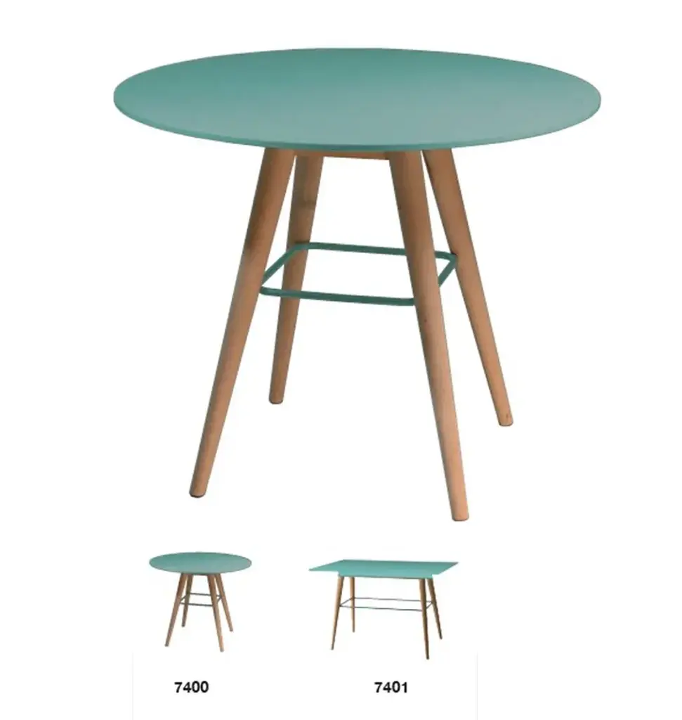 Base with slanted wooden legs natural painted or stained, powdercoated metal ring as support to the frame. Suitable for round or square tops. Version for rectangular tops available also.