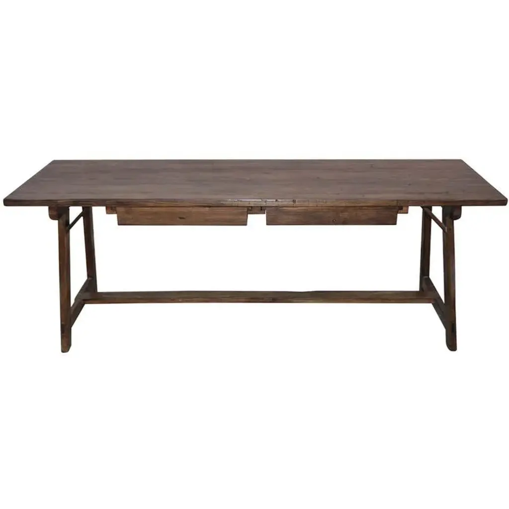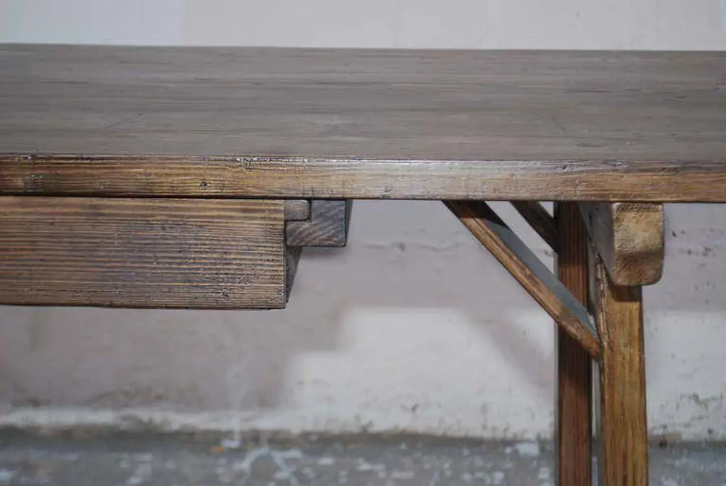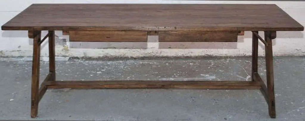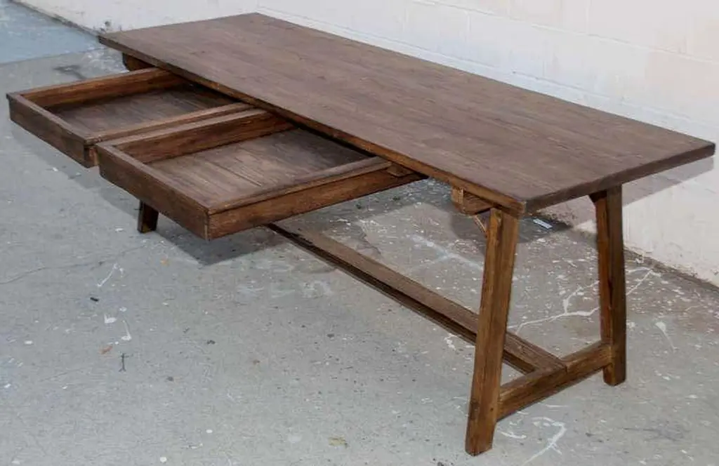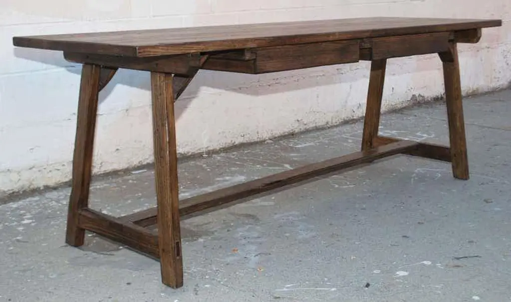 This primitive work table has lots of character. Both sides are symmetrically identical. The two drawers can be pulled out from either side.