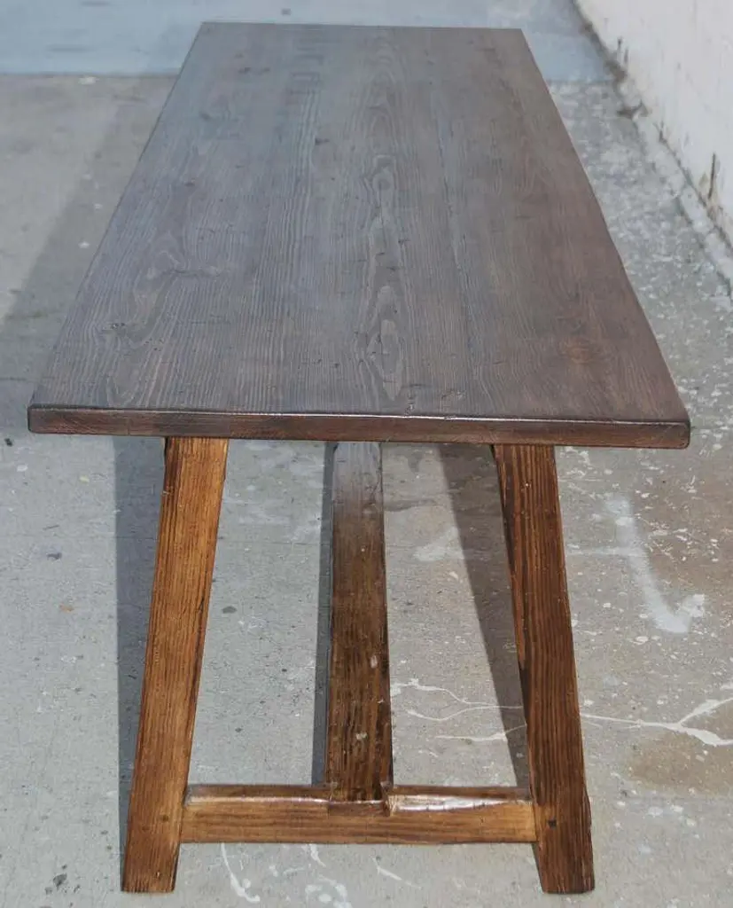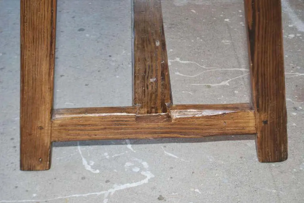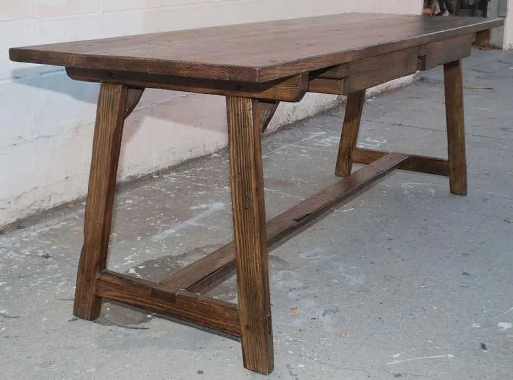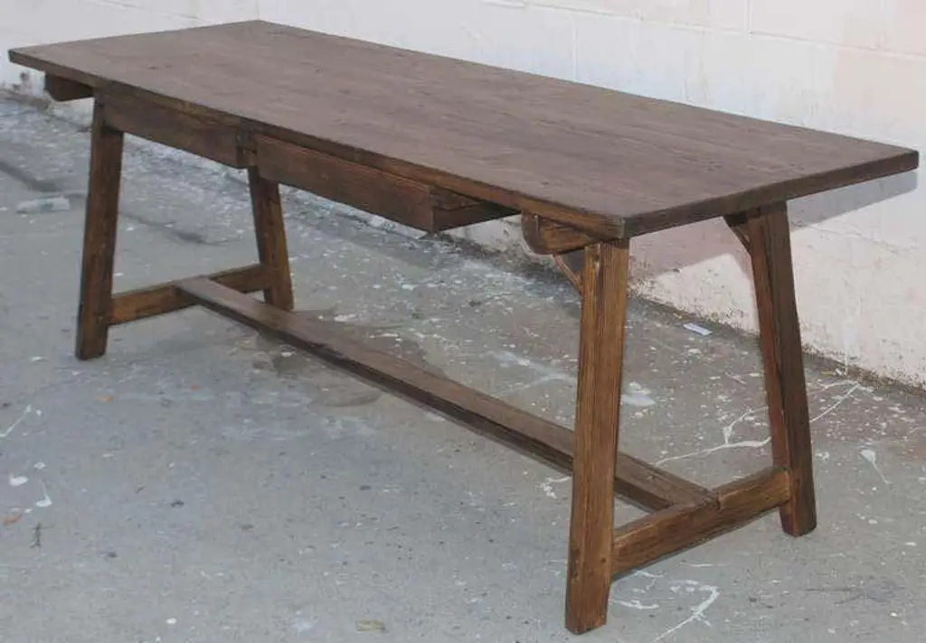 This primitive work table has lots of character. Both sides are symmetrically identical. The two drawers can be pulled out from either side.
