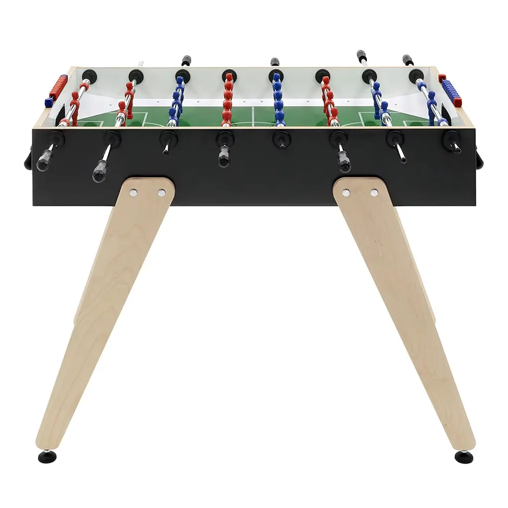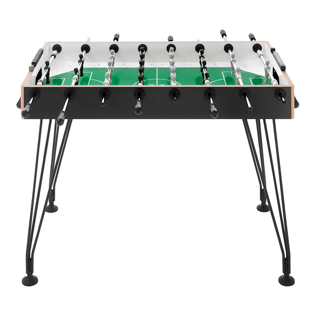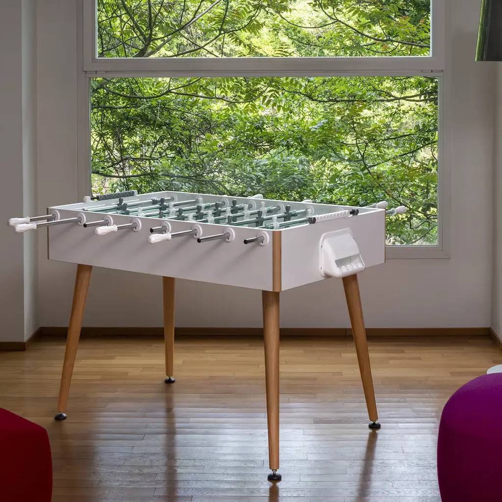Clean and essential lines characterize this foosball table with rounded, beech wood legs, slightly inclined to improve stability. The structure is in HPL covered aspen plywood with 2 mm ABS edge banding; the 1145 x 705 mm pitch is made of tempered glass and green cardboard. Suitable for indoor use only. Made by Basaglia + Rota Nodari. Telescoping poles available upon request.