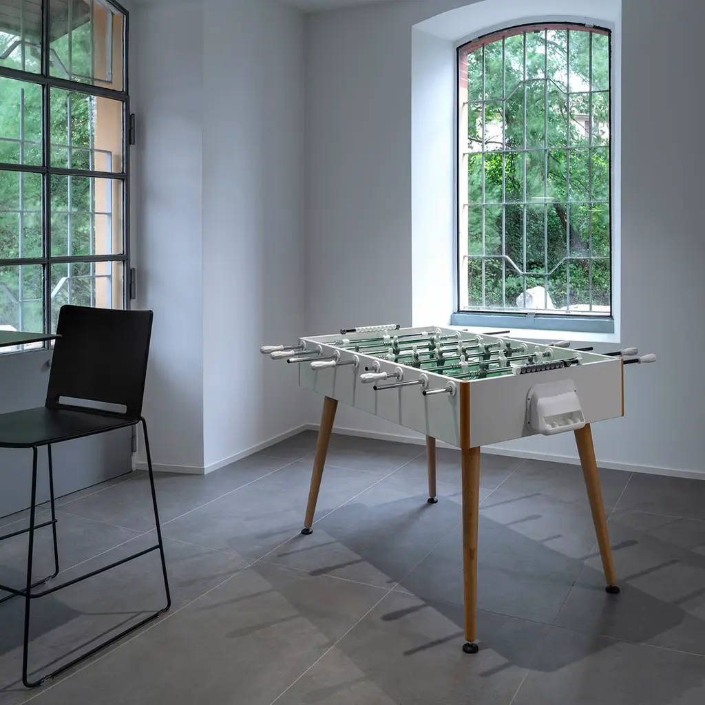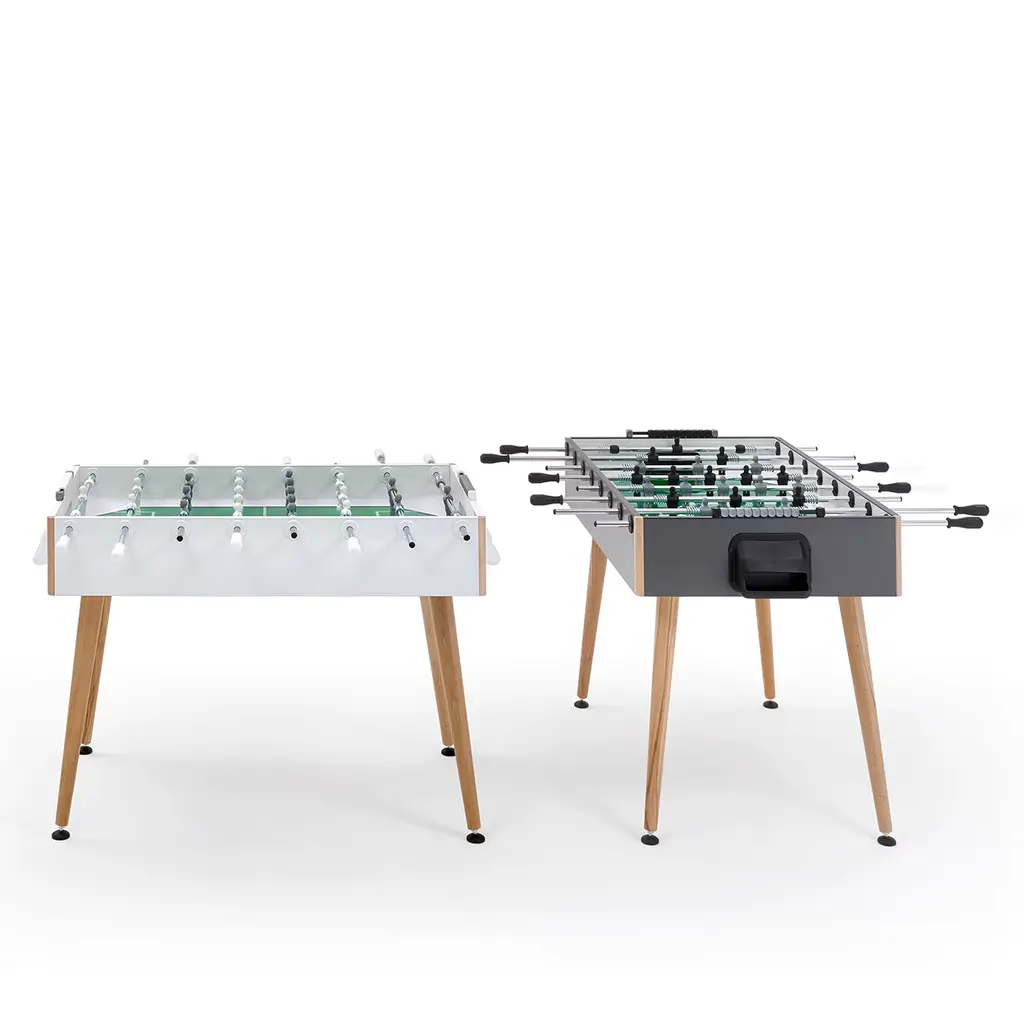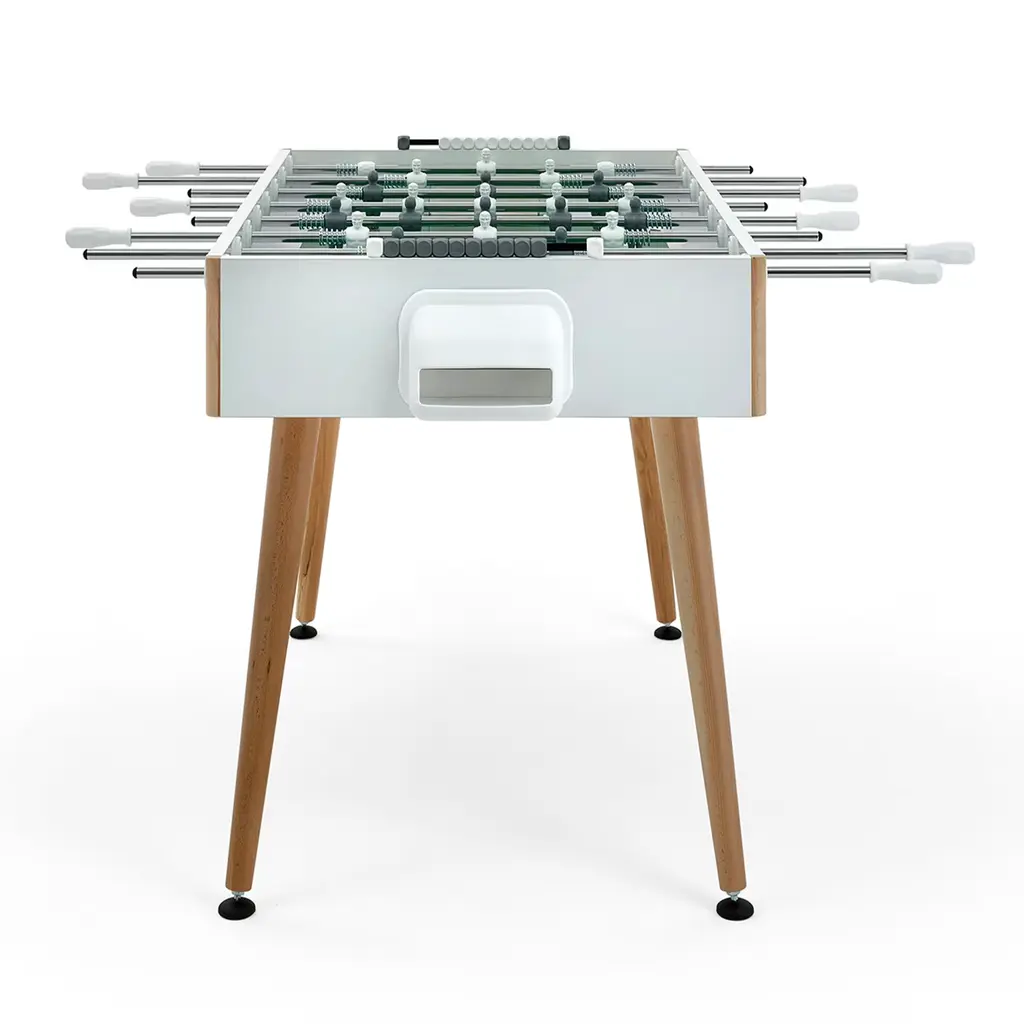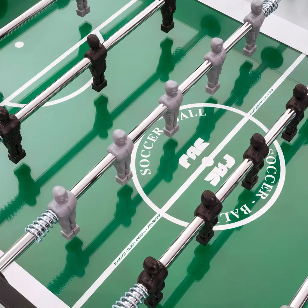 Clean and essential lines characterize this foosball table with rounded, beech wood legs, slightly inclined to improve stability. The structure is in HPL covered aspen plywood with 2 mm ABS edge banding; the 1145 x 705 mm pitch is made of tempered glass and green cardboard. Suitable for indoor use only. Made by Basaglia + Rota Nodari. Telescoping poles available upon request.