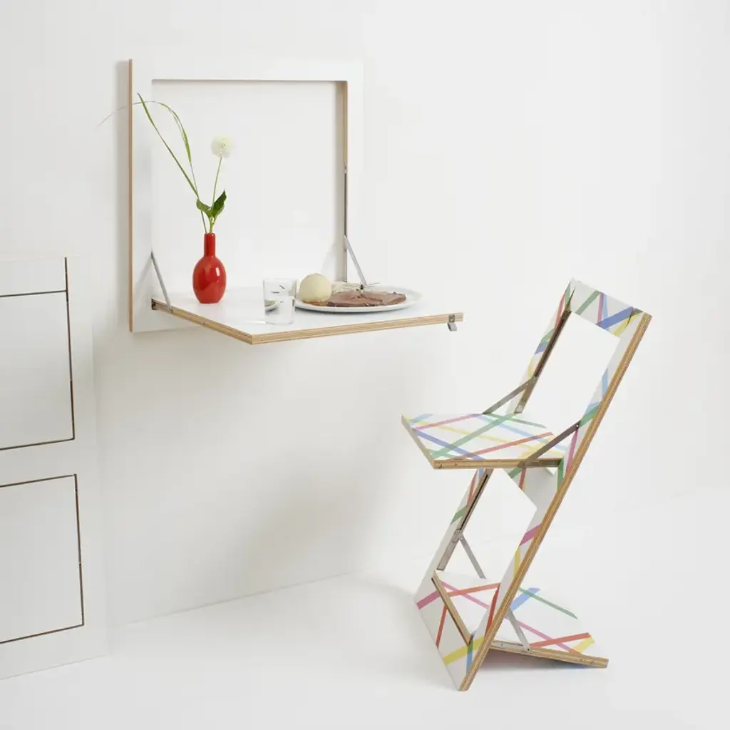 This small folding table can show off its strength whenever space is limited.Material: birch plywood, stainless steelDimensions:Folded 60 x 60 x 2 cm + 1 cm wall mountTable unfolded: 50 x 50 cmFinish: Lacquer