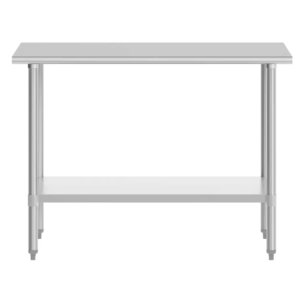 Give yourself some extra space for catering parties or setting up the buffet line at your eatery or bistro and increase functionality in your busy restaurant kitchen with this commercial kitchen prep and work table with adjustable undershelf. This steel commercial work table is a great space for bulk food preparation for businesses such as daycares, hotels and restaurants. This versatile steel table can be placed against a wall or used as a freestanding kitchen island. Strength and durability are important factors when choosing equipment. Made from quality stainless steel, this metal utility table resists corrosion and holds up to 600 lbs. weight capacity while the undershelf holds up to 200 lbs. This commercial grade work table is certified to NSF quality standards reducing the chance of foodborne illness. Not only for kitchen use, this stainless prep table can be used in an outdoor kitchen away from the elements on a covered patio or deck, as a planting station in your greenhouse or a work surface in your garage. Rounded corners prevent scrapes and cuts and this multi-use work table easily assembles in under 10 minutes with the included tools. Adjustable feet move up to 1" to keep you level on uneven flooring. Remove any traces of food contaminants with water and a neutral detergent followed by a dry cloth to keep this shiny piece looking new