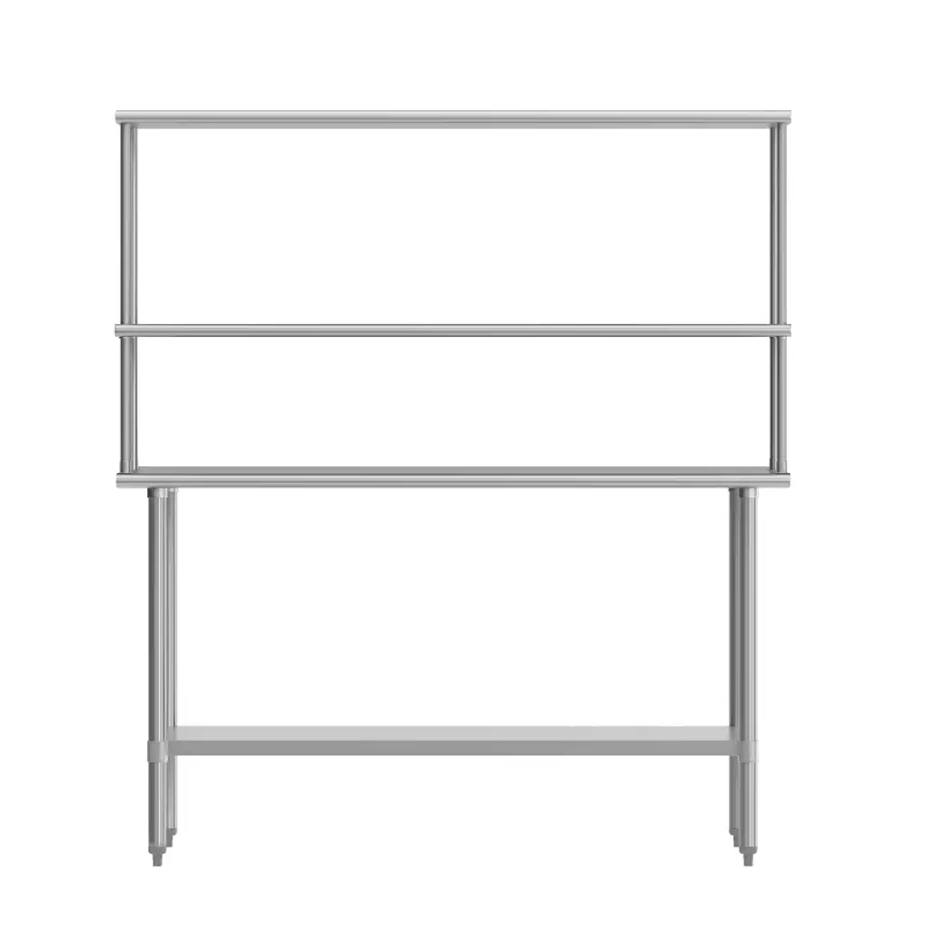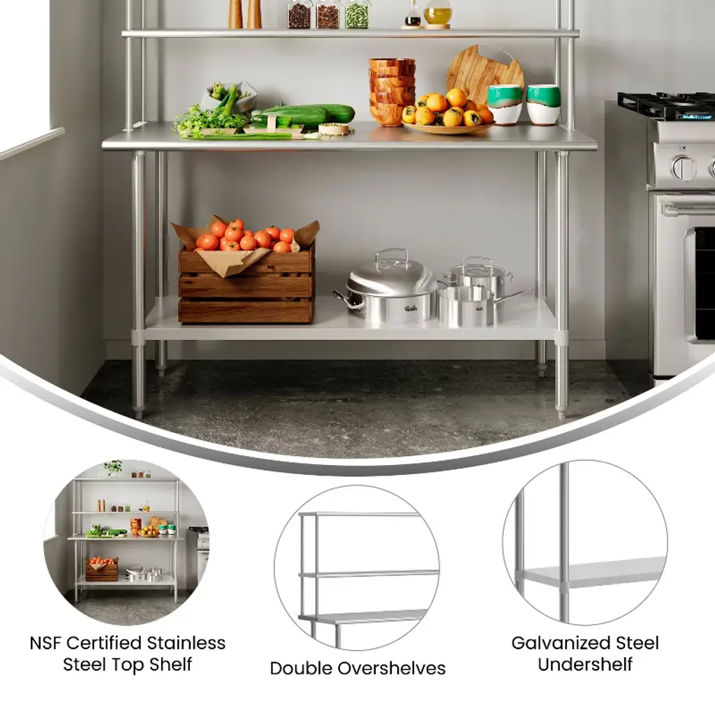 Give yourself some extra space for catering parties or setting up the buffet line at your eatery or bistro and increase functionality in your busy restaurant kitchen with this 24" x 60" commercial kitchen prep and work table with double overshelves, dual galvanized steel undershelf and casters. This steel commercial work table is a great space for bulk food preparation for businesses such as daycares, hotels and restaurants. The casters allow this versatile steel table to be placed against a wall or used as a freestanding kitchen island and 2 of the casters lock to keep the table where you want it. Strength and durability are important factors when choosing equipment. Made from quality materials, this metal utility table resists corrosion and holds up to 600 lbs. weight capacity while the undershelf holds up to 200 lbs. This commercial grade work table is certified to NSF quality standards reducing the chance of foodborne illness. Not only for kitchen use, this stainless prep table can be used in an outdoor kitchen away from the elements on a covered patio or deck, as a planting station in your greenhouse or a work surface in your garage. Rounded corners prevent scrapes and cuts and this multi-use work table easily assembles in under 10 minutes with the included tools. Remove any traces of food contaminants with water and a neutral detergent followed by a dry cloth to keep this shiny piece looking new.
