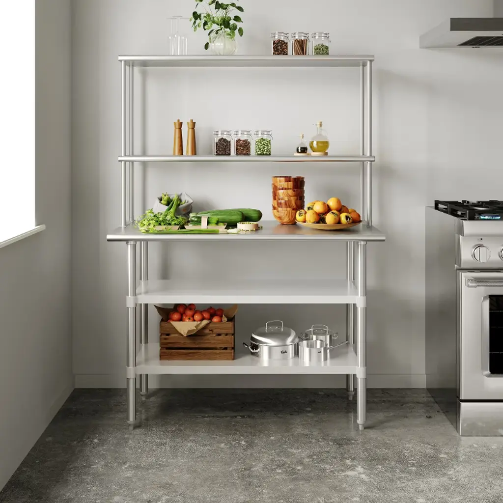 Give yourself some extra space for catering parties or setting up the buffet line at your eatery or bistro and increase functionality in your busy restaurant kitchen with this 30" x 72" commercial kitchen prep and work table with double overshelves, dual galvanized steel undershelves and casters. This steel commercial work table is a great space for bulk food preparation for businesses such as daycares, hotels and restaurants. The casters allow this versatile steel table to be placed against a wall or used as a freestanding kitchen island and 2 of the casters lock to keep the table where you want it. Strength and durability are important factors when choosing equipment. Made from quality materials, this metal utility table resists corrosion and holds up to 600 lbs. weight capacity while the undershelves hold up to 200 lbs. each. This commercial grade work table is certified to NSF quality standards reducing the chance of foodborne illness. Not only for kitchen use, this stainless prep table can be used in an outdoor kitchen away from the elements on a covered patio or deck, as a planting station in your greenhouse or a work surface in your garage. Rounded corners prevent scrapes and cuts and this multi-use work table easily assembles in under 10 minutes with the included tools. Remove any traces of food contaminants with water and a neutral detergent followed by a dry cloth to keep this shiny piece looking new.