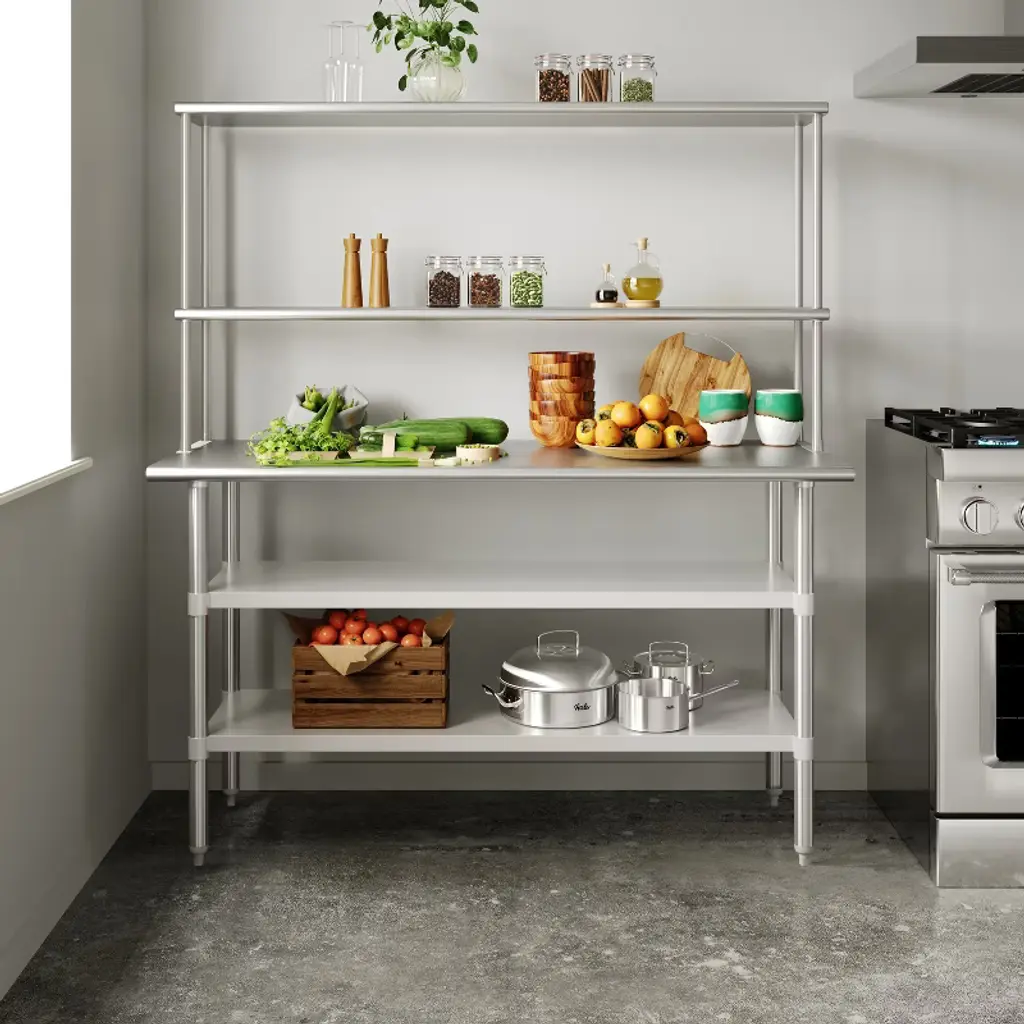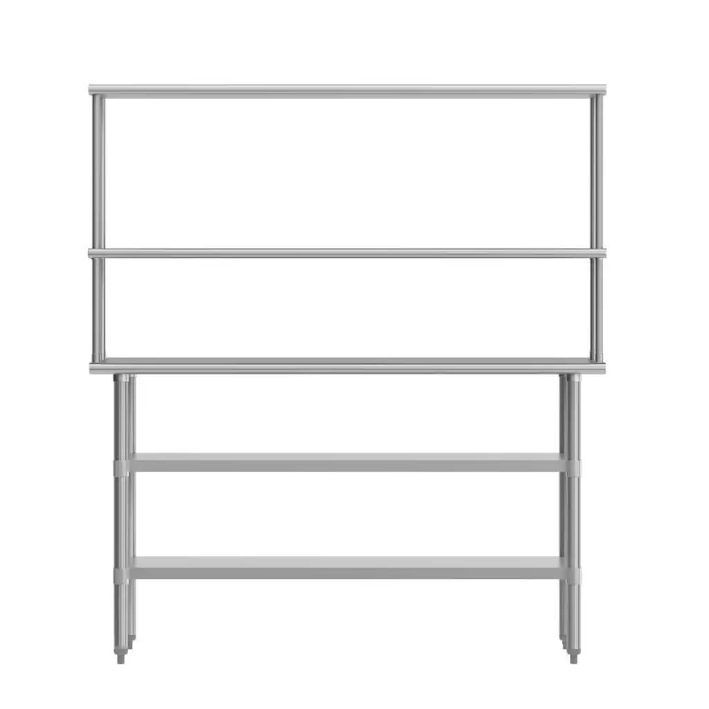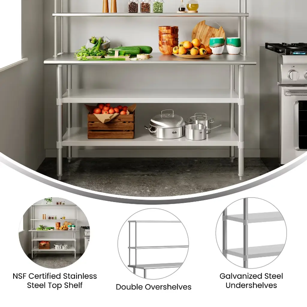 Give yourself some extra space for catering parties or setting up the buffet line at your eatery or bistro and increase functionality in your busy restaurant kitchen with this 30" x 72" commercial kitchen prep and work table with double overshelves, dual galvanized steel undershelves and casters. This steel commercial work table is a great space for bulk food preparation for businesses such as daycares, hotels and restaurants. The casters allow this versatile steel table to be placed against a wall or used as a freestanding kitchen island and 2 of the casters lock to keep the table where you want it. Strength and durability are important factors when choosing equipment. Made from quality materials, this metal utility table resists corrosion and holds up to 600 lbs. weight capacity while the undershelves hold up to 200 lbs. each. This commercial grade work table is certified to NSF quality standards reducing the chance of foodborne illness. Not only for kitchen use, this stainless prep table can be used in an outdoor kitchen away from the elements on a covered patio or deck, as a planting station in your greenhouse or a work surface in your garage. Rounded corners prevent scrapes and cuts and this multi-use work table easily assembles in under 10 minutes with the included tools. Remove any traces of food contaminants with water and a neutral detergent followed by a dry cloth to keep this shiny piece looking new.
