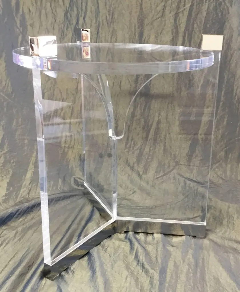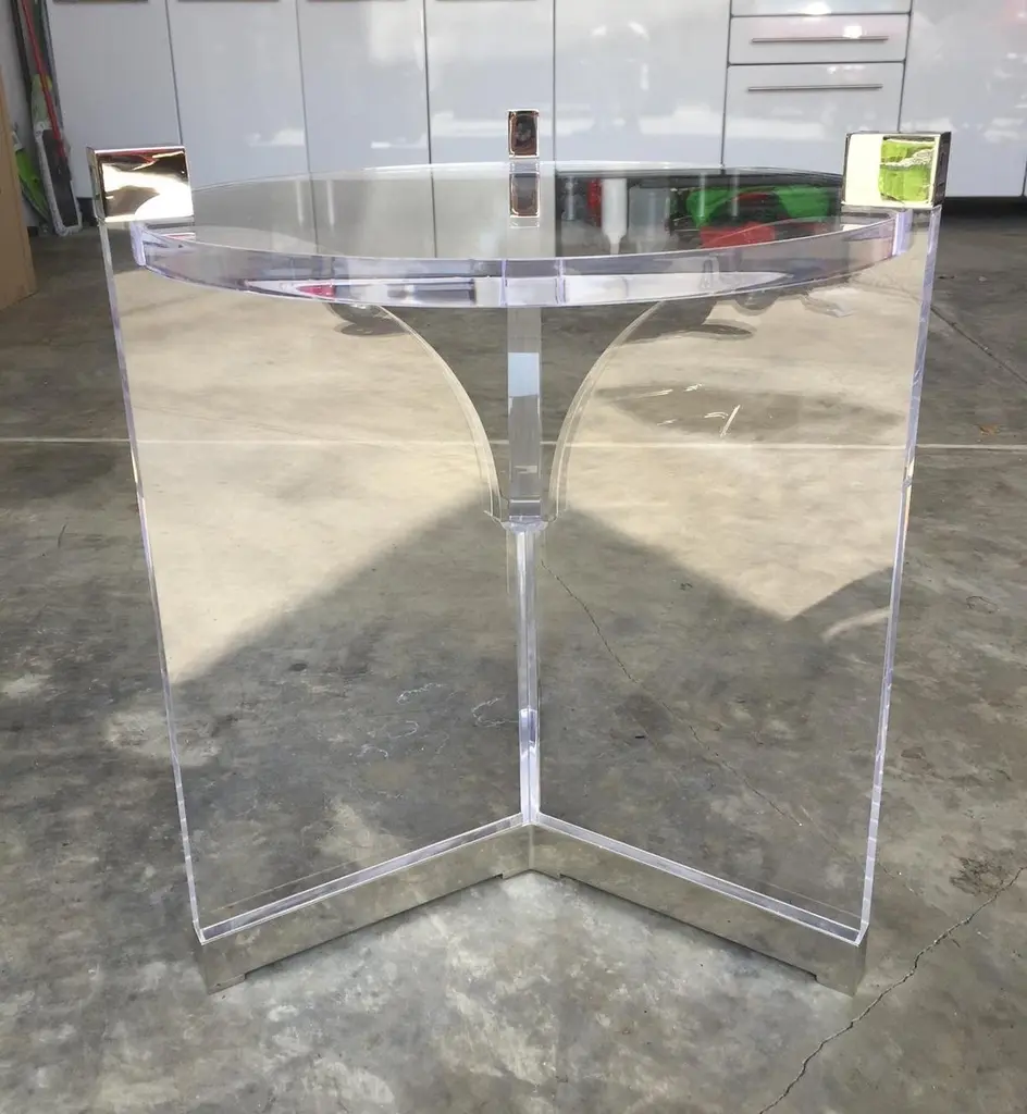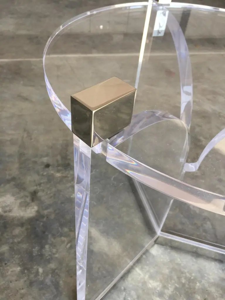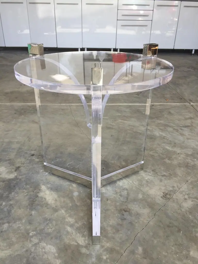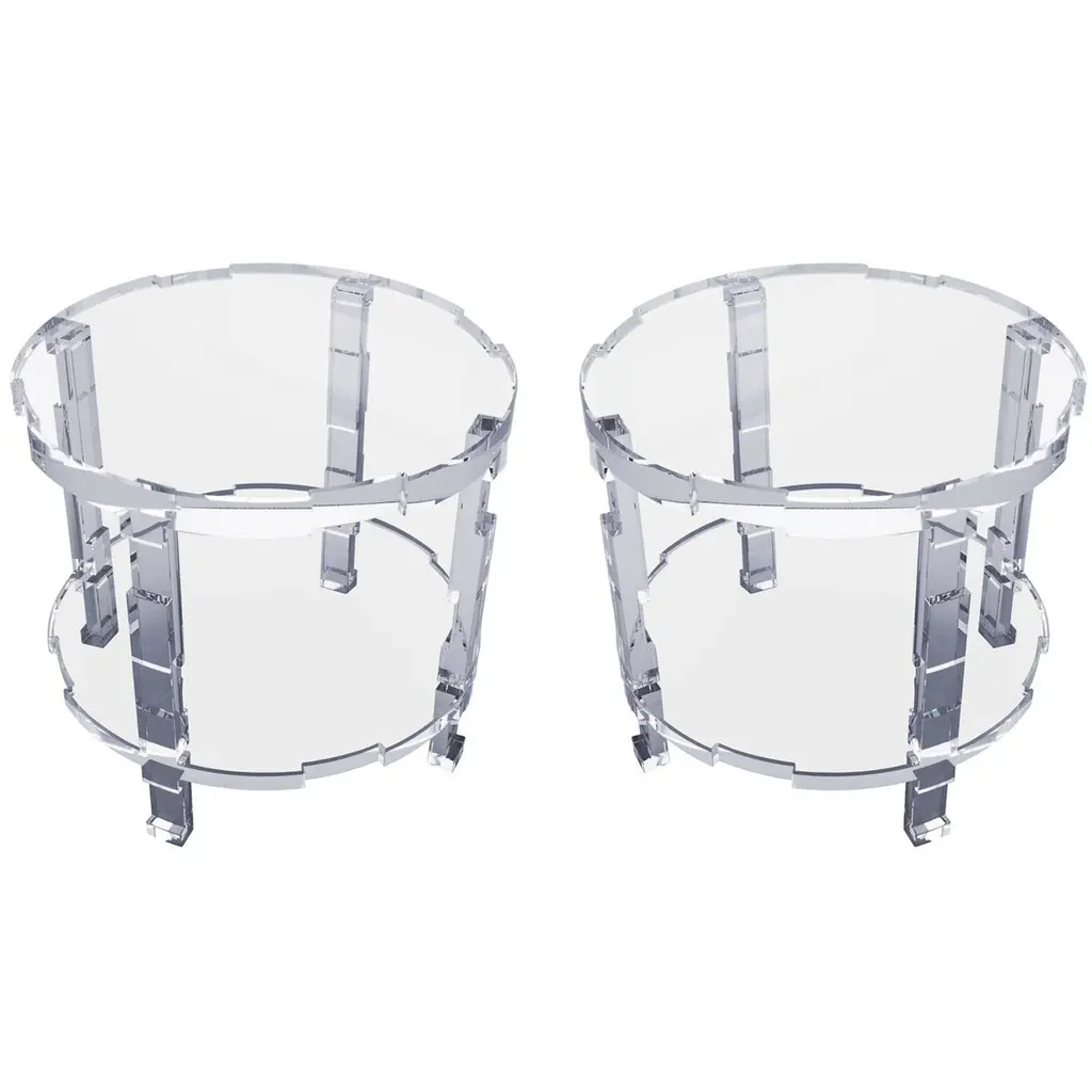 Stunning pair of occasional tables in Lucite and polished nickel designed and manufactured my Charles Hollis Jones in the mid-1970s.The tables are very delicate to the eye and yet very imposing in design appeal, they combination of metal is perfect and the execution out of this world.Two sizes are available.Measures: 19" diameter x 22 1/4" high.