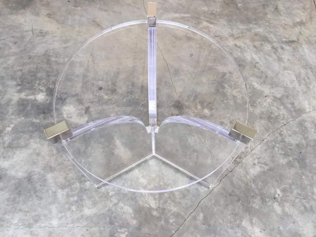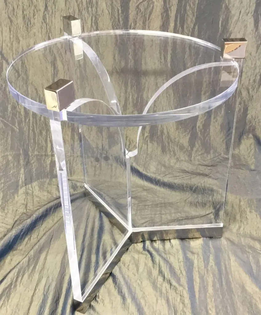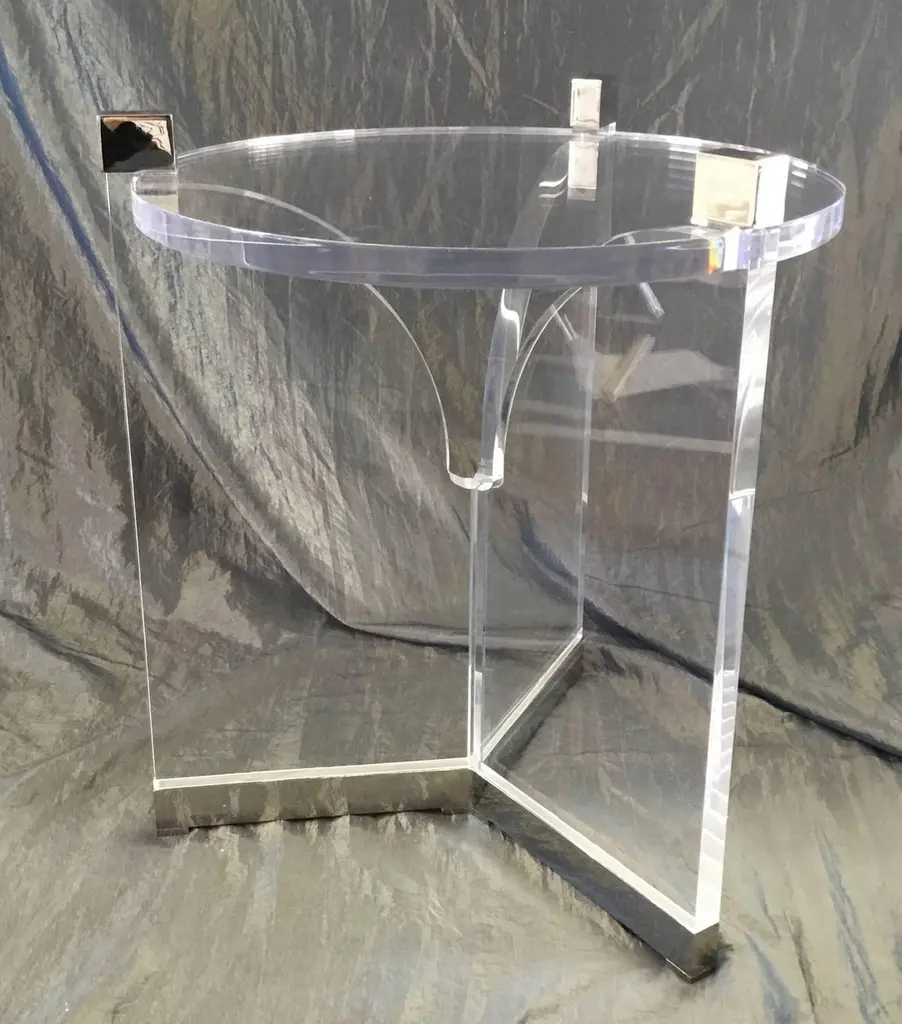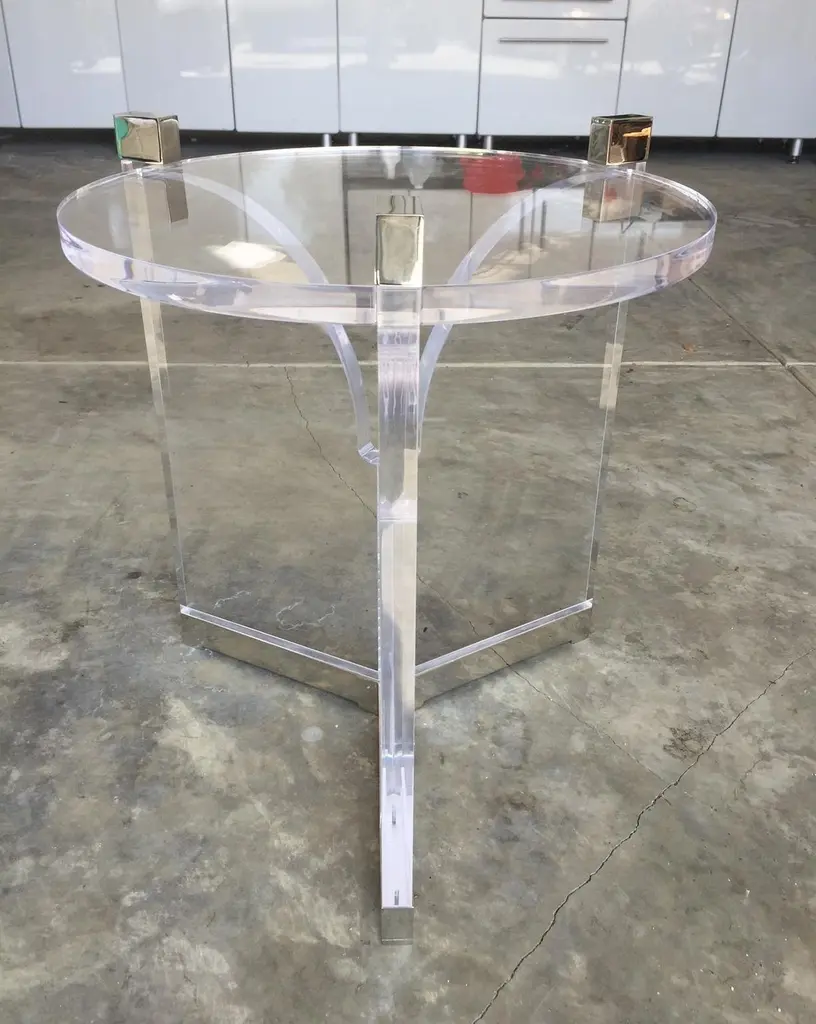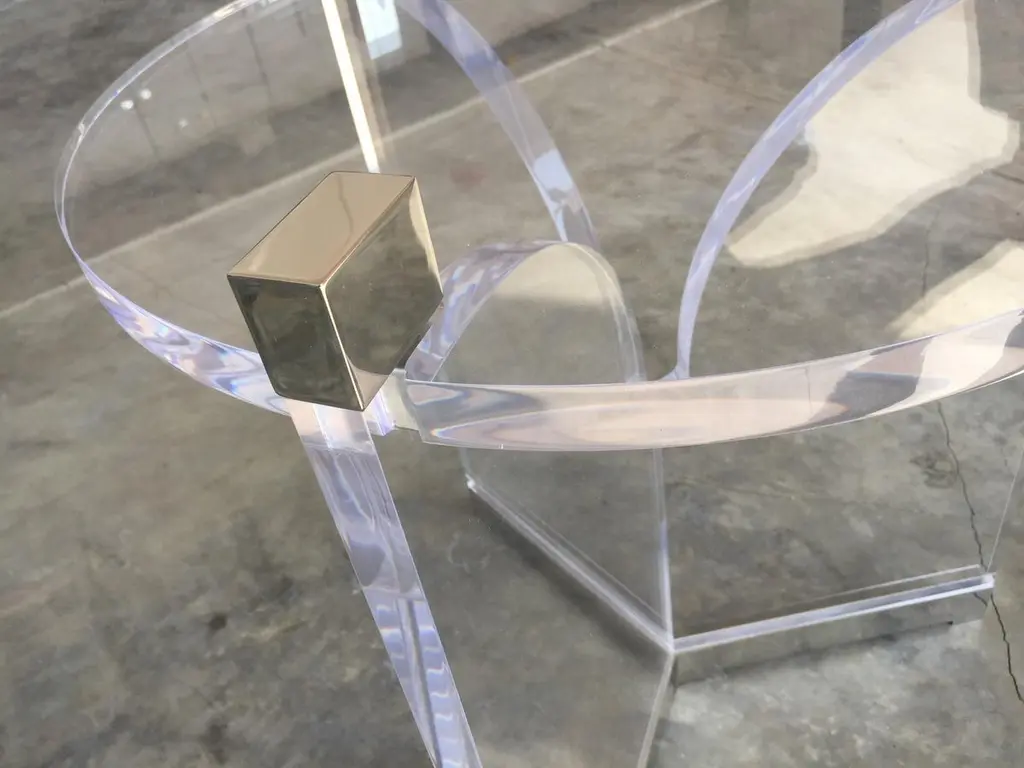Stunning pair of occasional tables in Lucite and polished nickel designed and manufactured my Charles Hollis Jones in the mid-1970s.The tables are very delicate to the eye and yet very imposing in design appeal, they combination of metal is perfect and the execution out of this world.Two sizes are available.Measures: 19" diameter x 22 1/4" high.