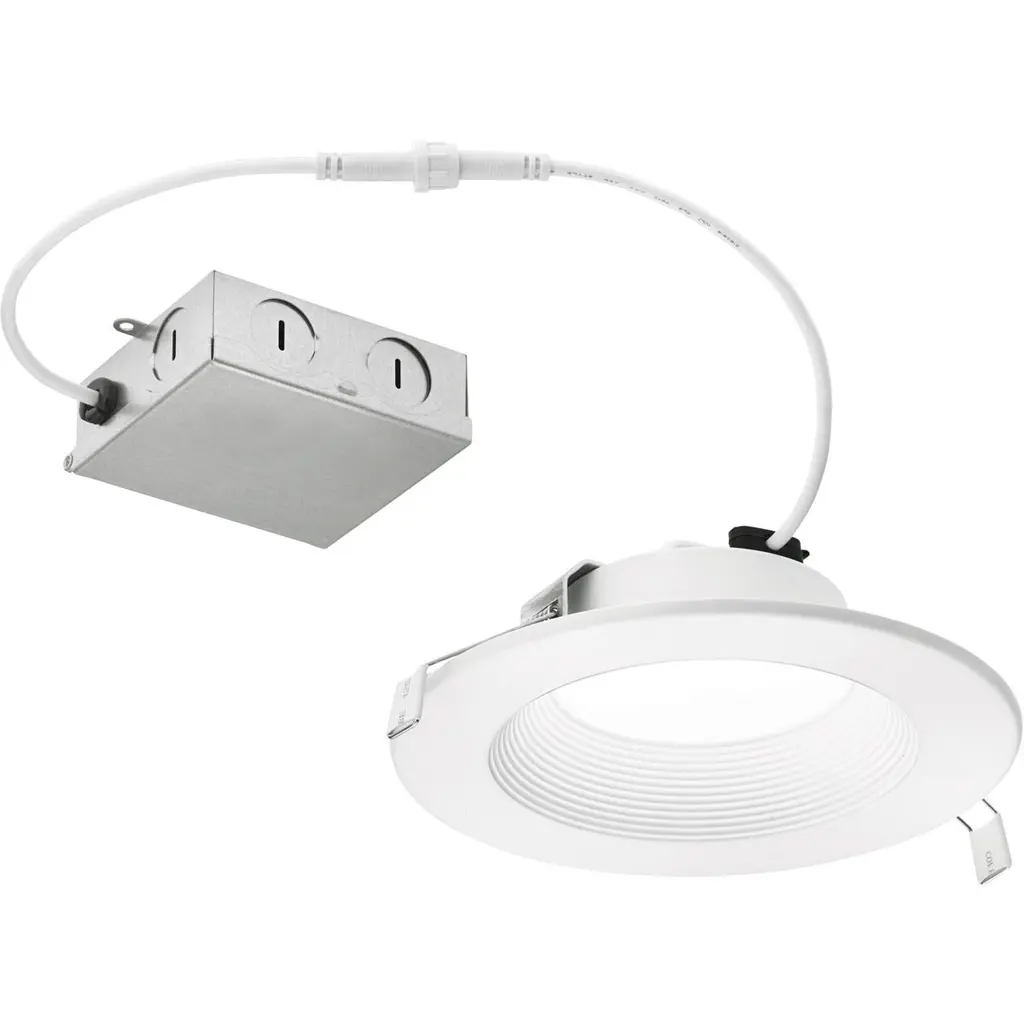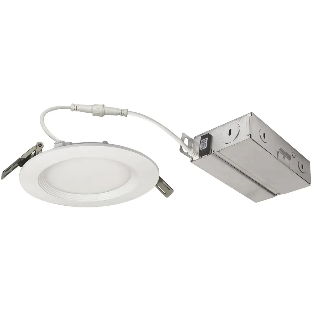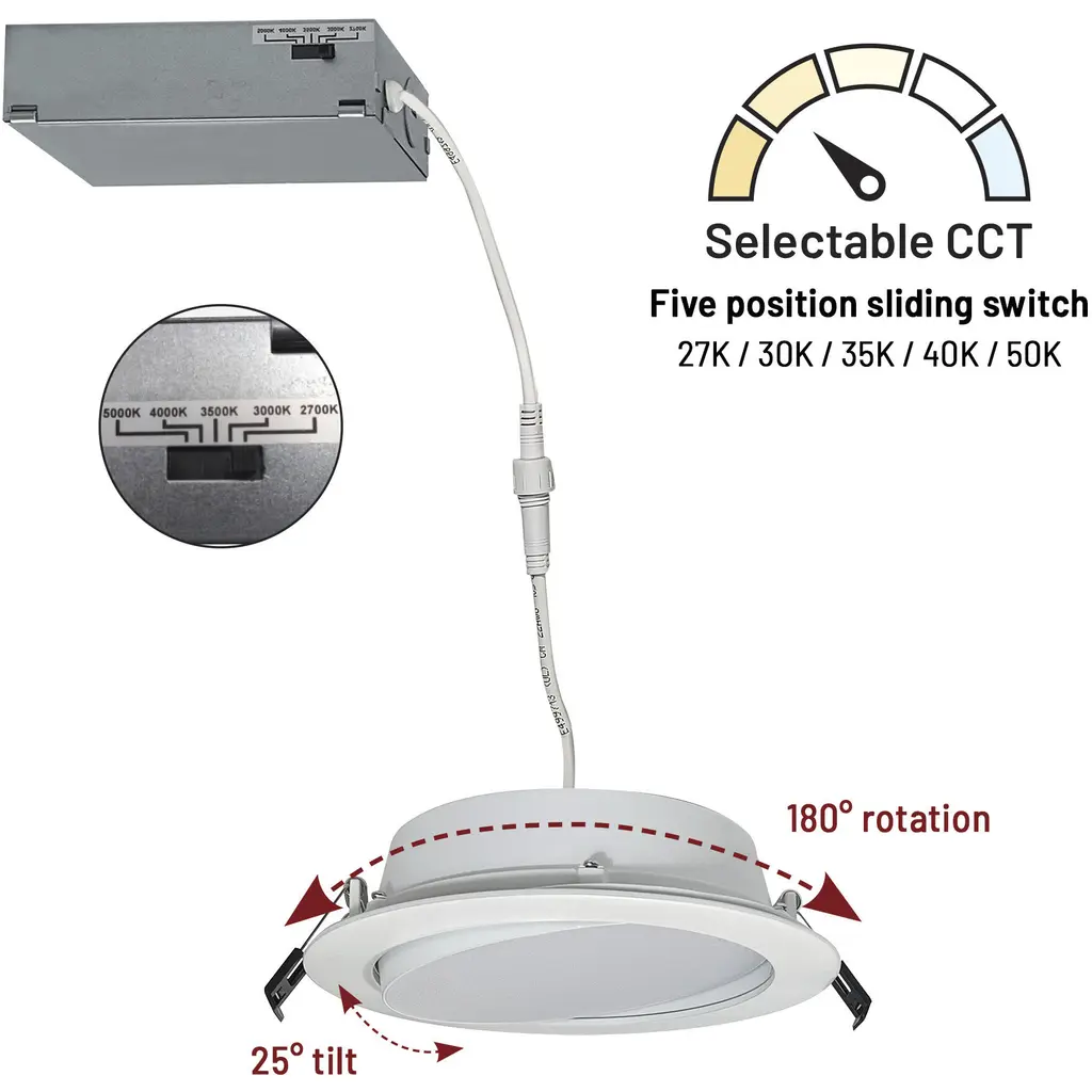 6" FLIN adjustable can-less LED downlights feature two-axis rotation with 25 tilt and 180 rotation. Can-less downlights are easy to install in new construction or remodel applications. Luminaires include a selectable color temperature switch located on the junction box of each luminaire with a quick connect that allows for easy disconnect and mounting in the ceiling. . Adjustment 25 tilt / 180 rotation . Input Voltage 120V . Lumens / Wattage 1100lm / 13.5W . Color Temperature Selectable CCT (27K/30K/35K/40K/50K) . Color Rendering Index 90+ CRI . Dimming Triac or ELV . Finish Matte Powder White . Listing cETLus Listed for Wet Locations.