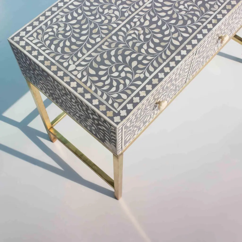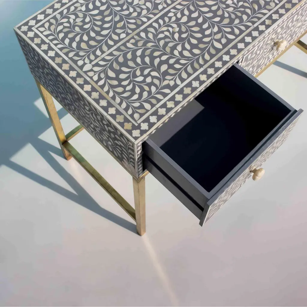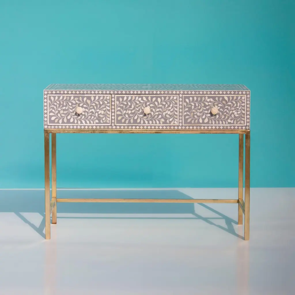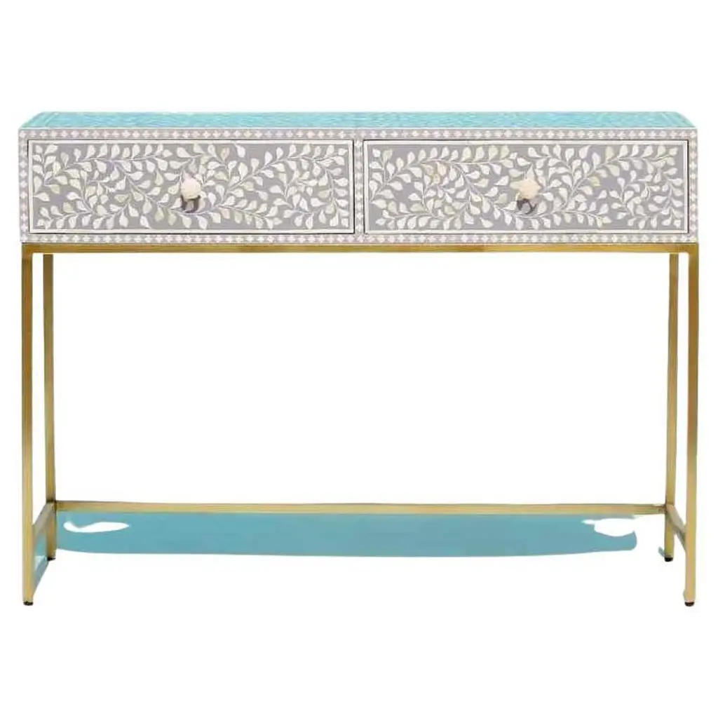Elevate your home with our stunning bone inlay console table, a timeless masterpiece that seamlessly blends old-world charm with modern elegance. Intricately adorned with four leaf flower patterns, this table is a tribute to the ancient art of decorated furniture, expertly crafted using the traditional method of bone inlay.Handmade with meticulous care, each table exudes a sense of luxury and sophistication, making it a must-have addition to any space. The brass finish metal table stand adds a touch of opulence, while the three drawers provide both style and functionality.To ensure safety during transit, we pack the knobs separately, guaranteeing that your console table arrives in pristine condition. Embrace the fusion of history and contemporary design – transform your space with our exquisite bone inlay console table.Product Details:- Exquisite bone inlay console table adorned with intricate four leaf flower patterns- Handcrafted using the traditional method of bone inlay- Brass finish metal table stand for added elegance- Three drawers for convenient storage- Knobs packed separately for safety during transitBring a touch of luxury to your home with our stunning bone inlay console table – where timeless beauty meets modern sophistication.