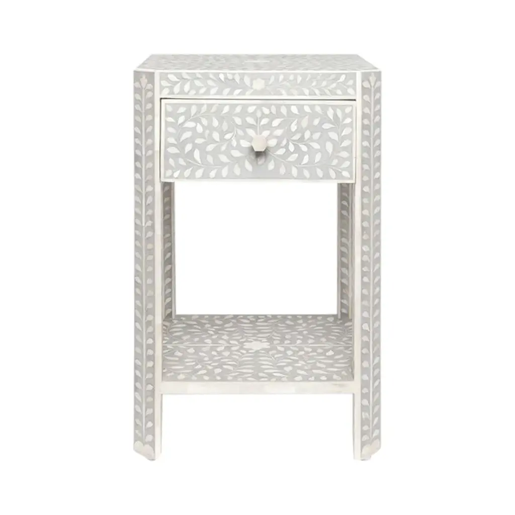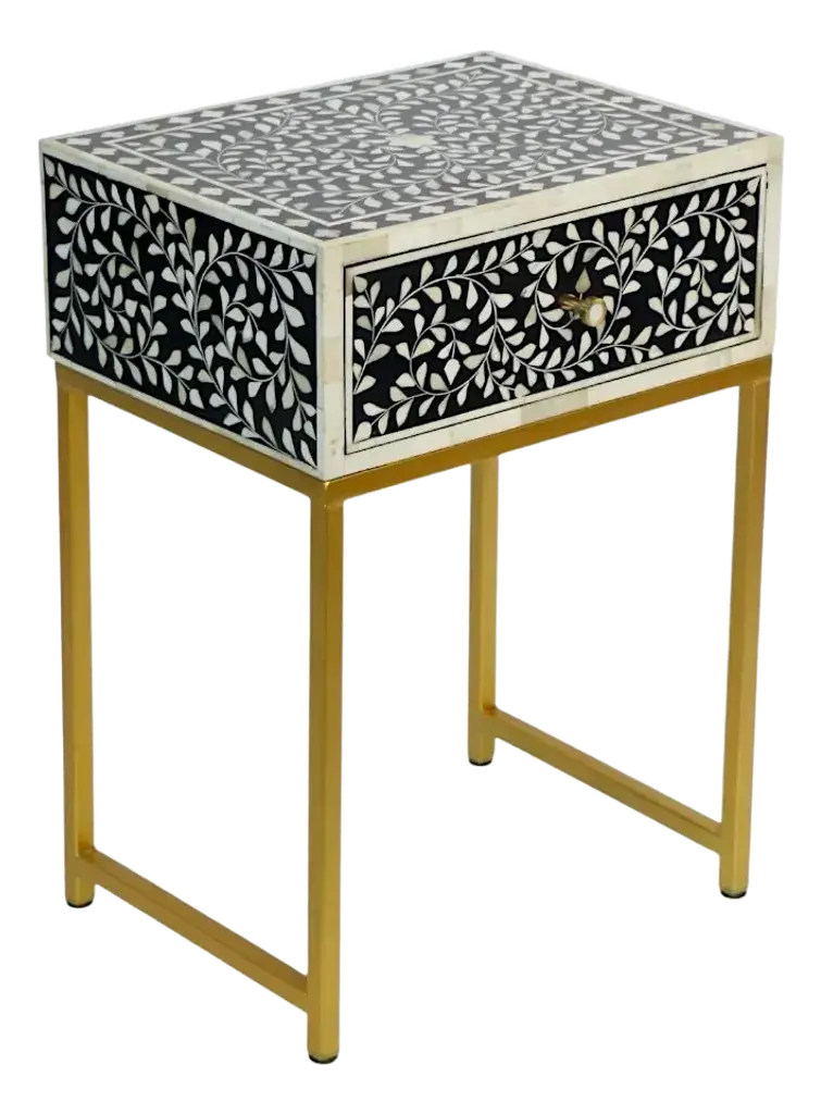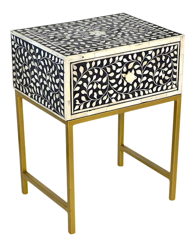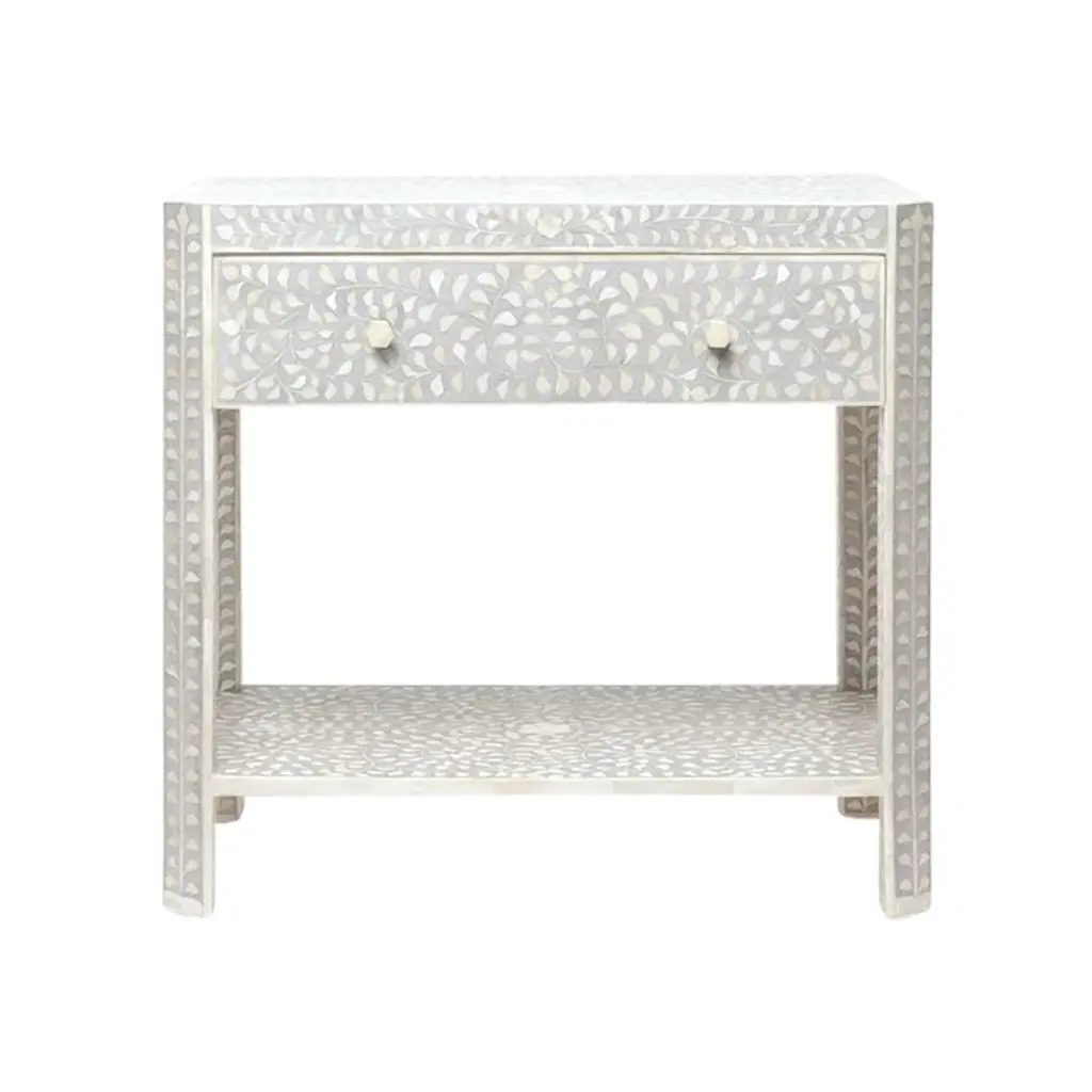 Elevate your home with our stunning bone inlay console table, a timeless masterpiece that seamlessly blends old-world charm with modern elegance. Intricately adorned with four leaf flower patterns, this table is a tribute to the ancient art of decorated furniture, expertly crafted using the traditional method of bone inlay.Handmade with meticulous care, each table exudes a sense of luxury and sophistication, making it a must-have addition to any space. The brass finish metal table stand adds a touch of opulence, while the three drawers provide both style and functionality.To ensure safety during transit, we pack the knobs separately, guaranteeing that your console table arrives in pristine condition. Embrace the fusion of history and contemporary design – transform your space with our exquisite bone inlay console table.Product Details:- Exquisite bone inlay console table adorned with intricate four leaf flower patterns- Handcrafted using the traditional method of bone inlay- Brass finish metal table stand for added elegance- Three drawers for convenient storage- Knobs packed separately for safety during transitBring a touch of luxury to your home with our stunning bone inlay console table – where timeless beauty meets modern sophistication.