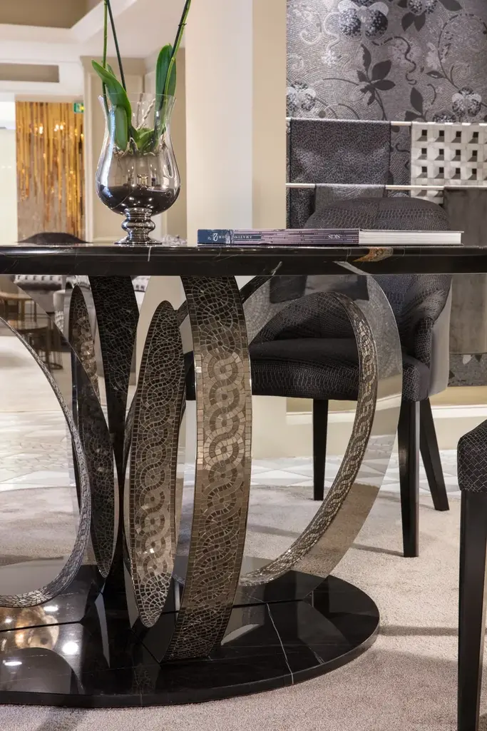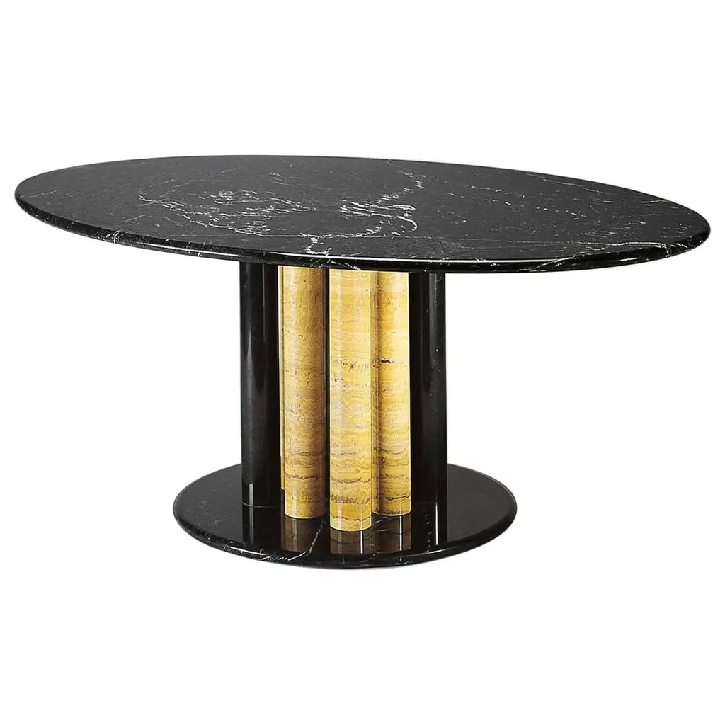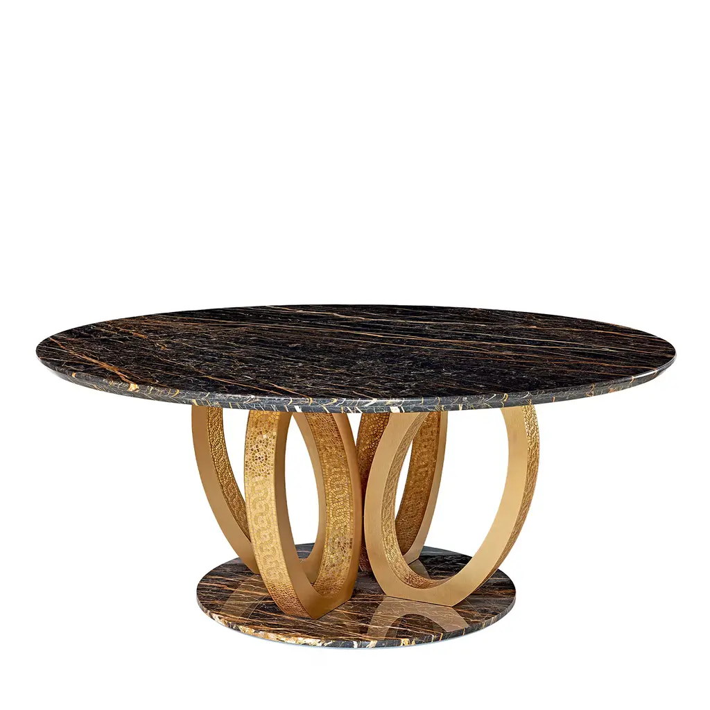 Soft and elegant Art Deco lines. A sinuous play of full and empty spaces, and a refined play of proportions. Pure materials and special processes. Fluxus is a table that recalls the idea of movement, fluid and enveloping.Top and base in marble.