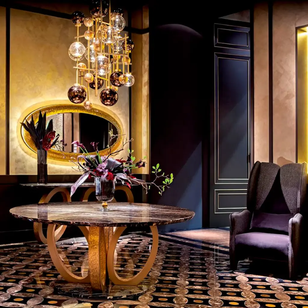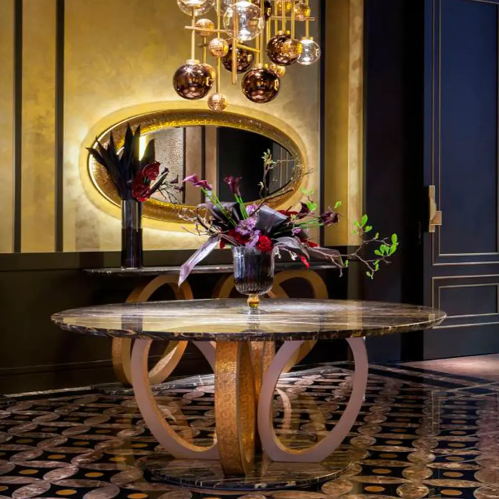 Soft and elegant Art Deco lines. A sinuous play of full and empty spaces, and a refined play of proportions. Pure materials and special processes. A table that recalls the idea of movement, fluid and enveloping.