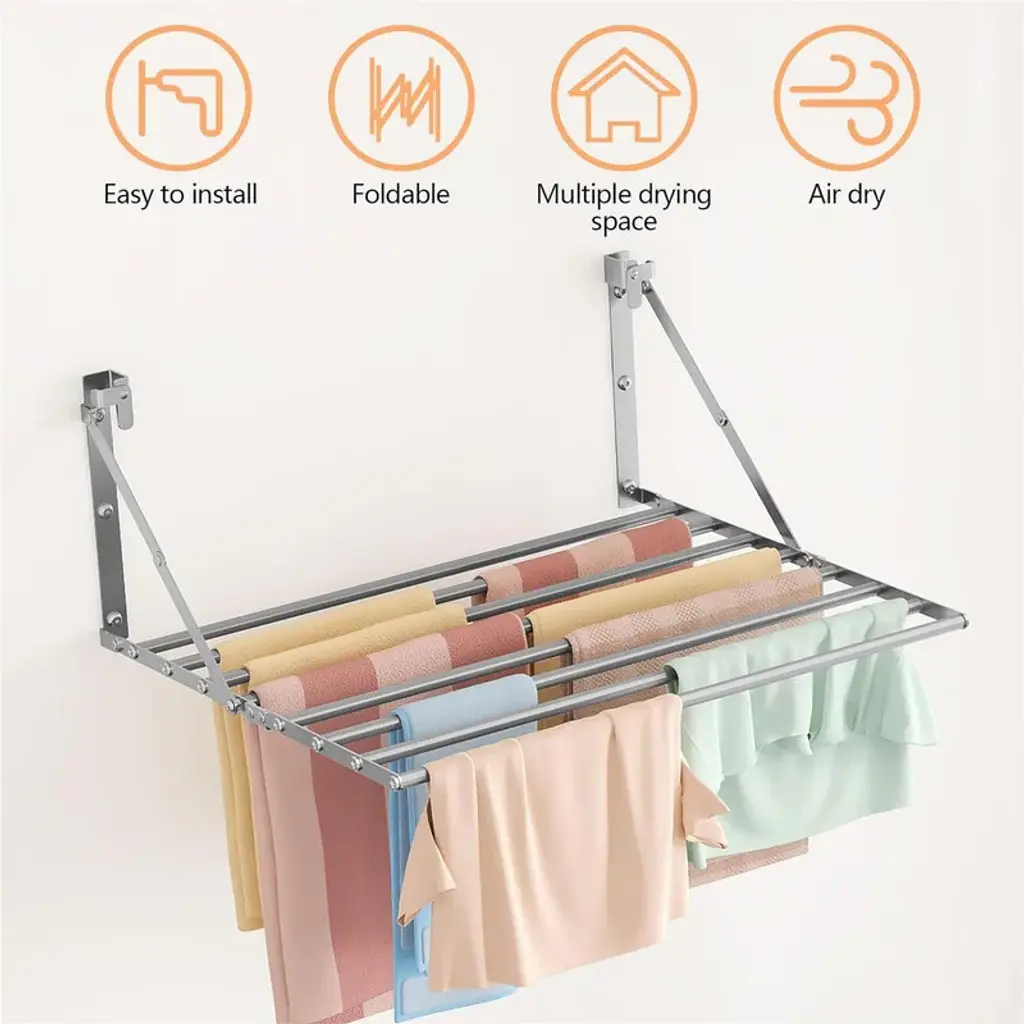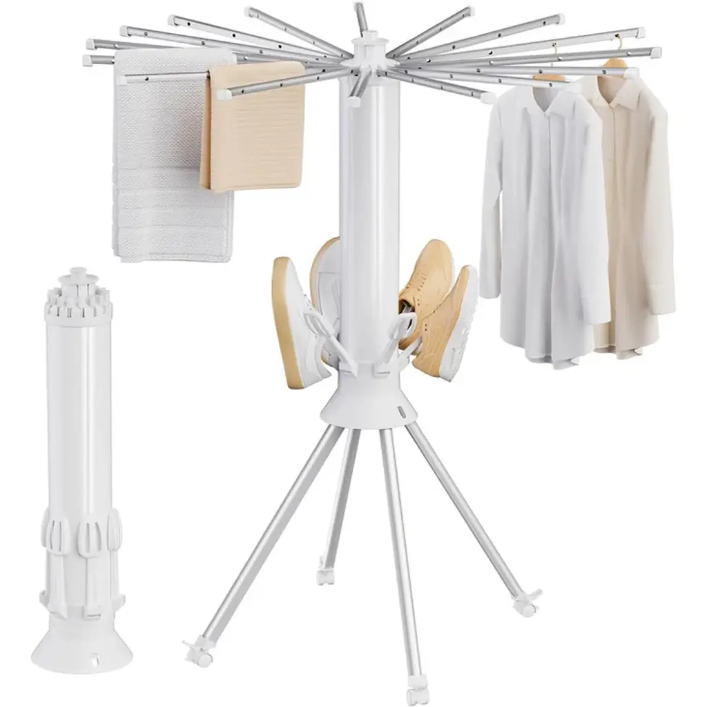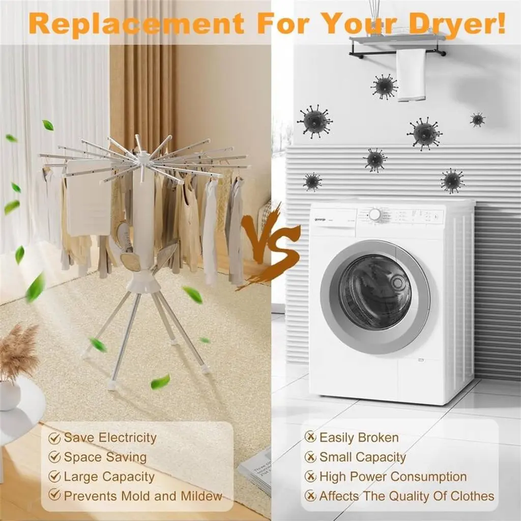 1. **Ideal Dryer Replacement**: This collapsible laundry drying rack offers a practical solution for drying clothes while saving energy and avoiding the heat generated by dryers. 2. **Extra Large Drying Space**: With 16 aluminum drying rods, it can hold up to 88.18 lbs of laundry, accommodating various garments and linens effortlessly. 3. **Windproof Design**: Equipped with movable wheels and a foot brake system, this rack stays securely in place during use, ensuring stability in windy conditions. 4. **Versatile Drying Options**: The included shoe drying racks allow for multi-functional drying, making it suitable for laundry rooms, balconies, and camping trips. 5. **Flexible Setup**: The adjustable drying rods and anti-slip holes ensure your clothes stay securely hung, while the collapsible design makes storage easy.