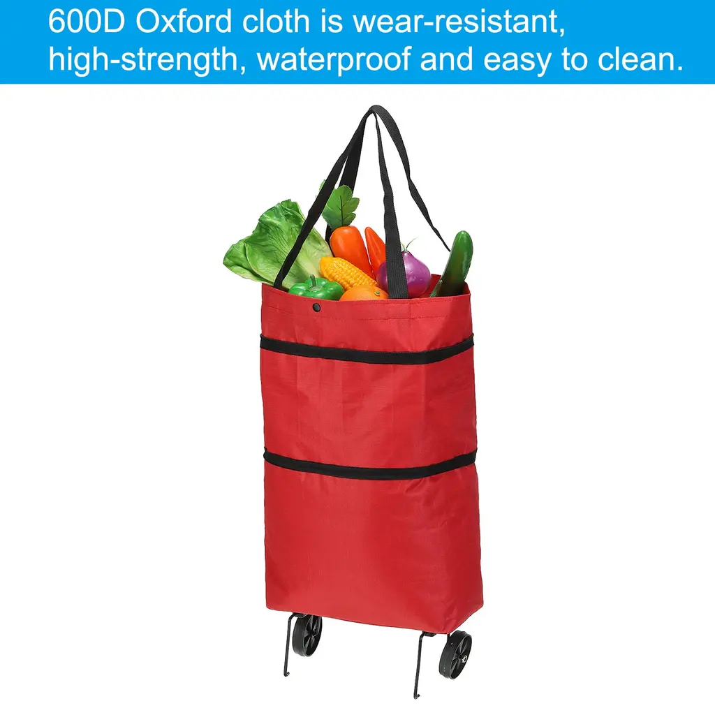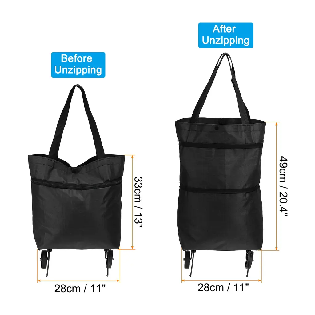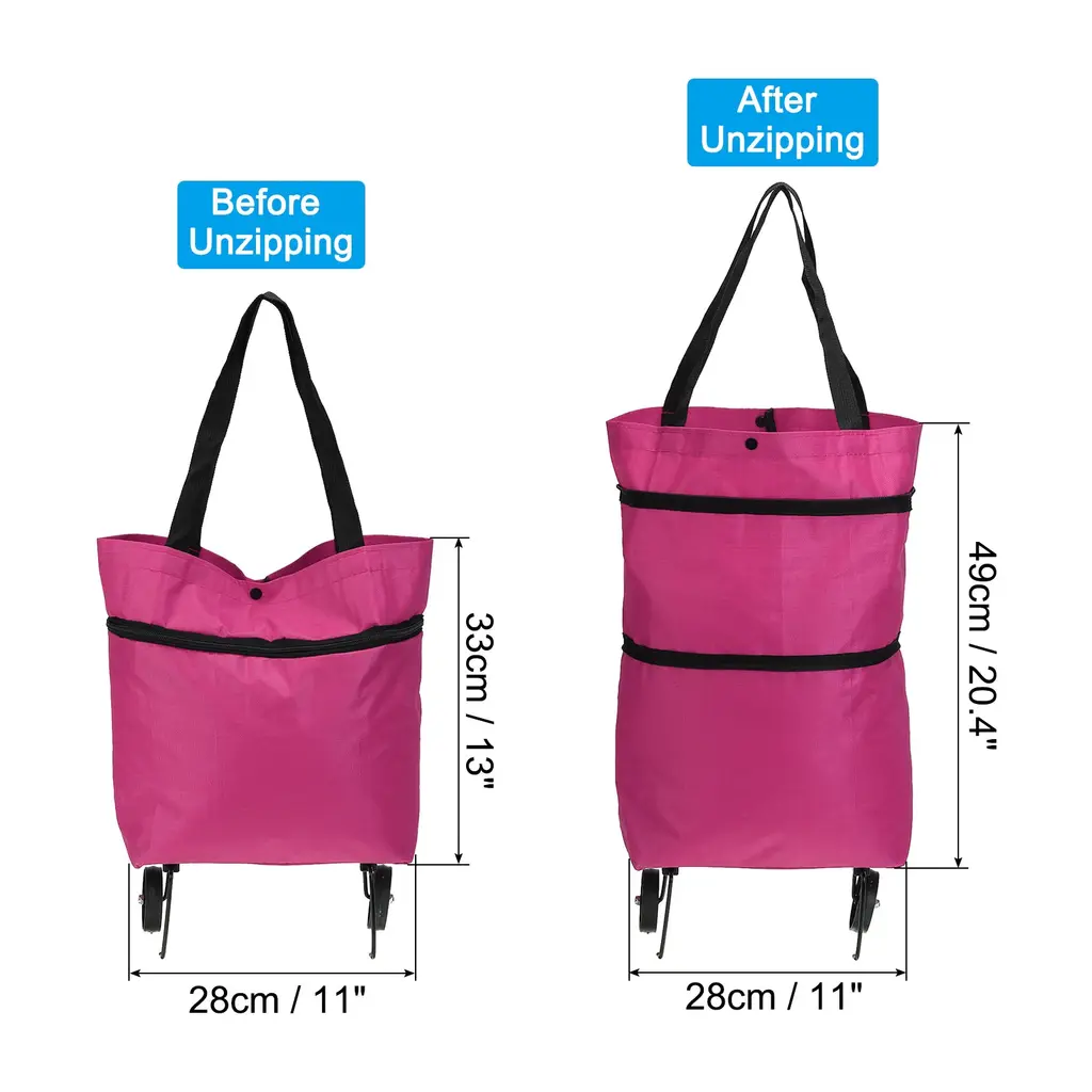 The foldable trolley bag is suitable for outdoor purposes such as hiking, shopping, picnics, camping, barbecues, playing at the beach, vacations, business trips, etc. It can also be used at home to store vegetables and fruits or to store a change of clothes.SpecificationColor: PinkMaterial: 600D Oxford Cloth, PP WheelDimensions Before Opening: 33 x 28 cm / 13 x 11 inch (H*W)Dimensions After Unfolded: 49 x 28 cm / 20.4 x 11 inch (H*W)Wheel Size: 53 x 14 mm / 2.1 x 0.6 inch (L*W)Packing List: 1Pcs x Folding Shopping Bag with WheelsAdvantage1. The wheeled shopping bag is made of double-layer 600D Oxford cloth, which is waterproof, anti-rot, tough and tear-resistant, and durable. There is a wide cardboard at the bottom, which is strong in load-bearing capacity.2. The shopping trolley bag provides large capacity space to accommodate a large number of items, and has foldable wheels, making shopping easy and effortless.3. When the zipper is closed, it can be folded and used as a shoulder bag, which is highly practical.Instruction1. When shopping, put down the bottom wheels and open the zipper to turn it into a large-capacity trolley bag.2. When carrying light items, you can fold up the wheels and zip them up to turn them into a tote bag.3. Can be folded during storage to save space.NOTE: Please confirm the size is correct before placing an order.