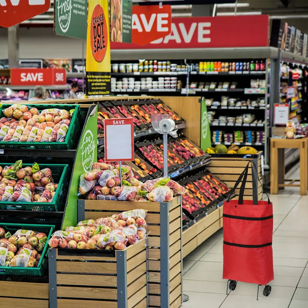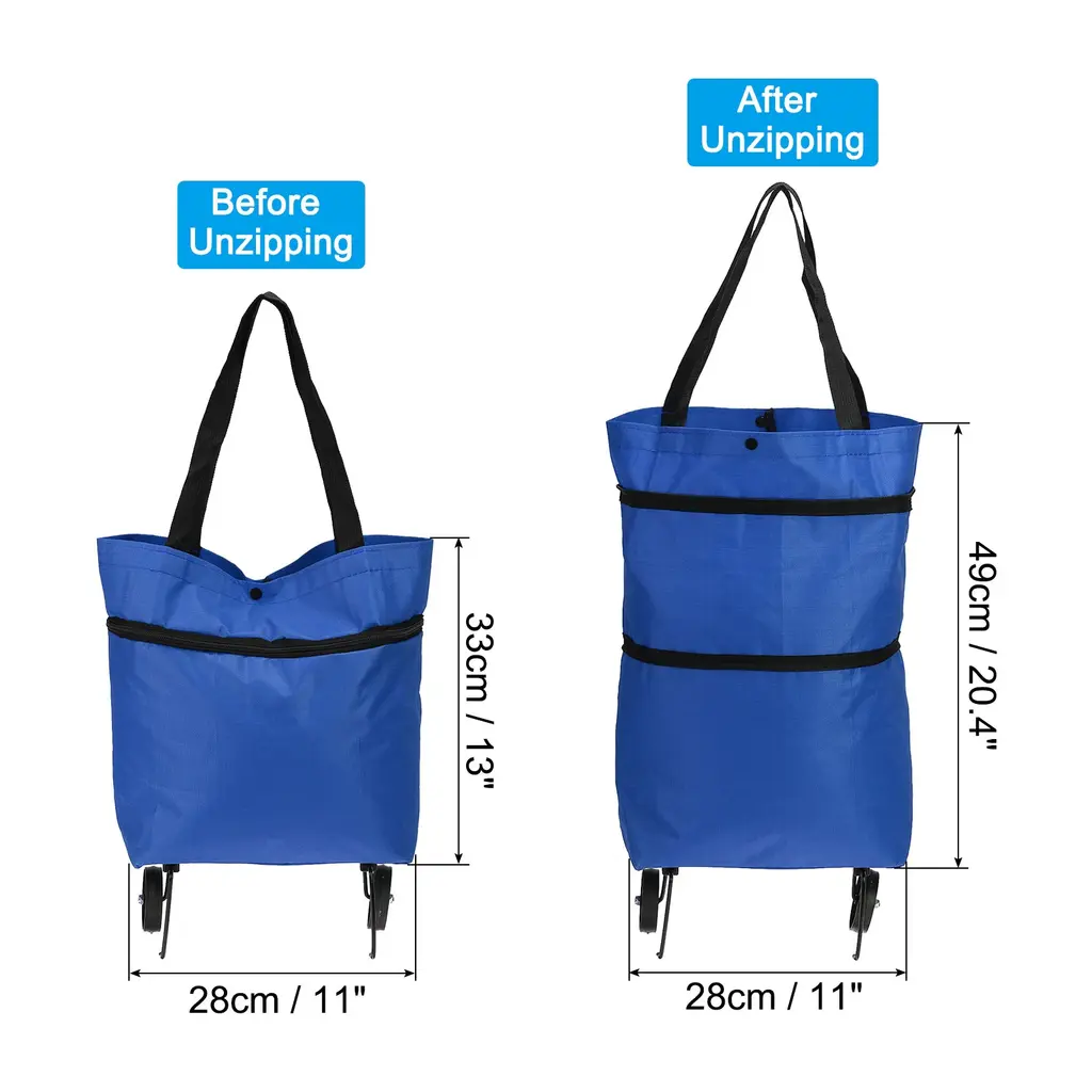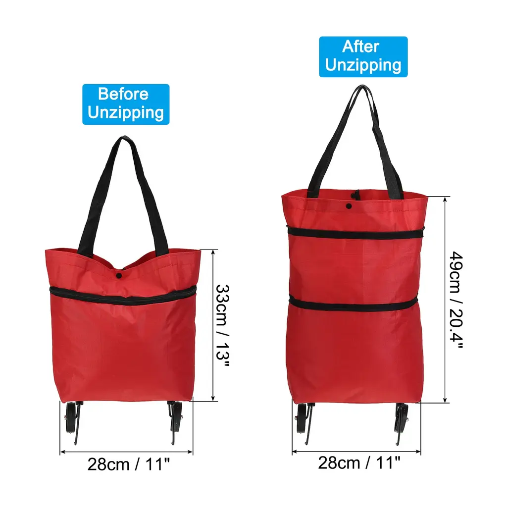 The foldable trolley bag is suitable for outdoor purposes such as hiking, shopping, picnics, camping, barbecues, playing at the beach, vacations, business trips, etc. It can also be used at home to store vegetables and fruits or to store a change of clothes.SpecificationColor: PinkMaterial: 600D Oxford Cloth, PP WheelDimensions Before Opening: 33 x 28 cm / 13 x 11 inch (H*W)Dimensions After Unfolded: 49 x 28 cm / 20.4 x 11 inch (H*W)Wheel Size: 53 x 14 mm / 2.1 x 0.6 inch (L*W)Packing List: 1Pcs x Folding Shopping Bag with WheelsAdvantage1. The wheeled shopping bag is made of double-layer 600D Oxford cloth, which is waterproof, anti-rot, tough and tear-resistant, and durable. There is a wide cardboard at the bottom, which is strong in load-bearing capacity.2. The shopping trolley bag provides large capacity space to accommodate a large number of items, and has foldable wheels, making shopping easy and effortless.3. When the zipper is closed, it can be folded and used as a shoulder bag, which is highly practical.Instruction1. When shopping, put down the bottom wheels and open the zipper to turn it into a large-capacity trolley bag.2. When carrying light items, you can fold up the wheels and zip them up to turn them into a tote bag.3. Can be folded during storage to save space.NOTE: Please confirm the size is correct before placing an order.