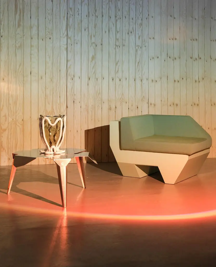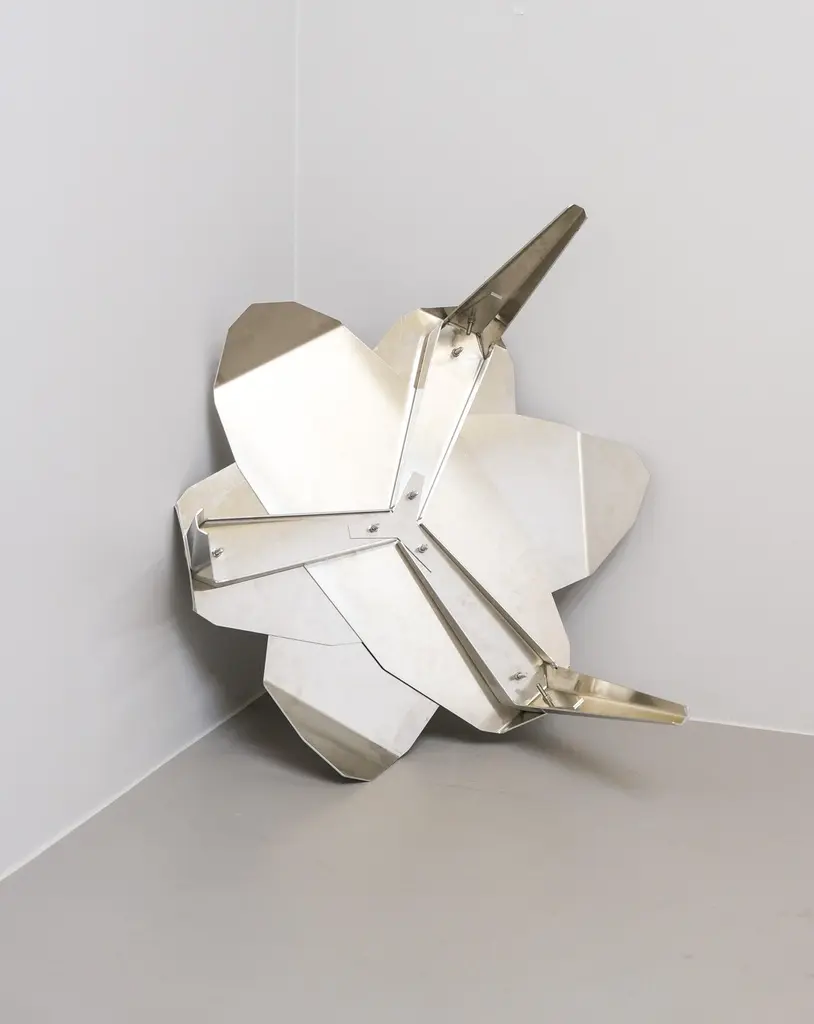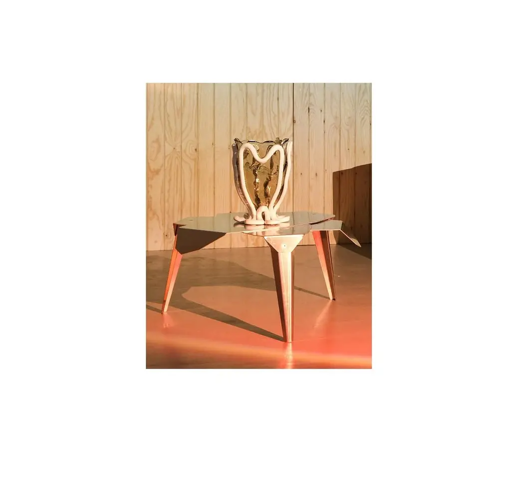 Folded Leaf Table in Laser-Cut, Bent & Folded Stainless Steel by Jacob EgebergDimensions: Ø 95 x H 53 cm.Materials: Laser-cut, bent, and folded stainless steel.The folded leaf table is a peculiar flower; The delicacy of nature, yet therawness of something only industrial machines can create. Created byhand, but has the nature of a machine. It is the perfect sofa table for yourlounge space, and the aluminum version will even keep you company with its many reflections.STUDIO JACOB EGEBERG is a Copenhagen-based designer who completed his Master of Arts at The Royal Danish Academy in 2020. Egeberg has received international attention for his vibrant work and his unconventional take on domestic interior and retail design. Through his unique and often colorful approach to industrial techniques and materials, he produces functional objects as a means of storytelling and challenges boundaries within the field of contemporary design.